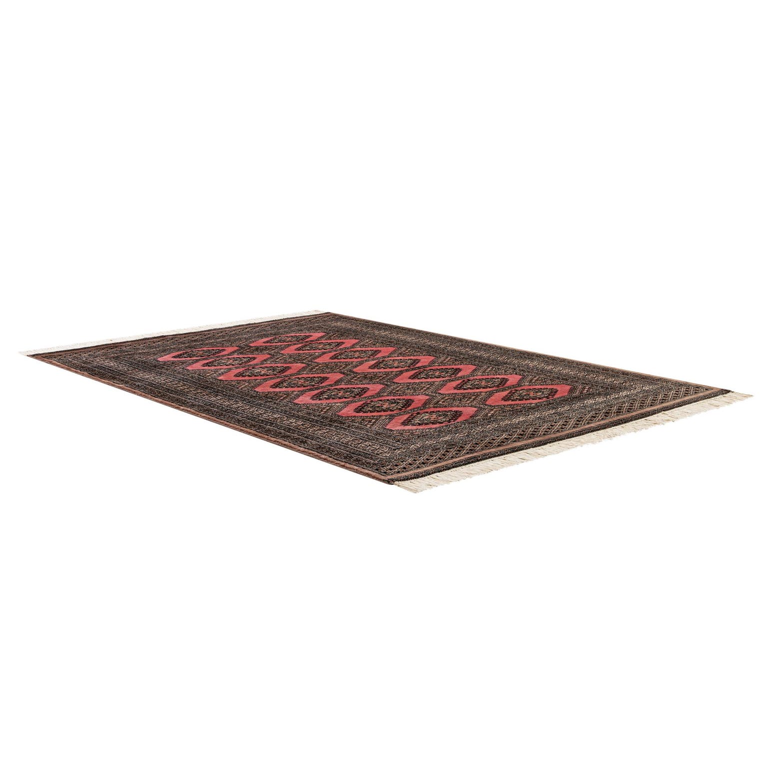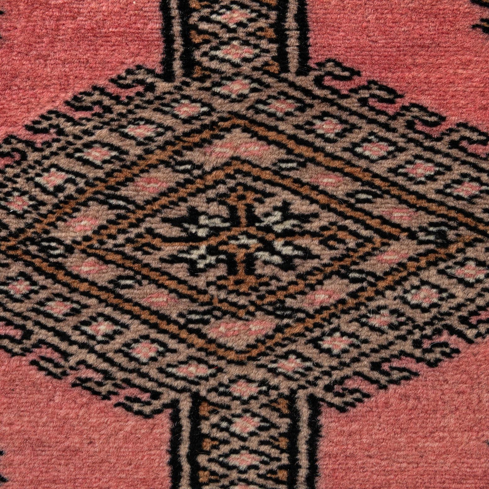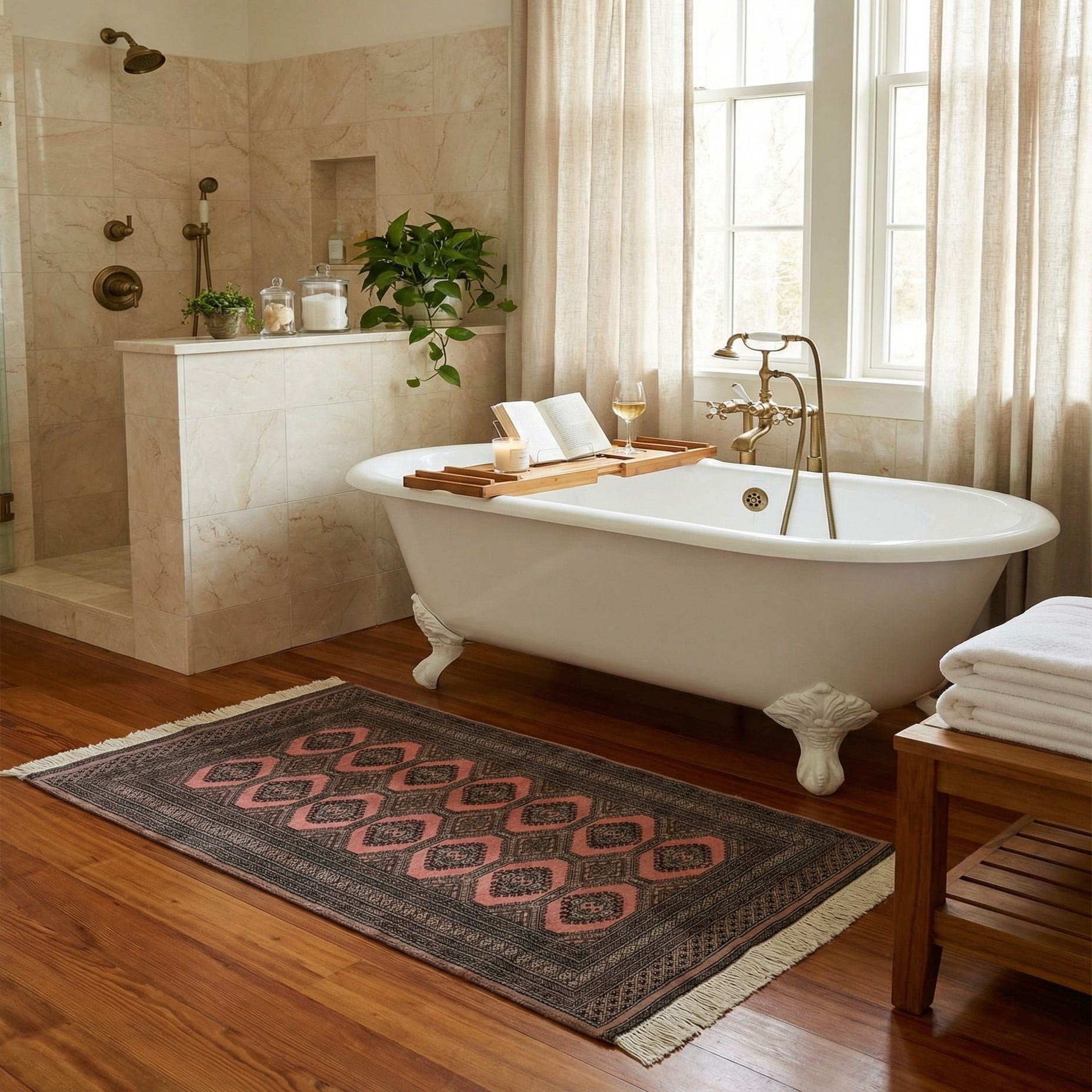 A 4x6 rectangular pink and black tribal Bokhara wool rug with traditional patterns and fringe.