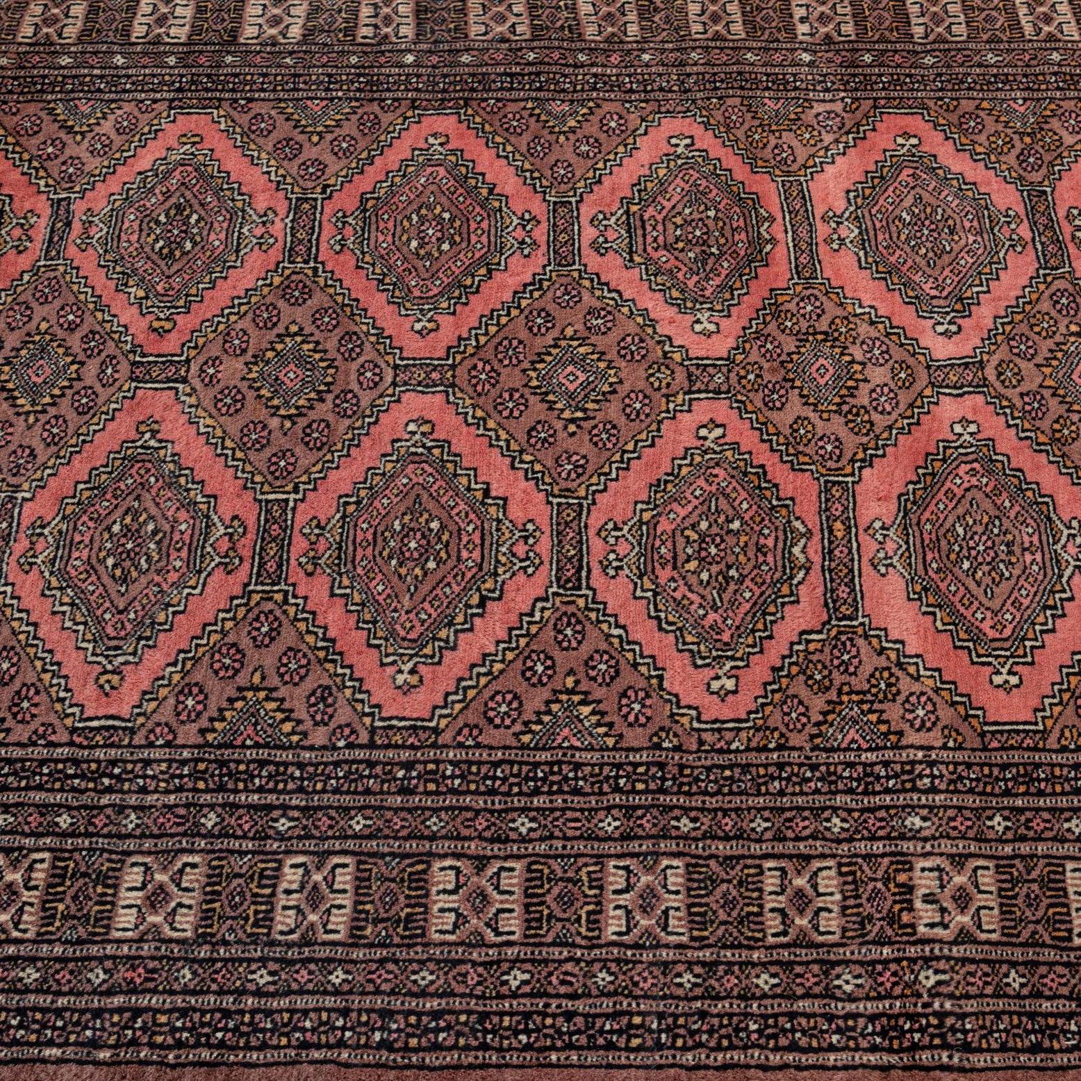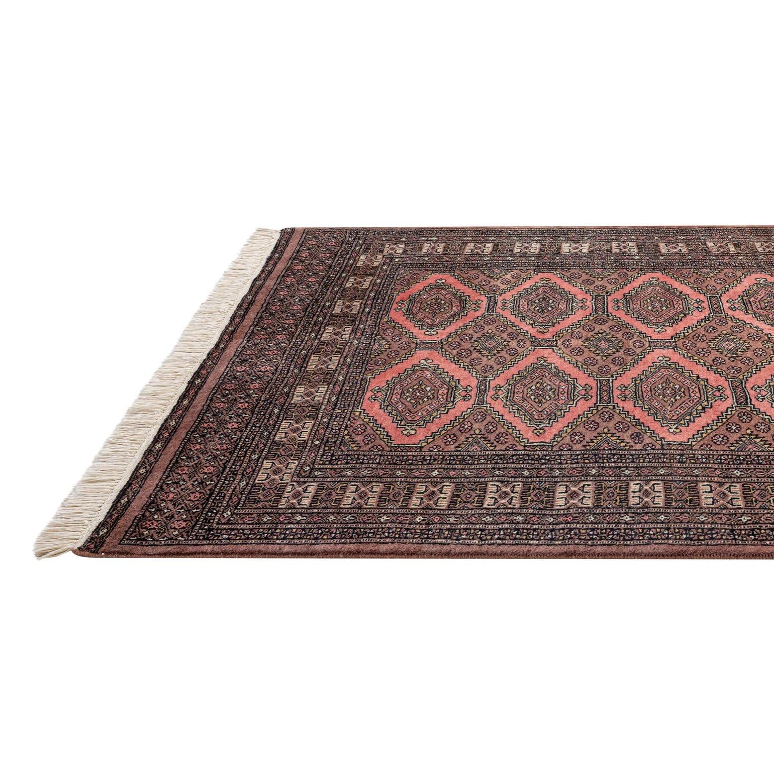A 4x6 rectangular Bokhara rug featuring a traditional tribal pattern in shades of pink and brown, with white fringe.