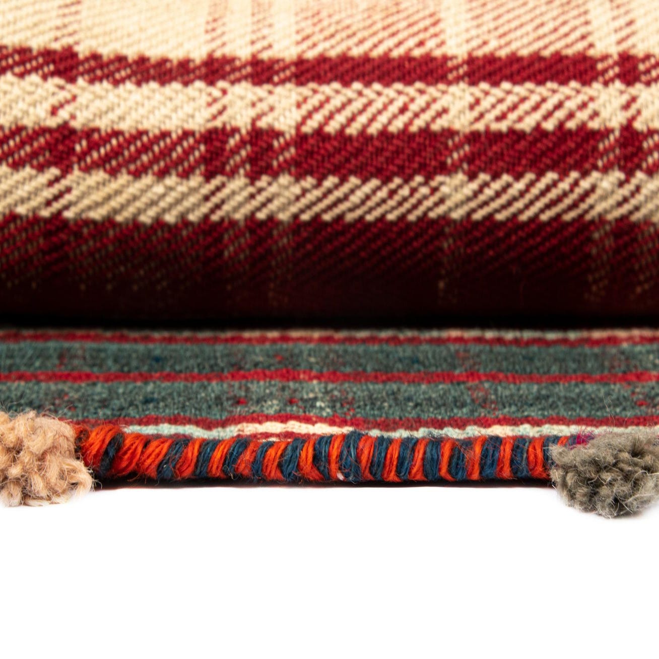 This Jajim collection rug is a handcrafted 4x6 piece, woven from 100% wool to offer both durability and a soft underfoot feel. The rug showcases a distinctly traditional plaid pattern, featuring a pink background with intersecting lines in contrasting shades. The design incorporates a range of colors providing a warm and inviting palette that can effortlessly blend into various interior styles.