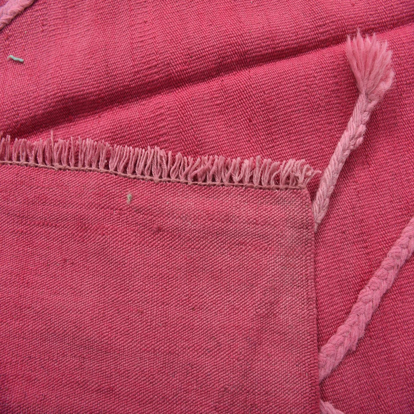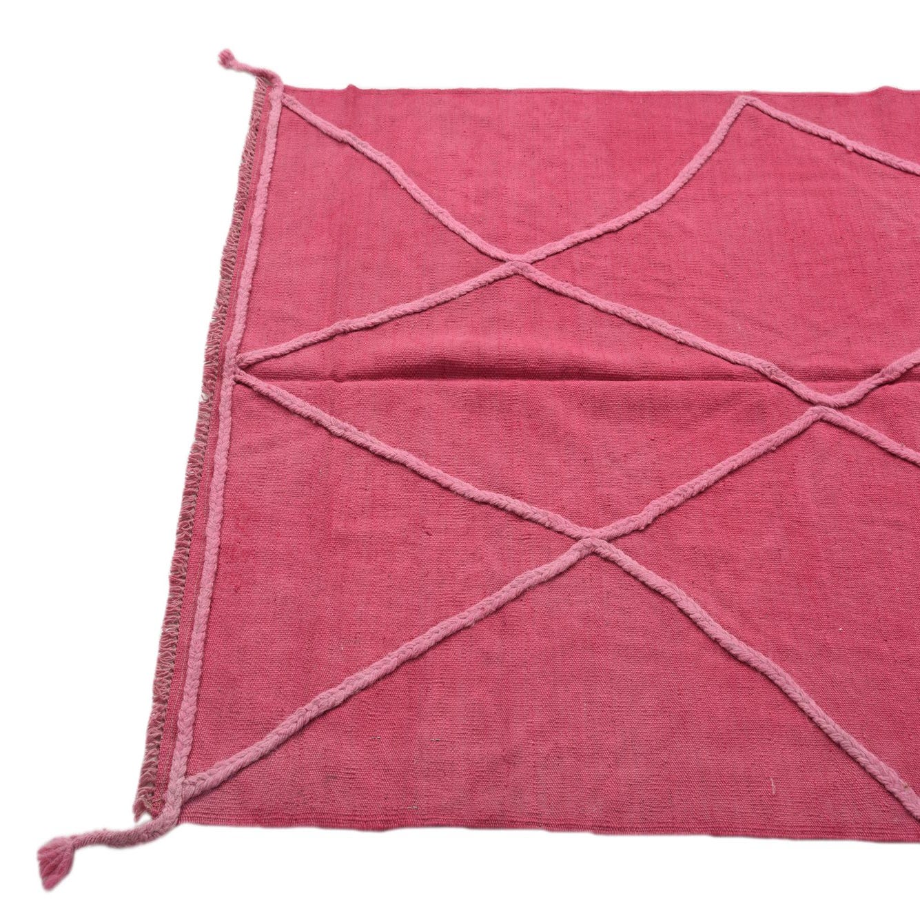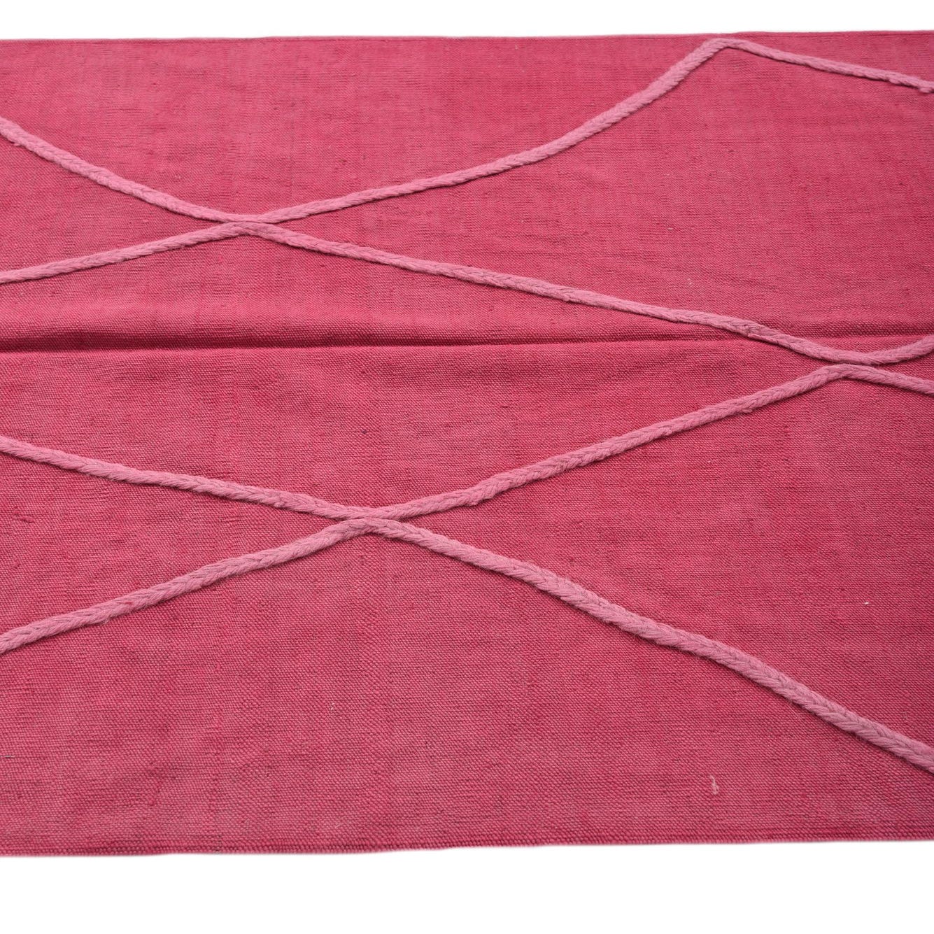 Hand?woven from 100% wool, this Kilim Modern–inspired piece presents a vivid pink field softened by subtle tonal variations. A raised, lighter?pink braided line traces an open diamond lattice across the surface, creating a rhythmic geometric pattern that lifts visually and tactilely from the flat weave. Short fringes and knotted tassels finish the ends, while the wool pile offers a dense, soft hand with a low to medium profile and a slightly sculpted texture where the braided lines run.