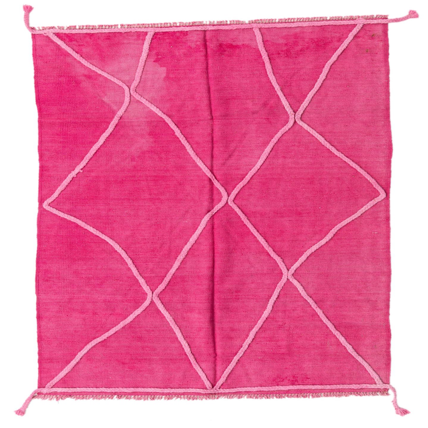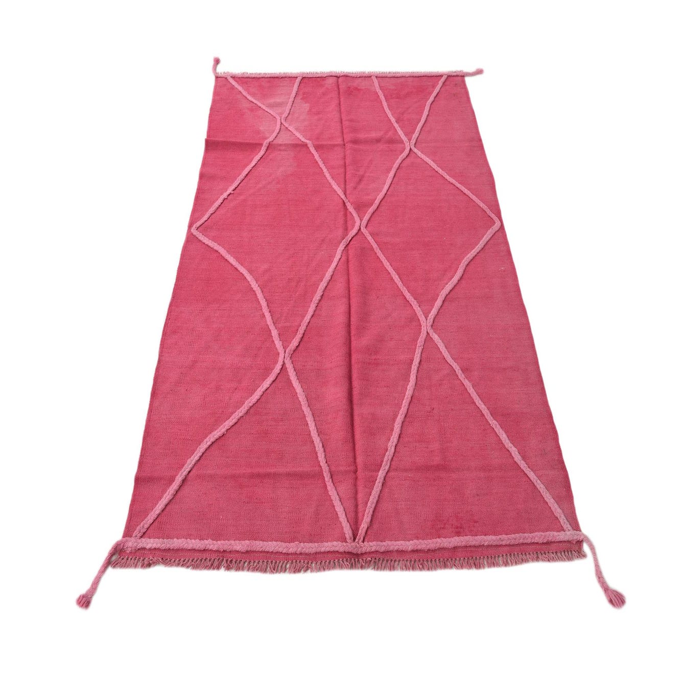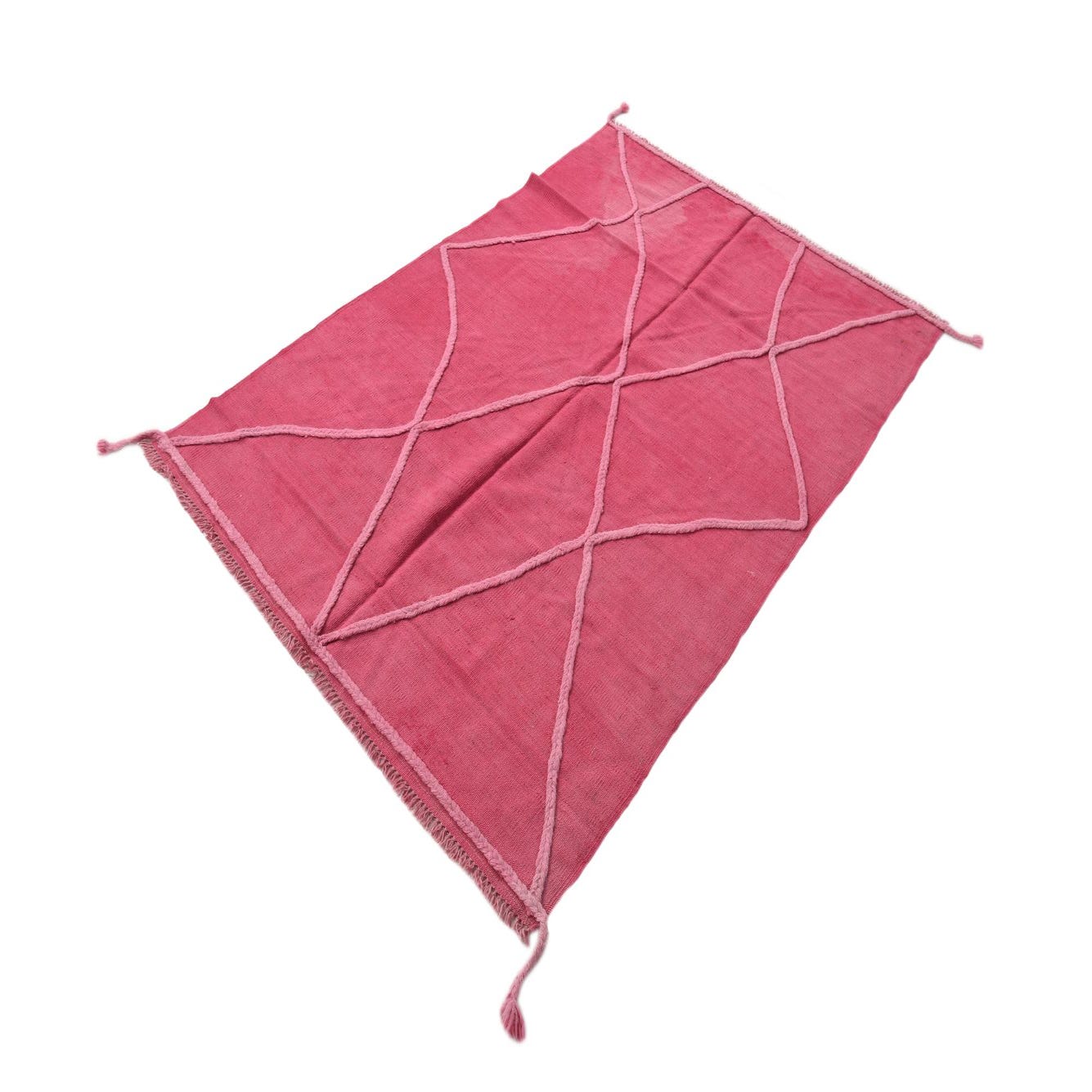 Hand?woven from 100% wool, this Kilim Modern–inspired piece presents a vivid pink field softened by subtle tonal variations. A raised, lighter?pink braided line traces an open diamond lattice across the surface, creating a rhythmic geometric pattern that lifts visually and tactilely from the flat weave. Short fringes and knotted tassels finish the ends, while the wool pile offers a dense, soft hand with a low to medium profile and a slightly sculpted texture where the braided lines run.