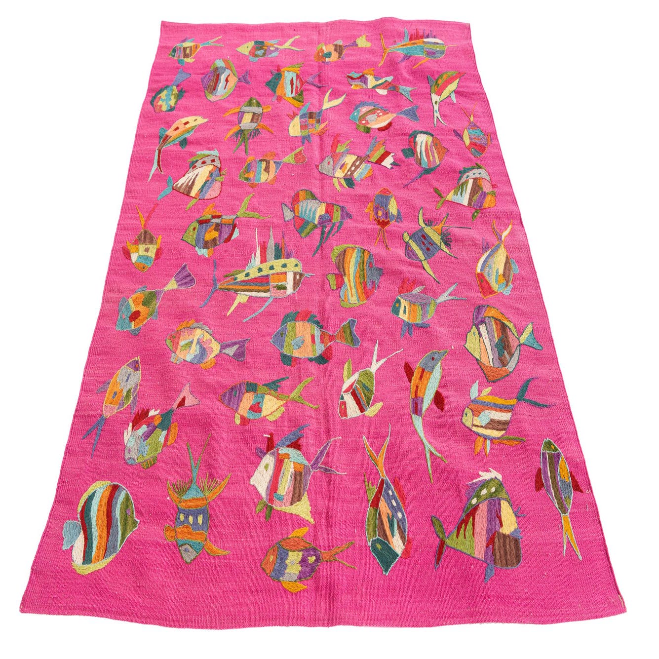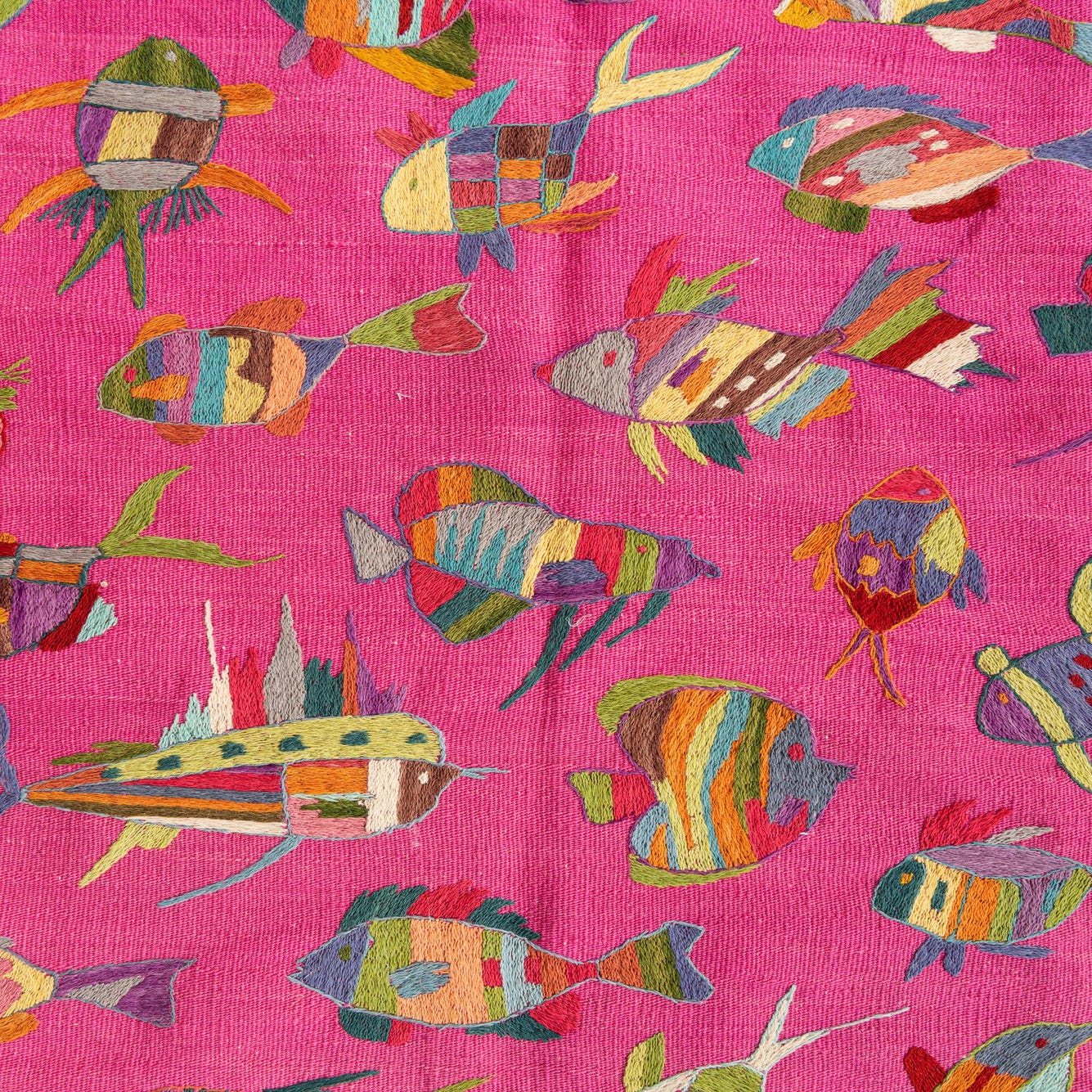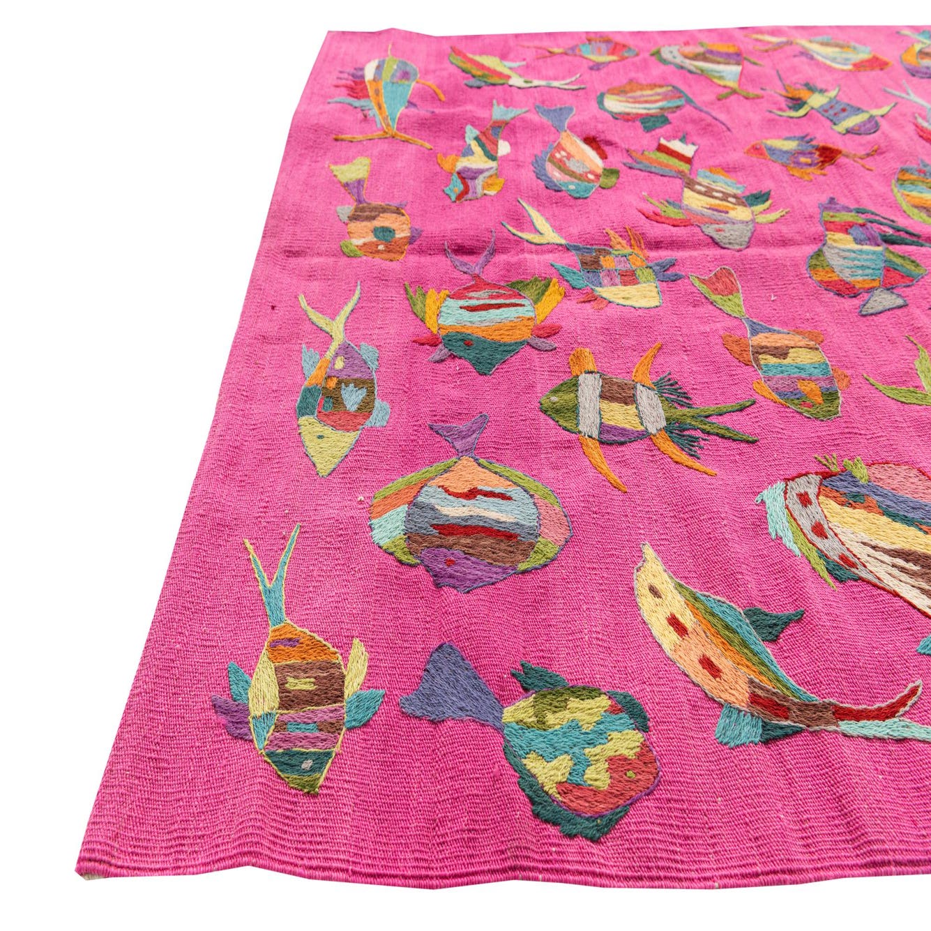 A vibrant 4x6 pink flatweave wool rug featuring numerous colorful embroidered fish in various shapes and sizes, perfect for a playful room.