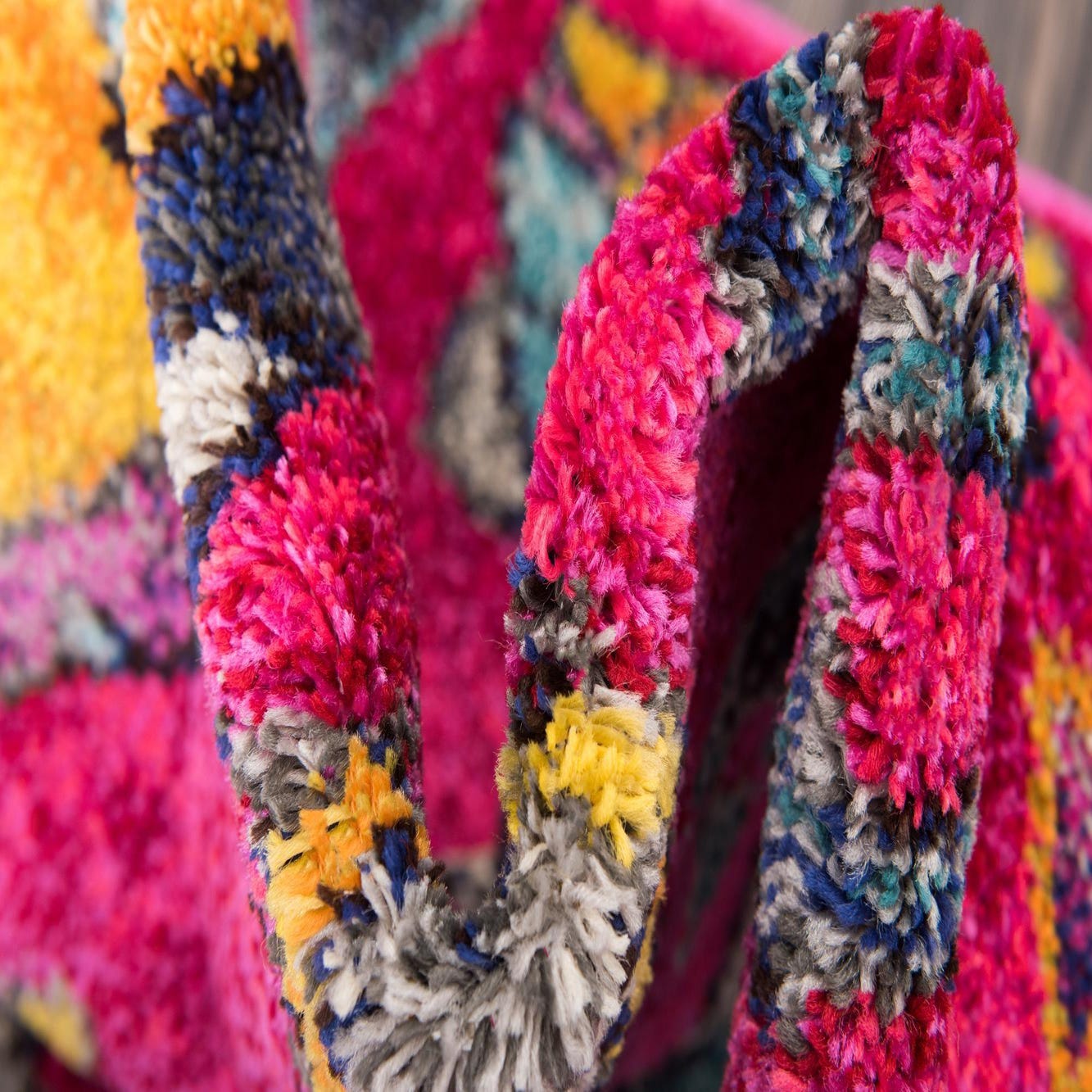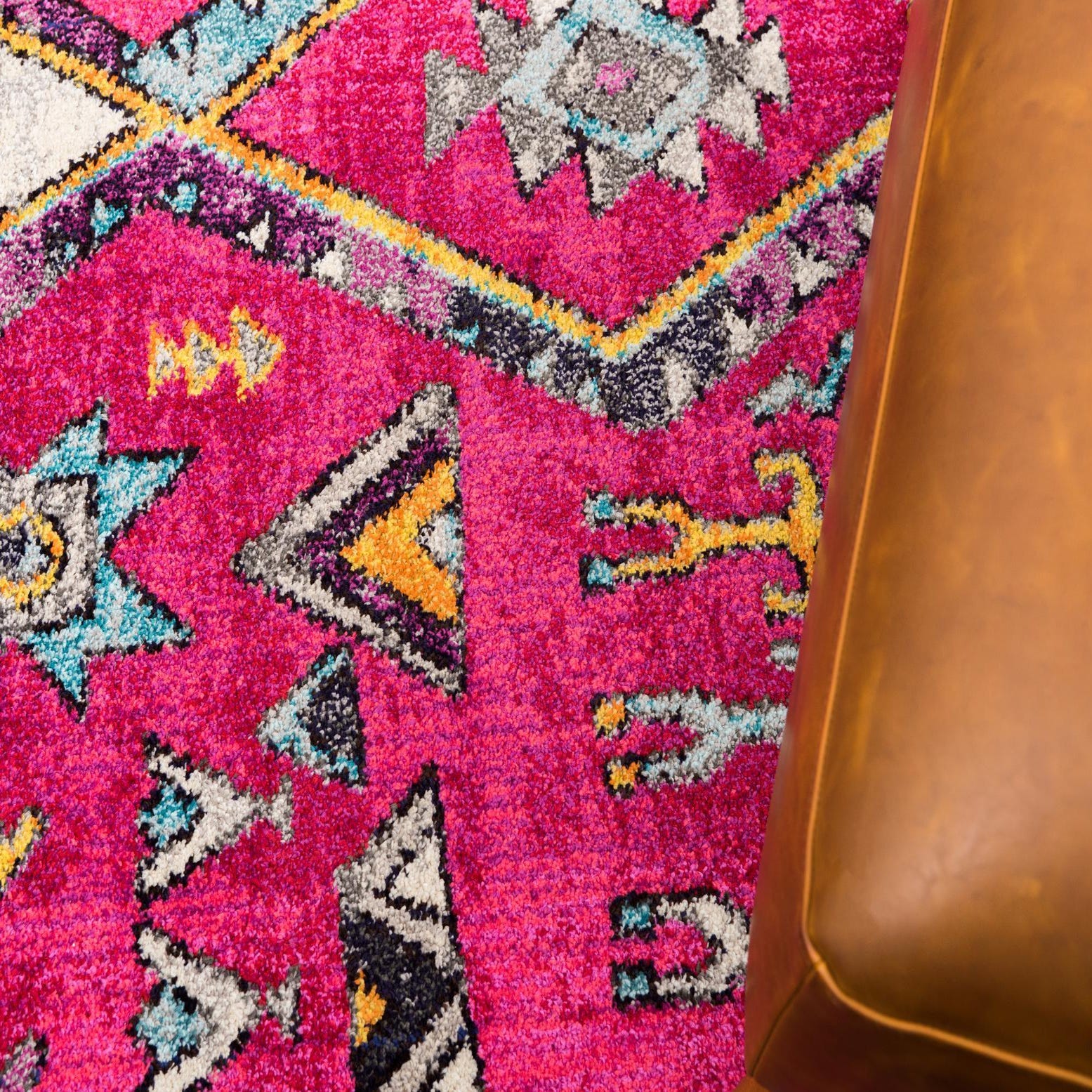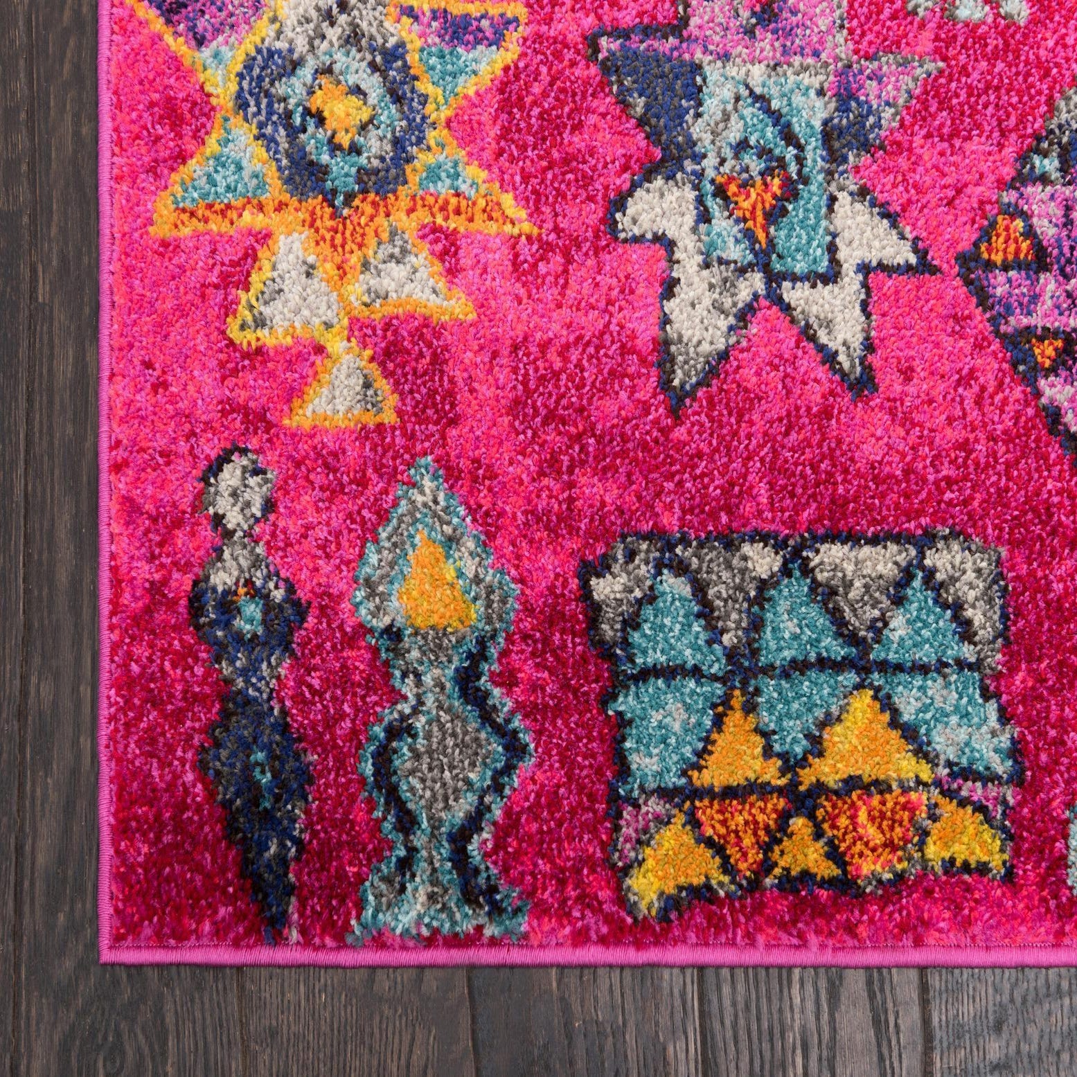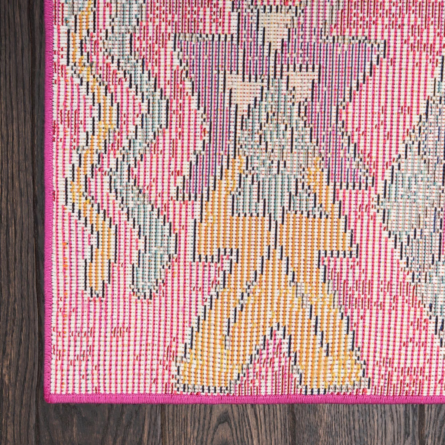 Primary color is Pink. Colors in this rug include: Pink, Black, Blue, Burgundy, Gray, Ivory, Orange, Turquoise, Yellow, Violet.