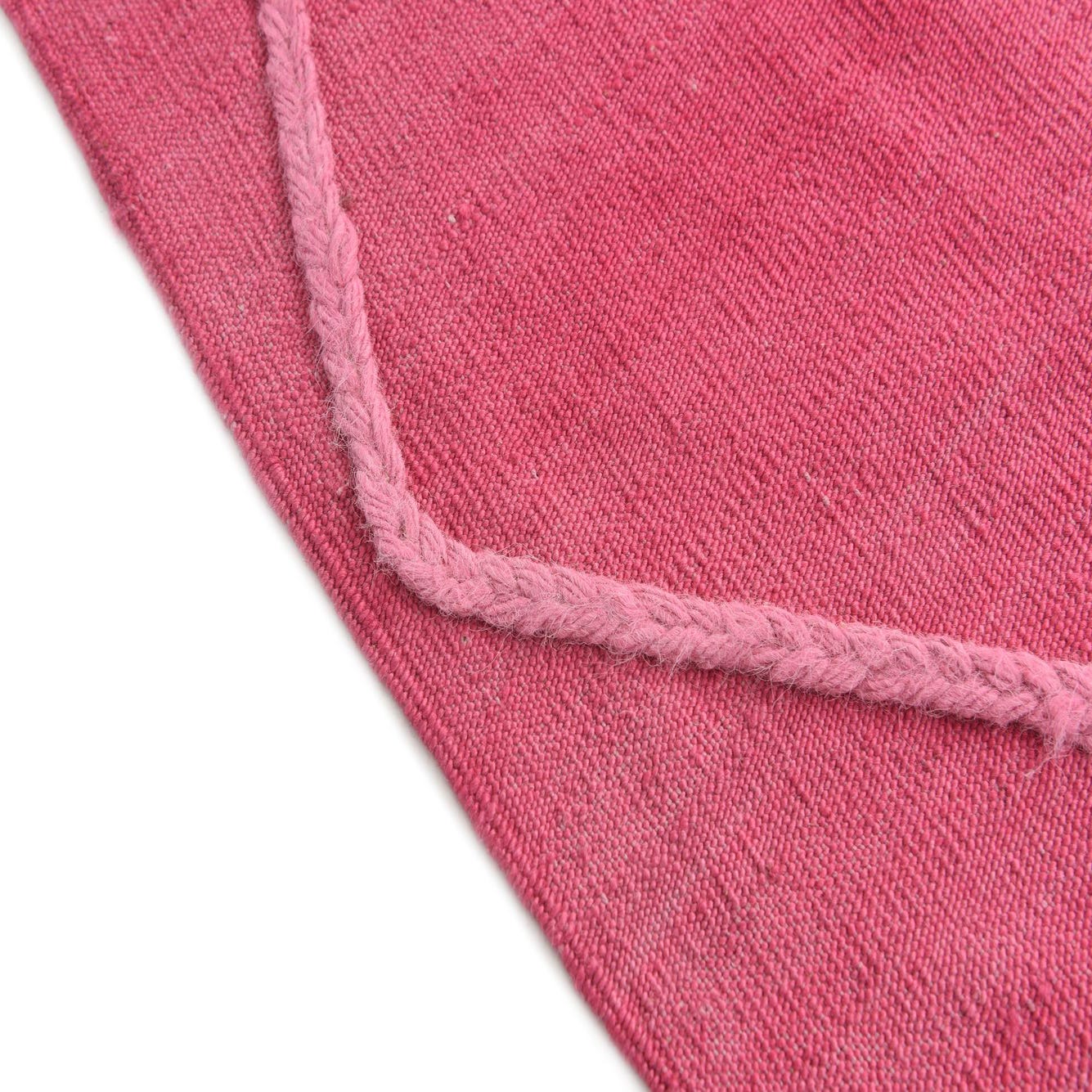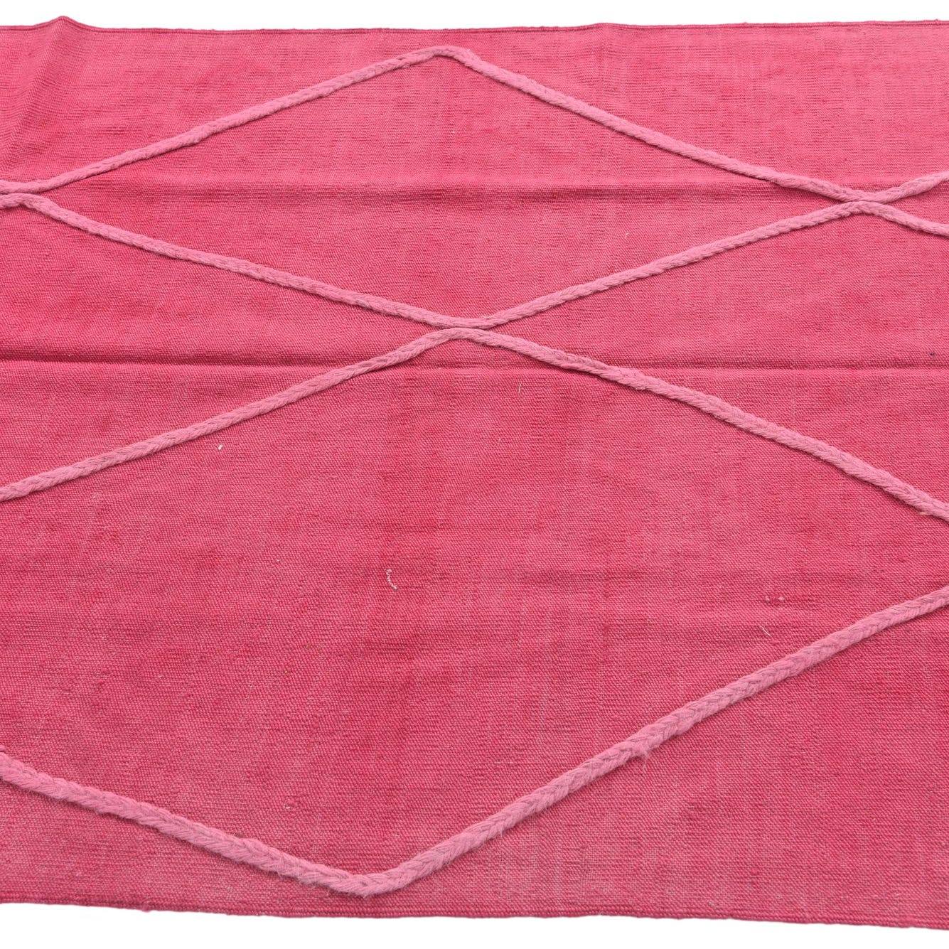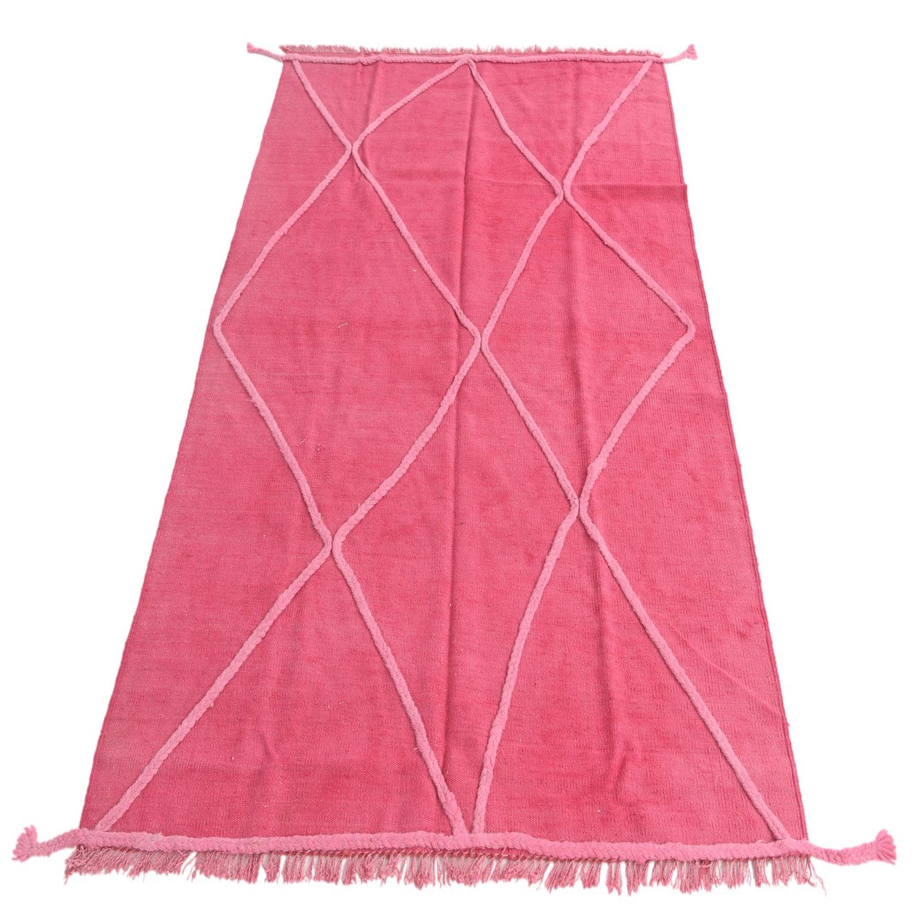 A 4x6 rectangular pink shag rug with a lighter pink tribal diamond pattern and fringe tassels.