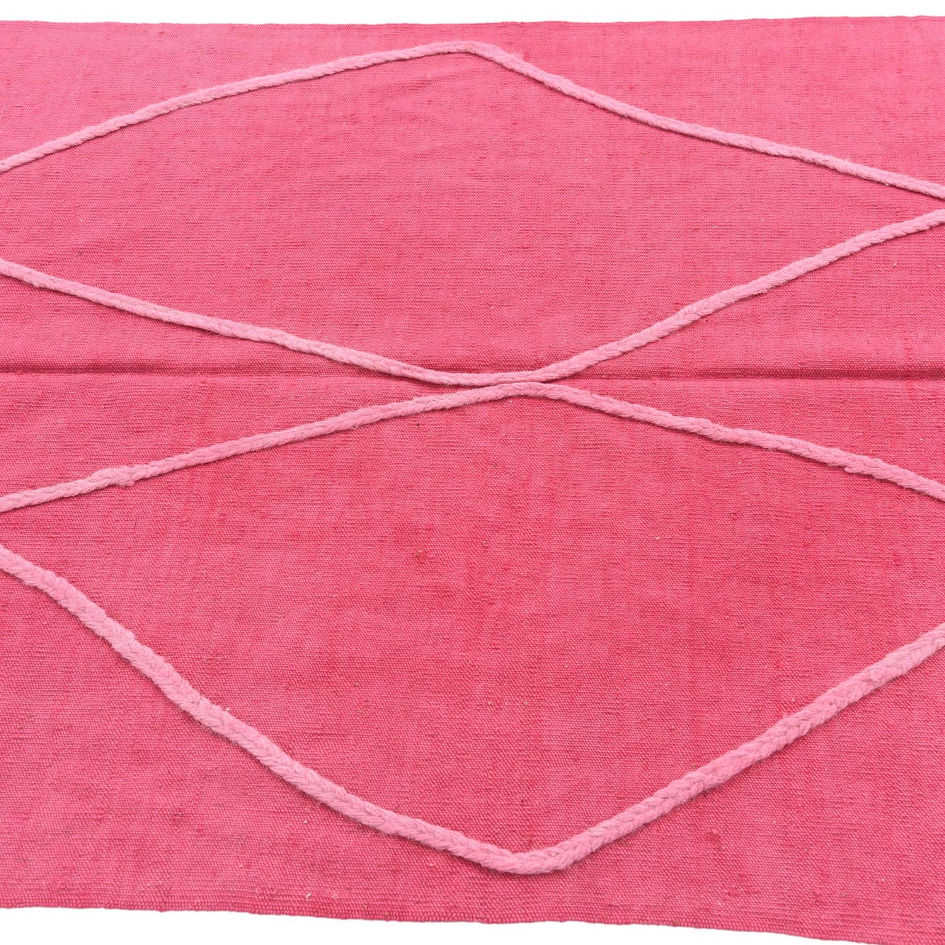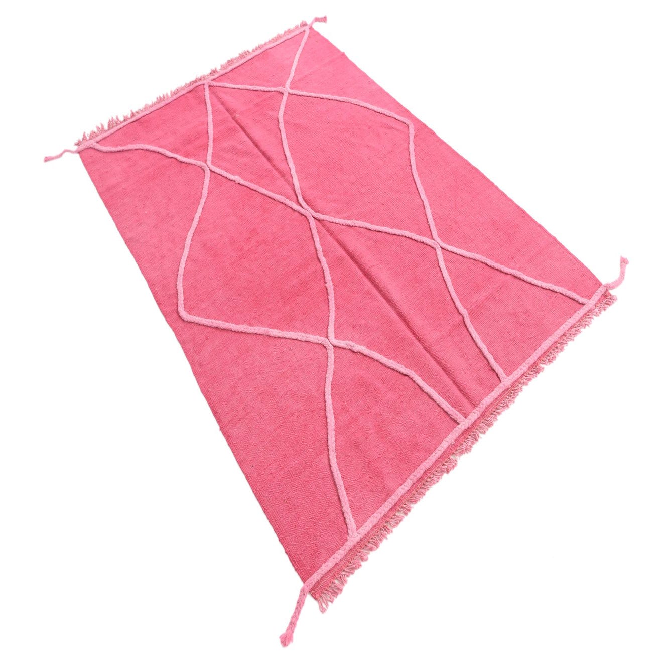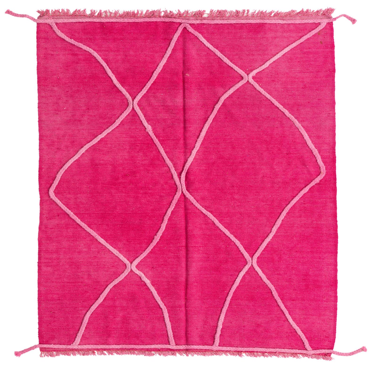 A 4x6 rectangular pink shag rug with a lighter pink tribal diamond pattern, handmade from 100% wool.