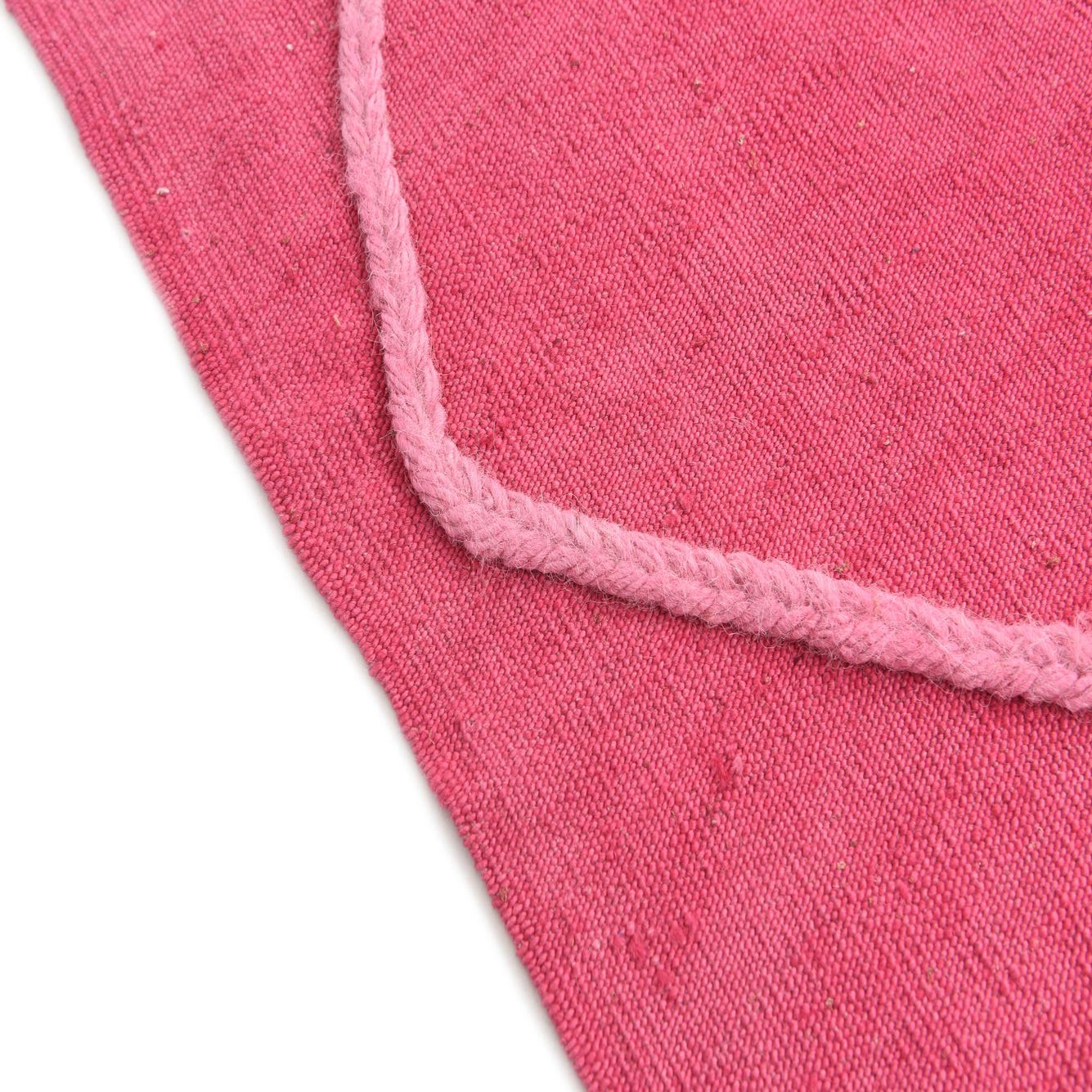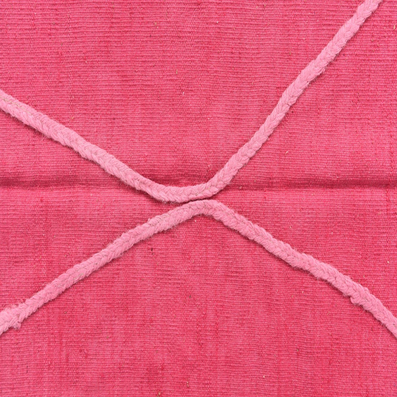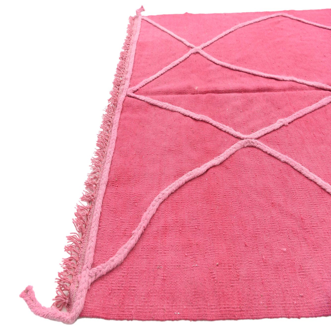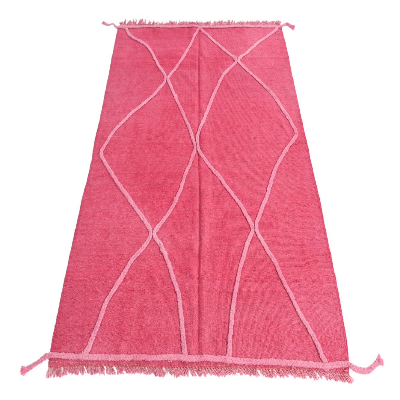 A 4x6 rectangular pink shag rug with a lighter pink tribal diamond pattern, handmade from 100% wool.
