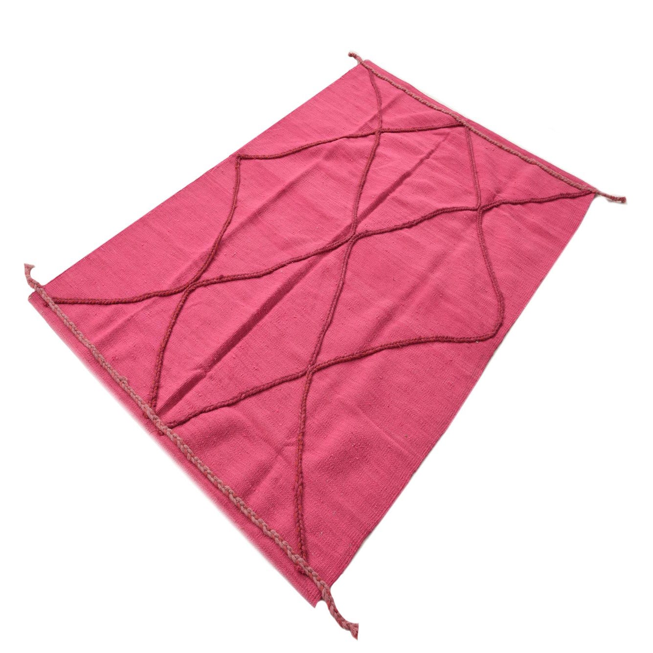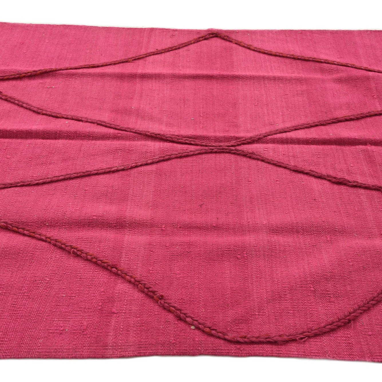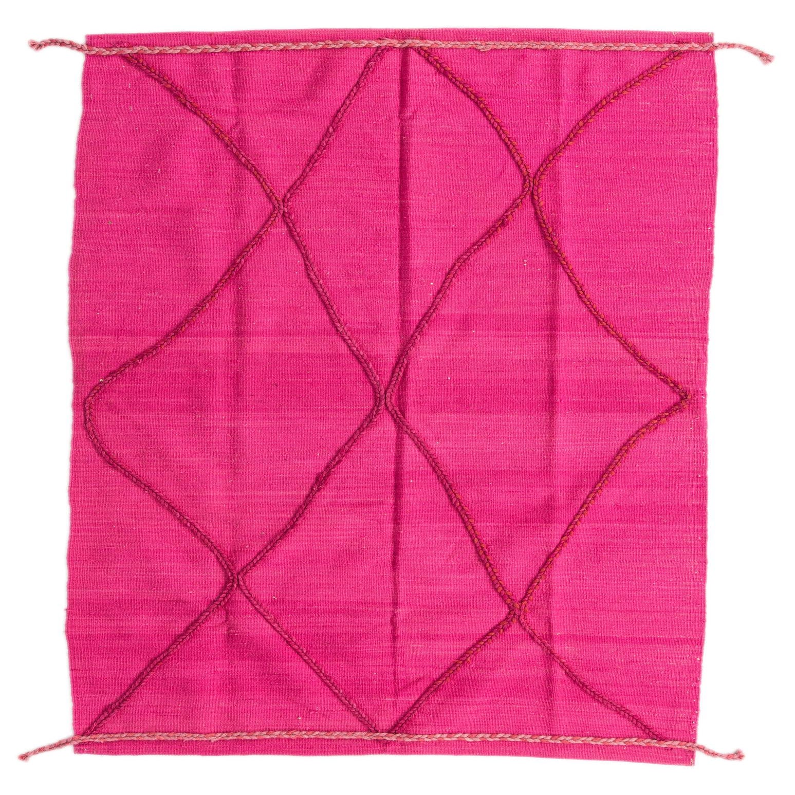 A 4x6 rectangular hot pink wool shag rug with a dark pink tribal diamond pattern, handmade.