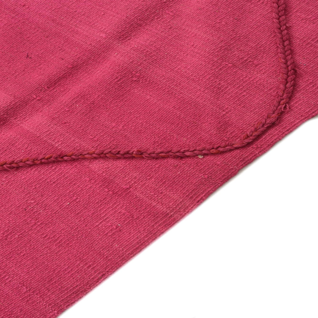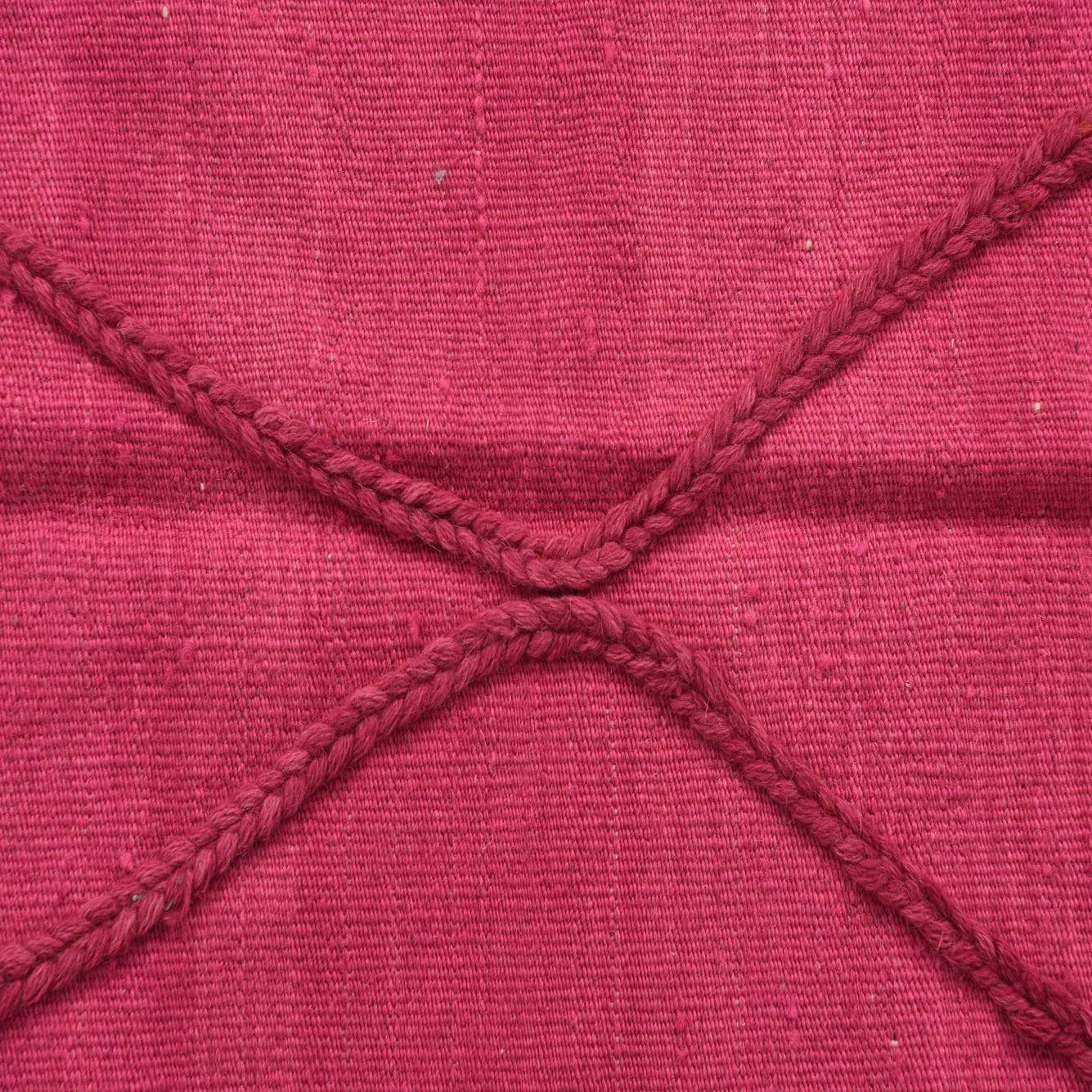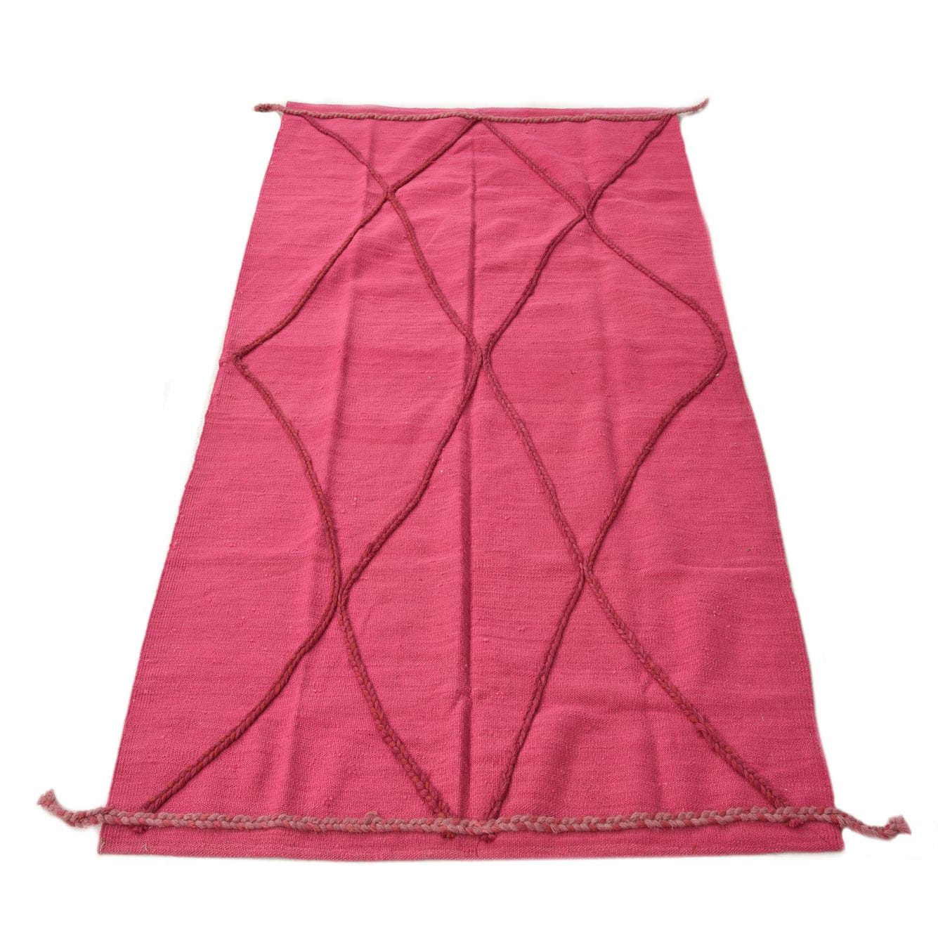 A 4x6 rectangular hot pink wool shag rug with a dark pink tribal diamond pattern, handmade.