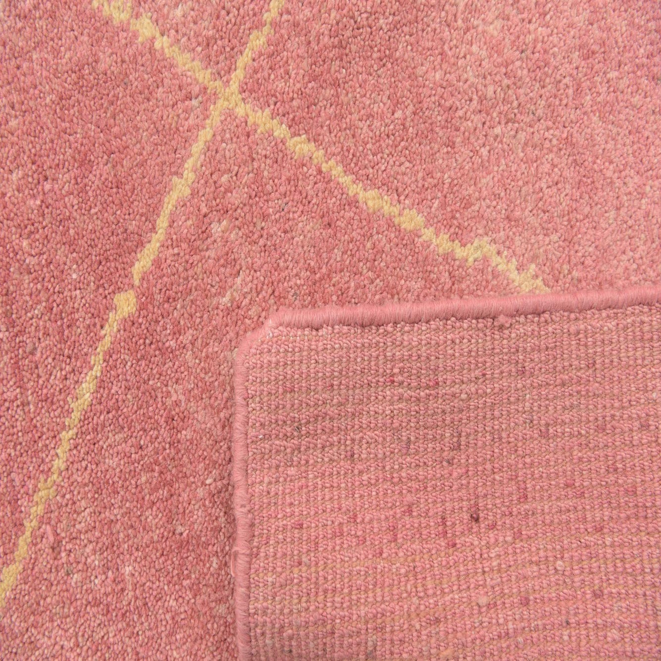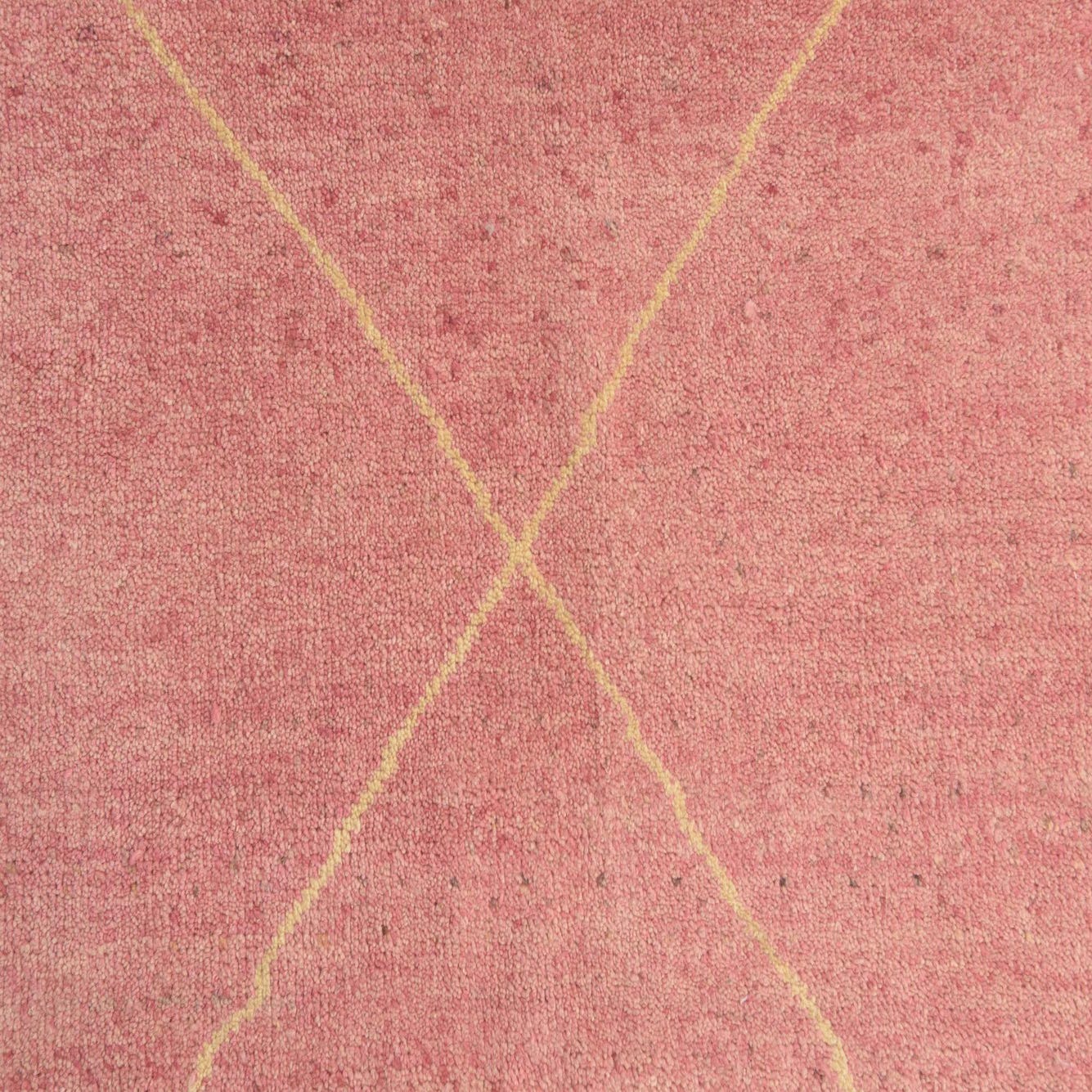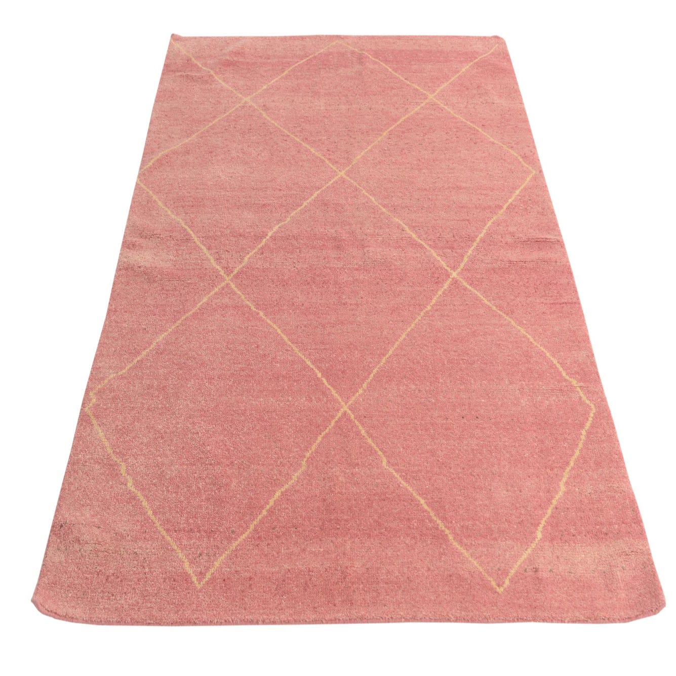 This Moroccan Collection rug presents an inviting, warm pink background with a simplistic ivory geometric diamond pattern that provides a touch of understated elegance. The 4x6 hand-knotted rug is crafted from 100% wool, offering both durability and a soft, inviting texture underfoot.