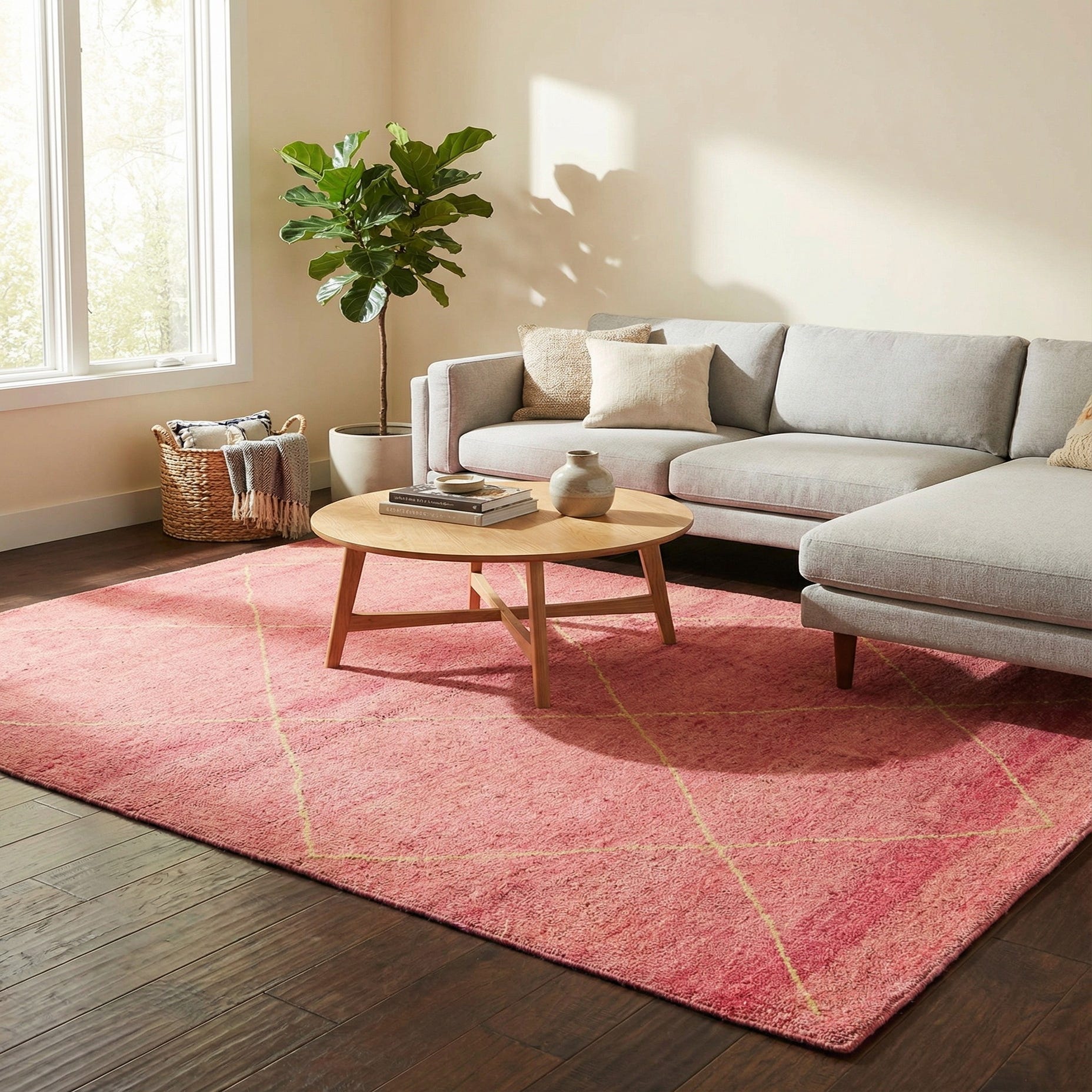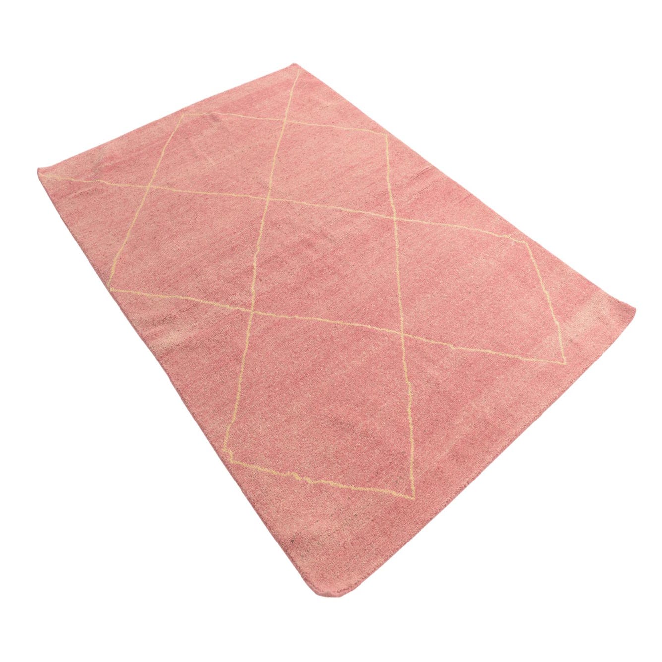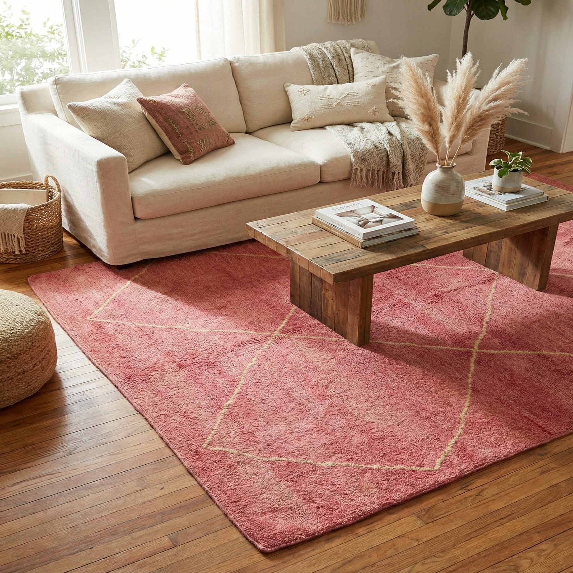 This Moroccan Collection rug presents an inviting, warm pink background with a simplistic ivory geometric diamond pattern that provides a touch of understated elegance. The 4x6 hand-knotted rug is crafted from 100% wool, offering both durability and a soft, inviting texture underfoot.
