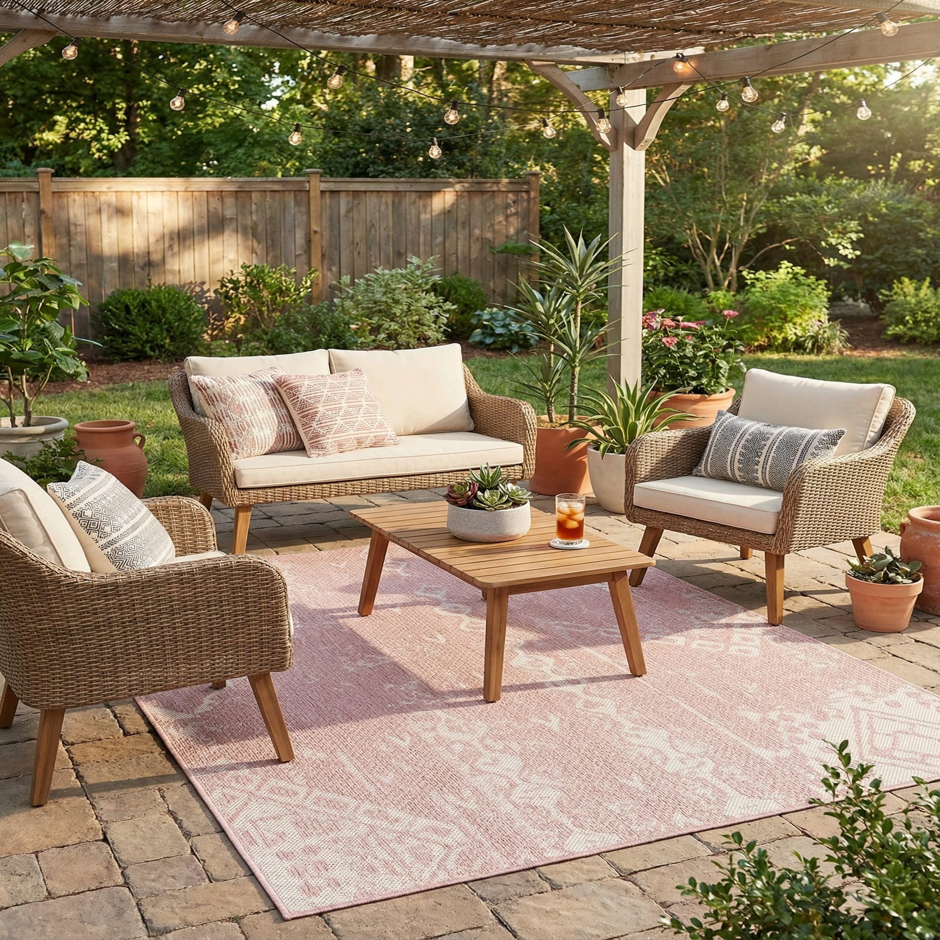 From the Outdoor Bohemian collection, this 4x6 rug brings a relaxed elegance to any outdoor space. Crafted from 100% polypropylene, it features a flatweave construction that ensures a durable, shed-free and pet-friendly surface. The main color is a soft pink, providing a warm backdrop for the ivory tribal-inspired patterns that add visual interest and a bohemian flair.