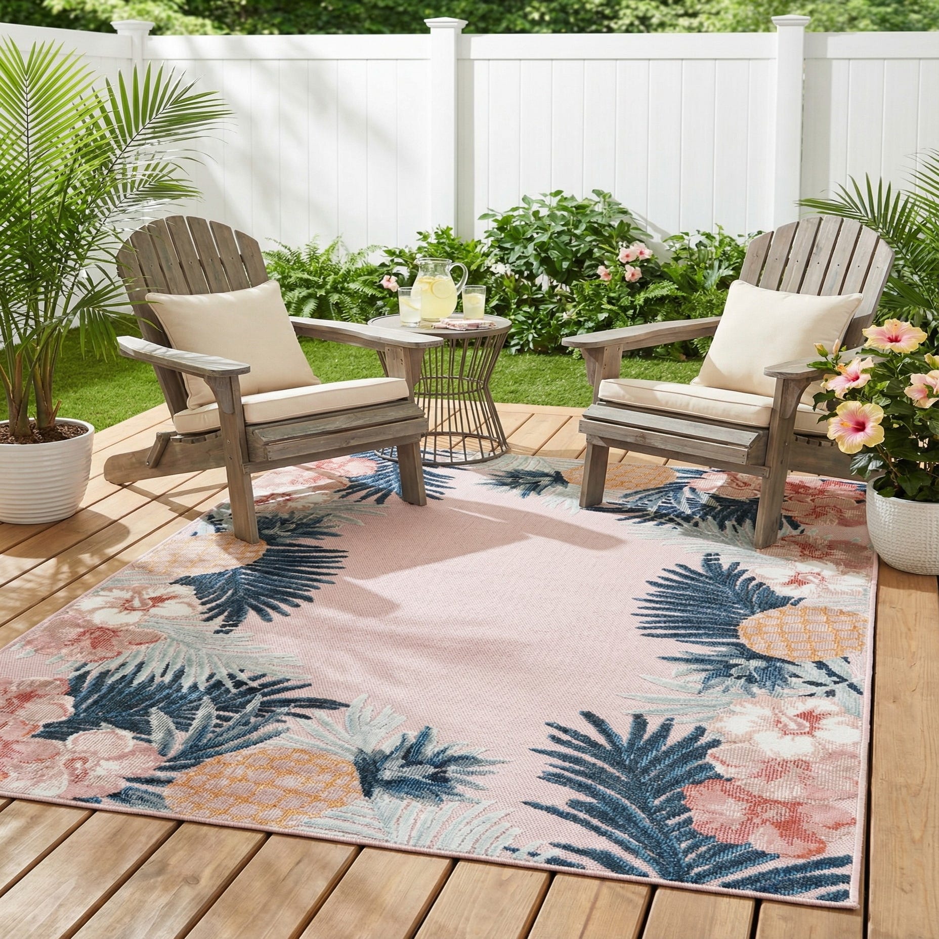 The Outdoor Botanical Collection presents a vibrant and charming machine-woven rug, measuring 4x6 feet, crafted from polypropylene for durability and longevity. This rug showcases a fetching botanical pattern featuring stylized floral and pineapple motifs dispersed over the pink-hued background. A harmonious palette of pink, gold, gray, ivory, light blue, navy blue, and rust red shapes the design, creating a visual ensemble that encapsulates both modern and classic design sensibilities.