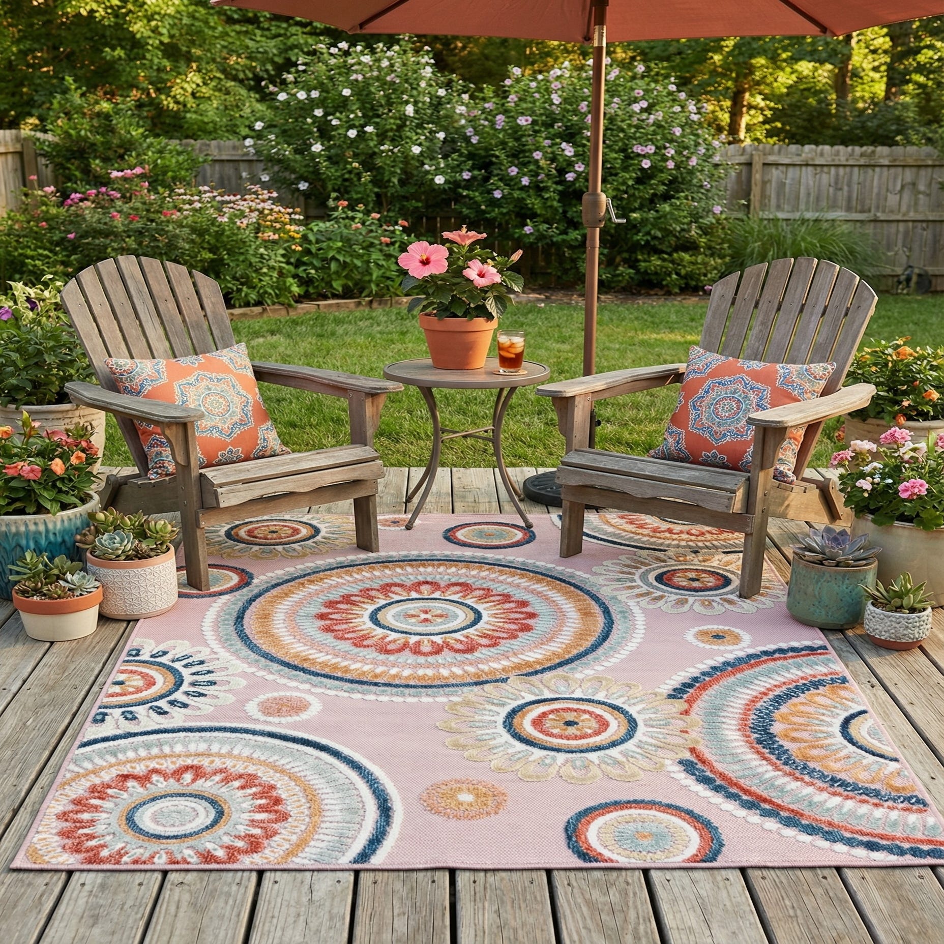 The Outdoor Botanical collection presents a machine-woven rug crafted from polypropylene, offering a 4x6 area of visual appeal and functional utility. This piece showcases a dynamic blend of concentric, botanical-inspired patterns which are beautifully juxtaposed on a soft pink background. The incorporation of beige, gray, ivory, light blue, navy blue, and rust red hues creates a vibrant but harmonious color palette that is visually engaging and adaptable to various outdoor and indoor settings.