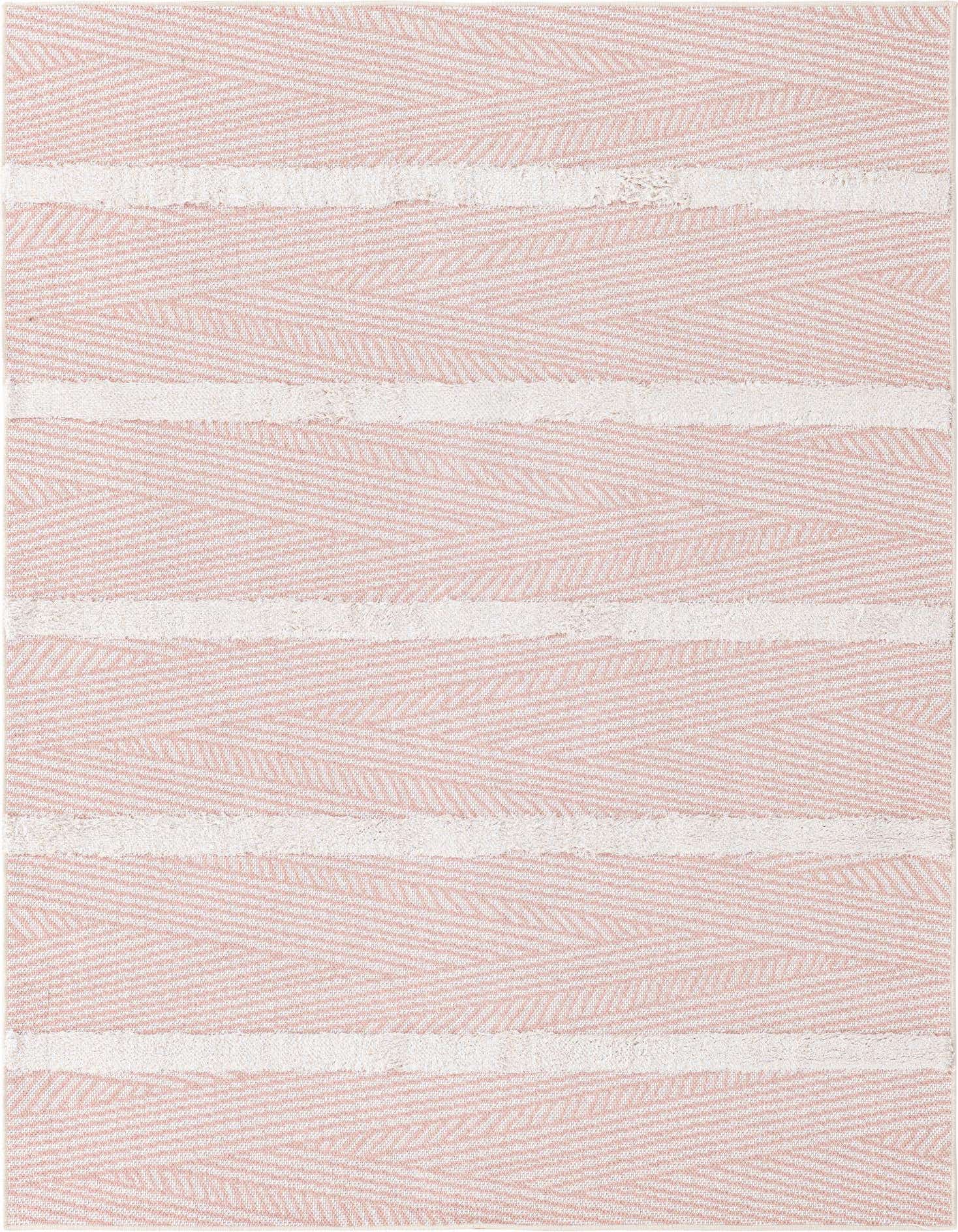The rug's pattern is an assemblage of horizontal stripes that alternate in color and texture, adding visual interest and a tactile dimension to the soft cotton surface. Subtle variations in the pink hues and ivory backgrounds are effortlessly integrated, producing an effect that is both understated and engaging.