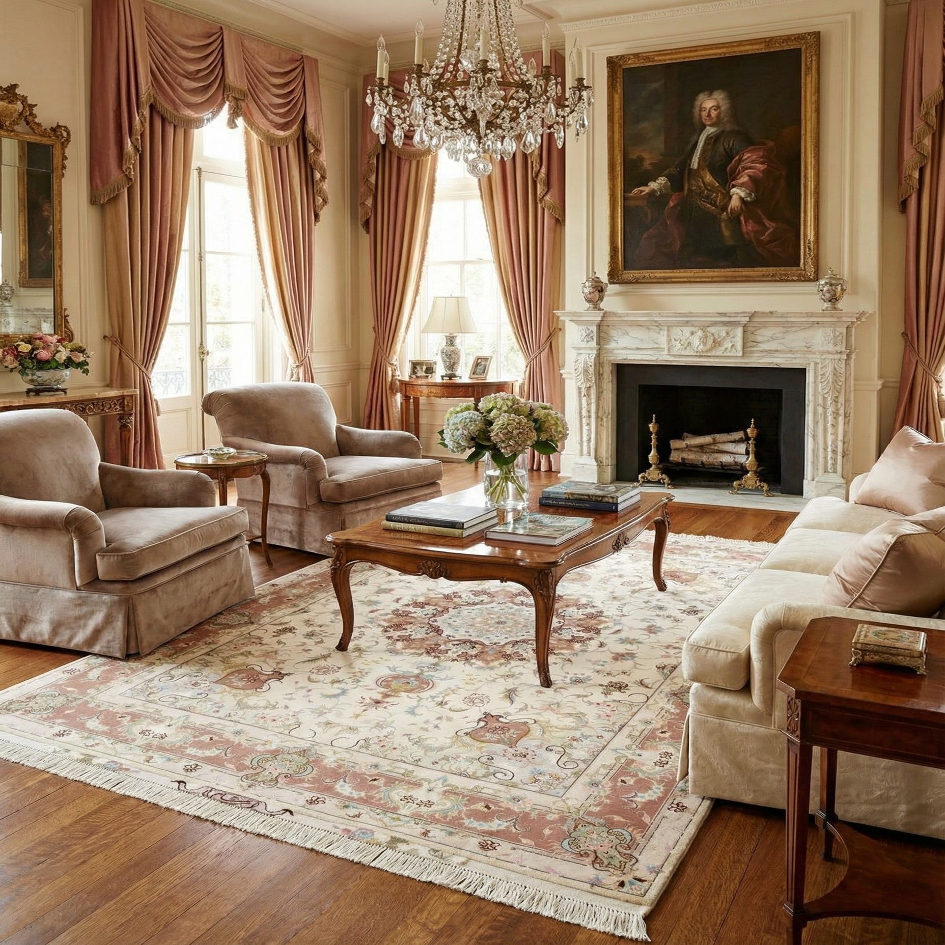A finely detailed floral medallion and scrolling vine pattern sits on a warm pink field, surrounded by a deeper rose-pink border that frames the design. Cream fills the inner field and balances the palette, while accents of purple, olive, blue and brown add depth to the florals and arabesques. Handmade from wool and silk, the rug has a soft, dense wool pile with silk highlights woven through the motifs; the silk catches light for a gentle sheen that contrasts with the matte warmth of the wool.