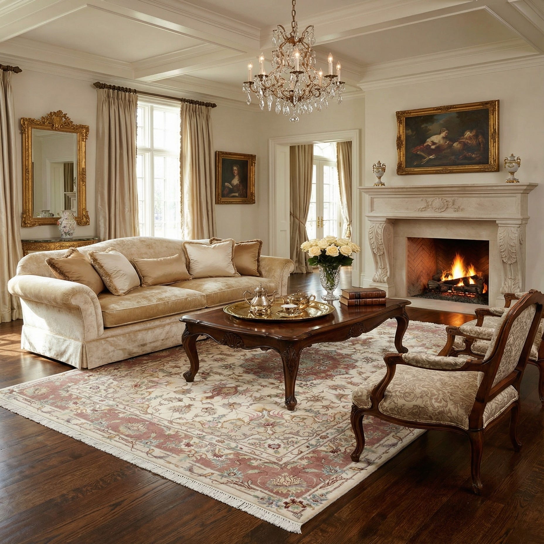 The rug works well in classic and transitional interiors, anchoring a neutral living room with linen sofas and brass or antique accents. Use it at the foot of a bed or layered under a nightstand to bring pattern and warmth to a bedroom, or position it beneath a small dining or seating group to introduce color without overwhelming the space. It also pairs nicely with faded woods and muted upholstery for a quiet, composed look, and complements both period furnishings and modern, pared-back pieces for a balanced blend of tradition and contemporary style.