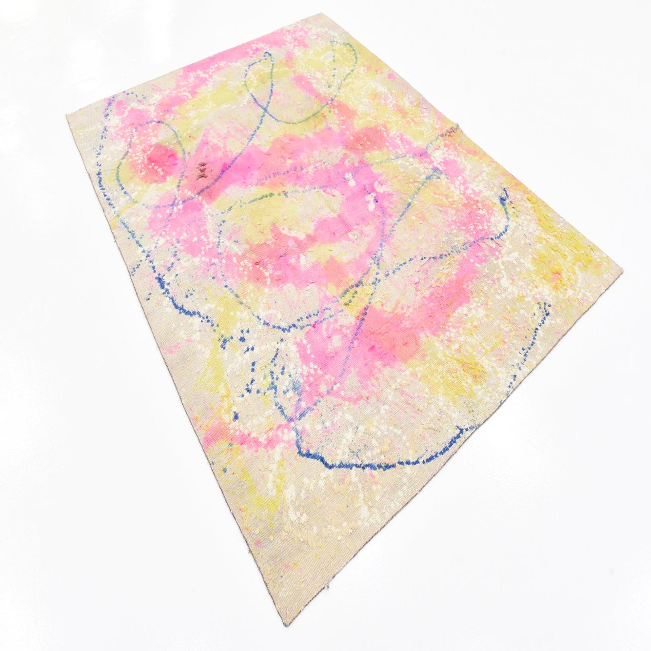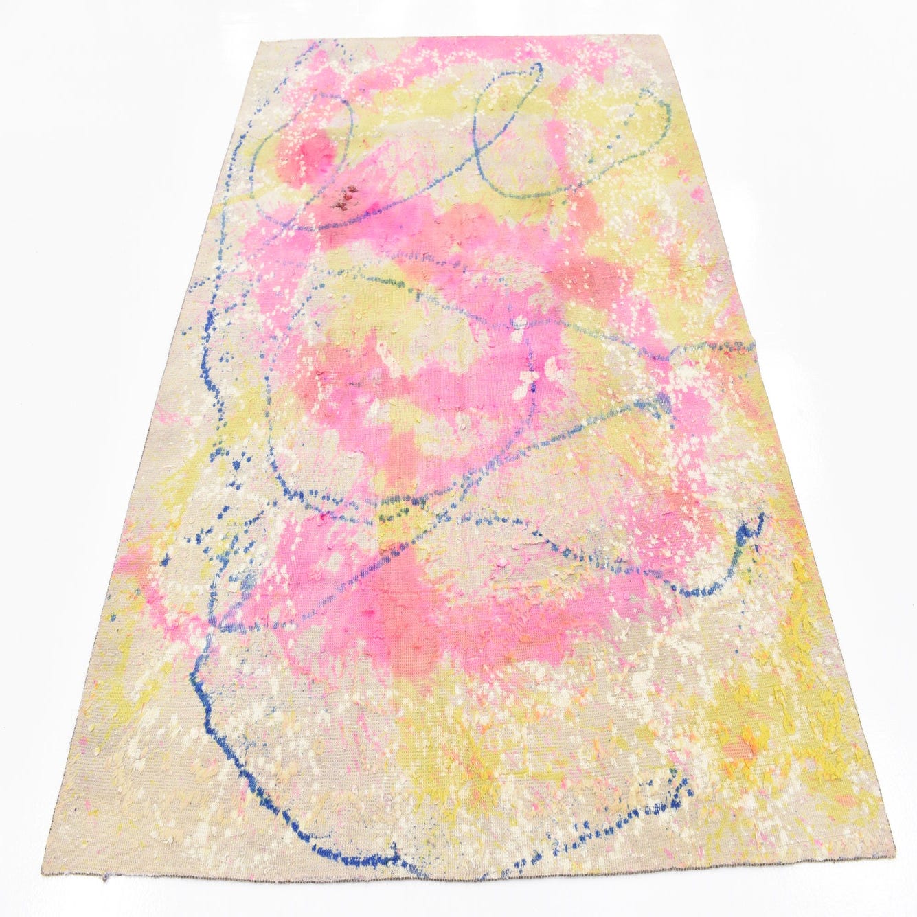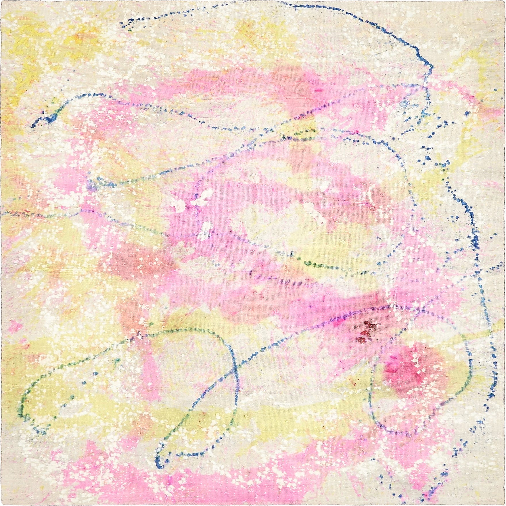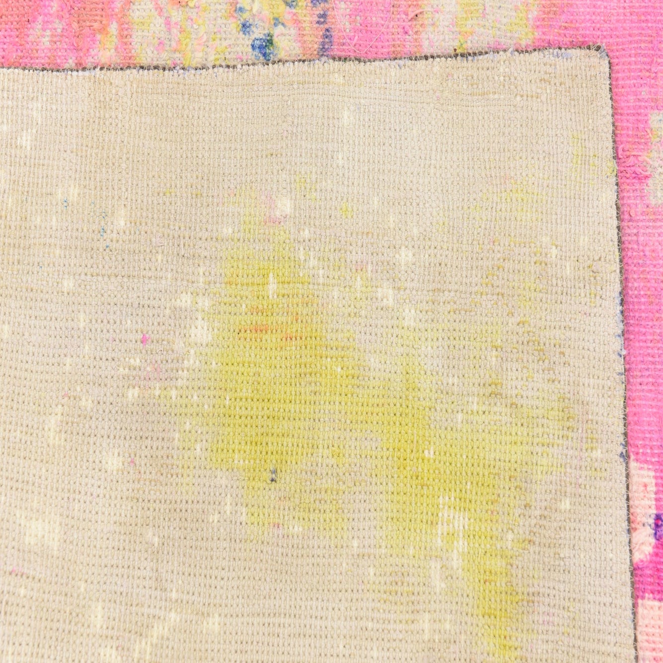 Primary color is Pink. Colors in this rug include: Pink, Blue, Ivory, Yellow, Beige.