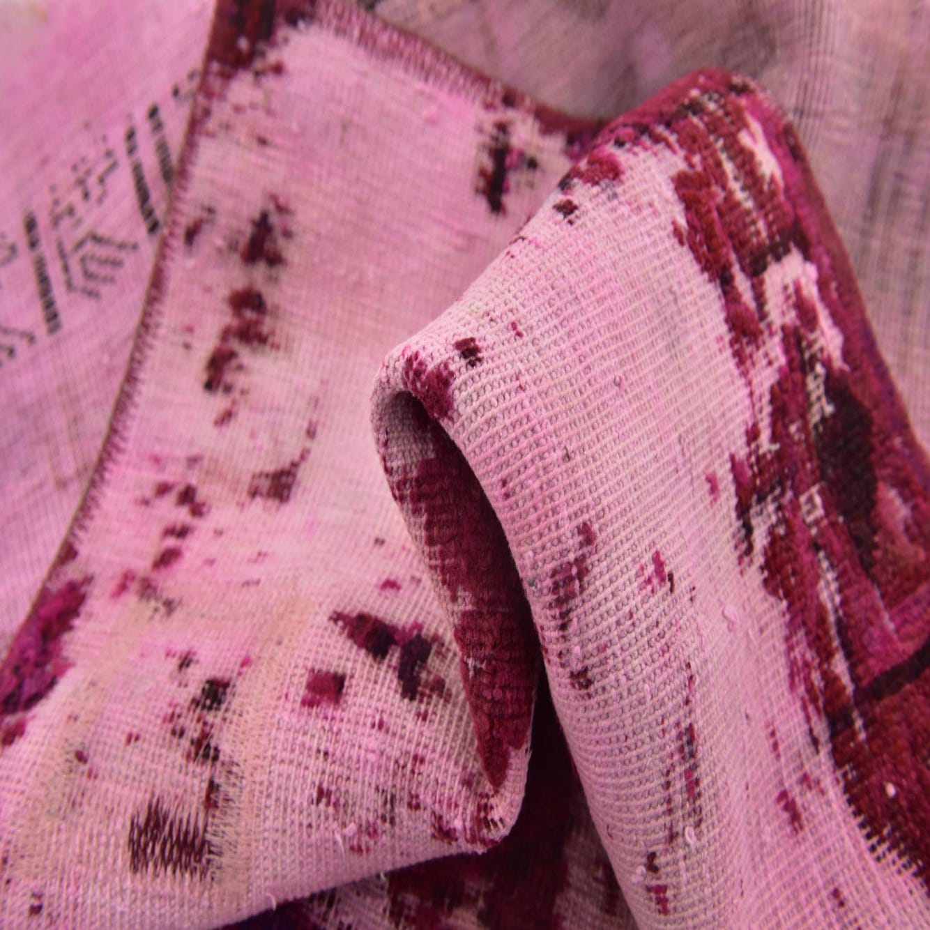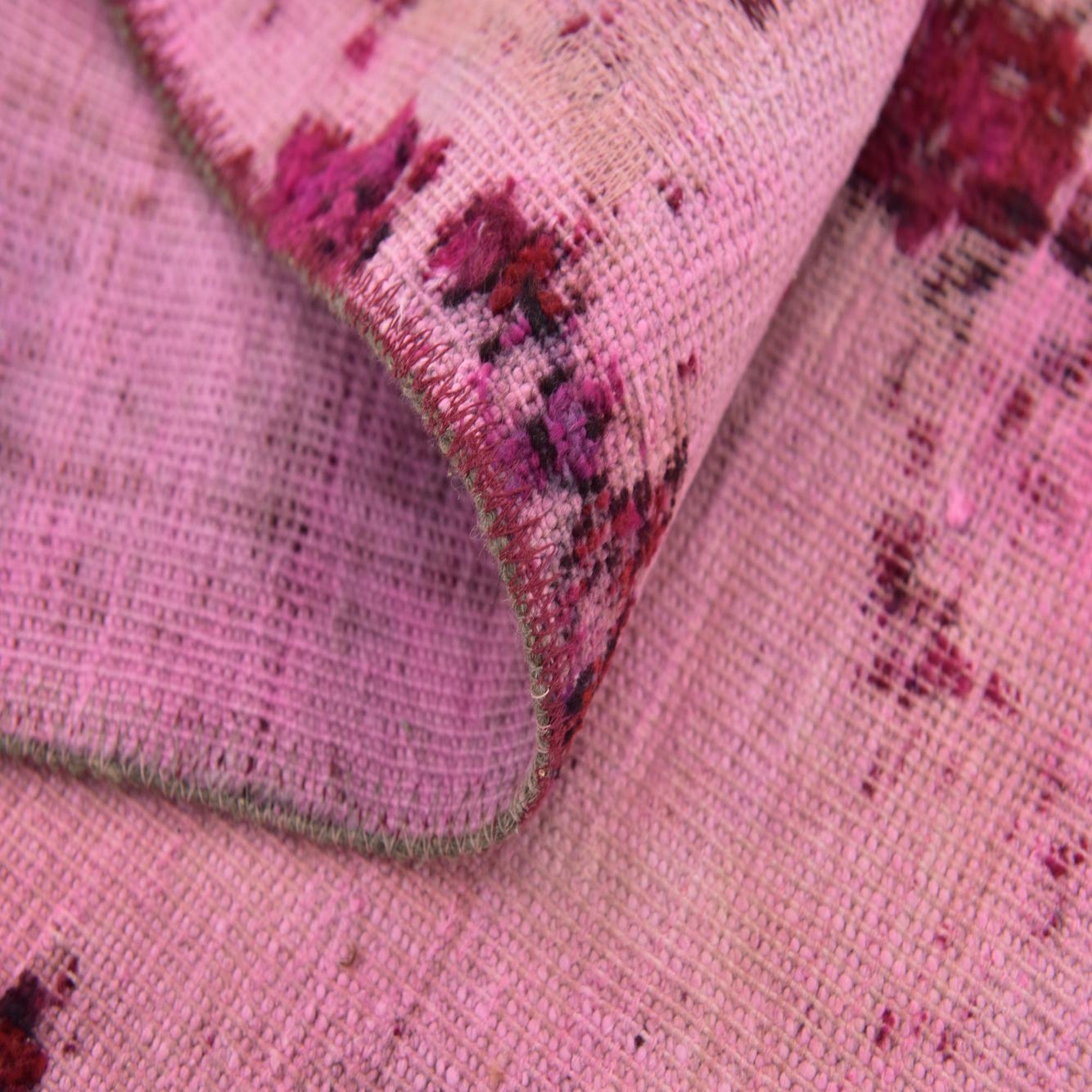 A 4x6 rectangular pink wool rug with an abstract, distressed Persian pattern, ideal for a living room.