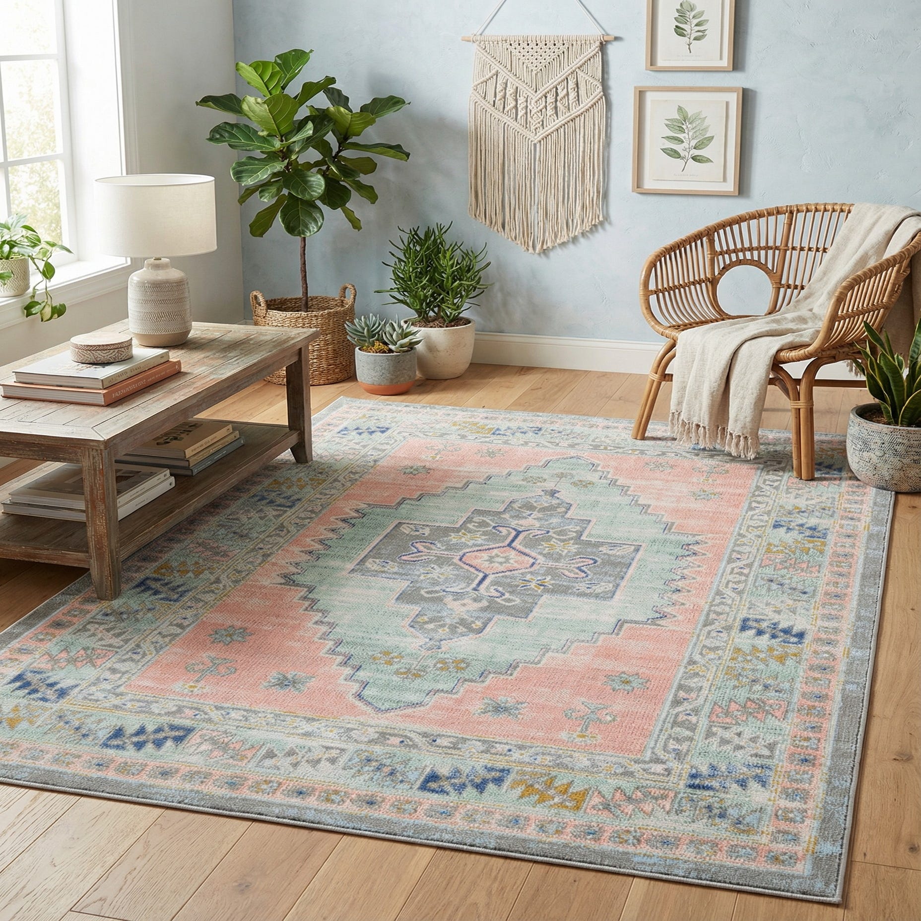 The colorway and pattern suit a range of interiors: layer it beneath a neutral sofa to introduce a soft, feminine touch to the living room, place it at the foot of a bed to warm a calming bedroom, or use it in a nursery or sunlit reading nook to bring in cheerful color. It pairs well with weathered wood, rattan and pale painted finishes, and coordinates nicely with muted grays or navy accents for added contrast.