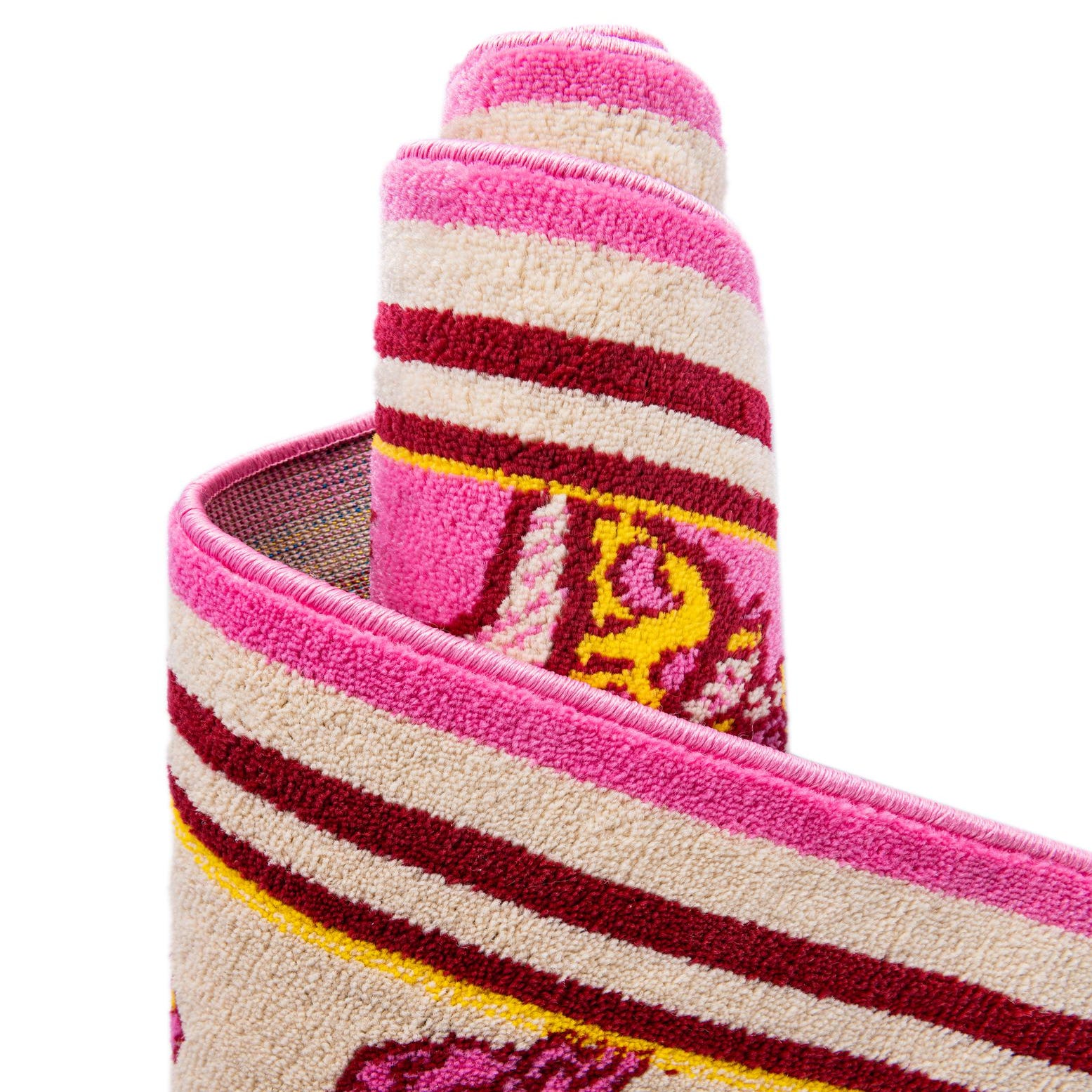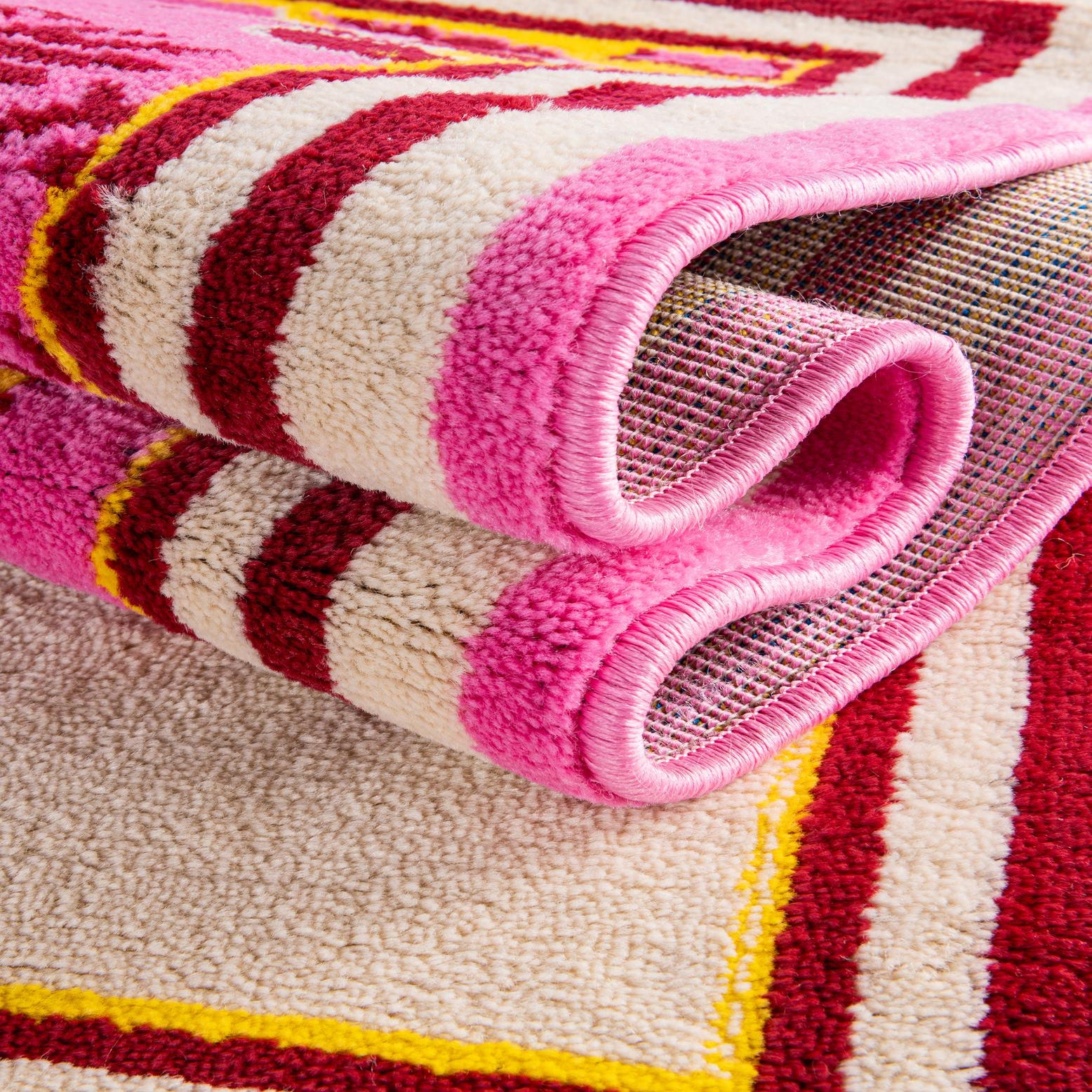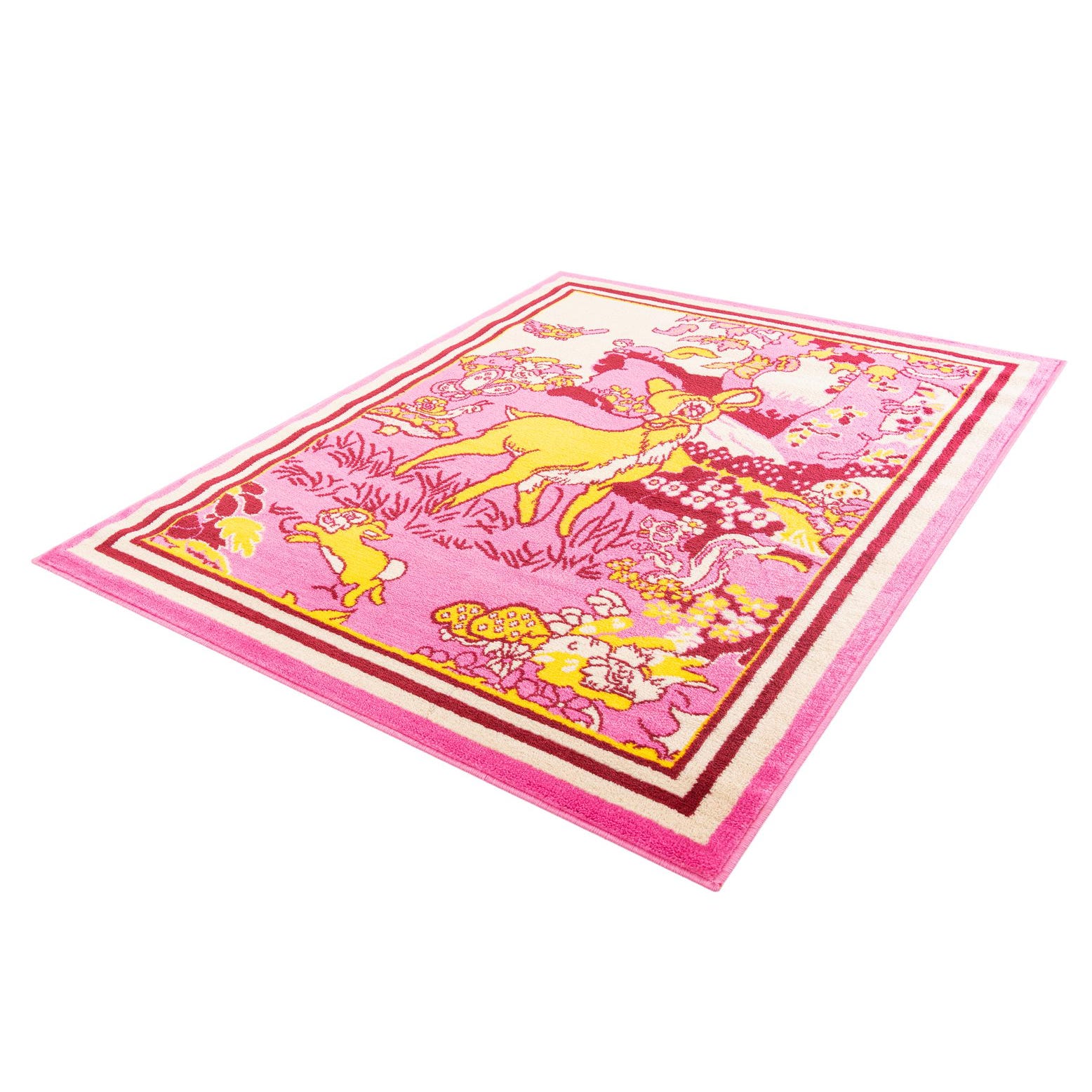 Primary color is Pink. Colors in this rug include: Pink, Beige, Burgundy, Gold, Ivory.