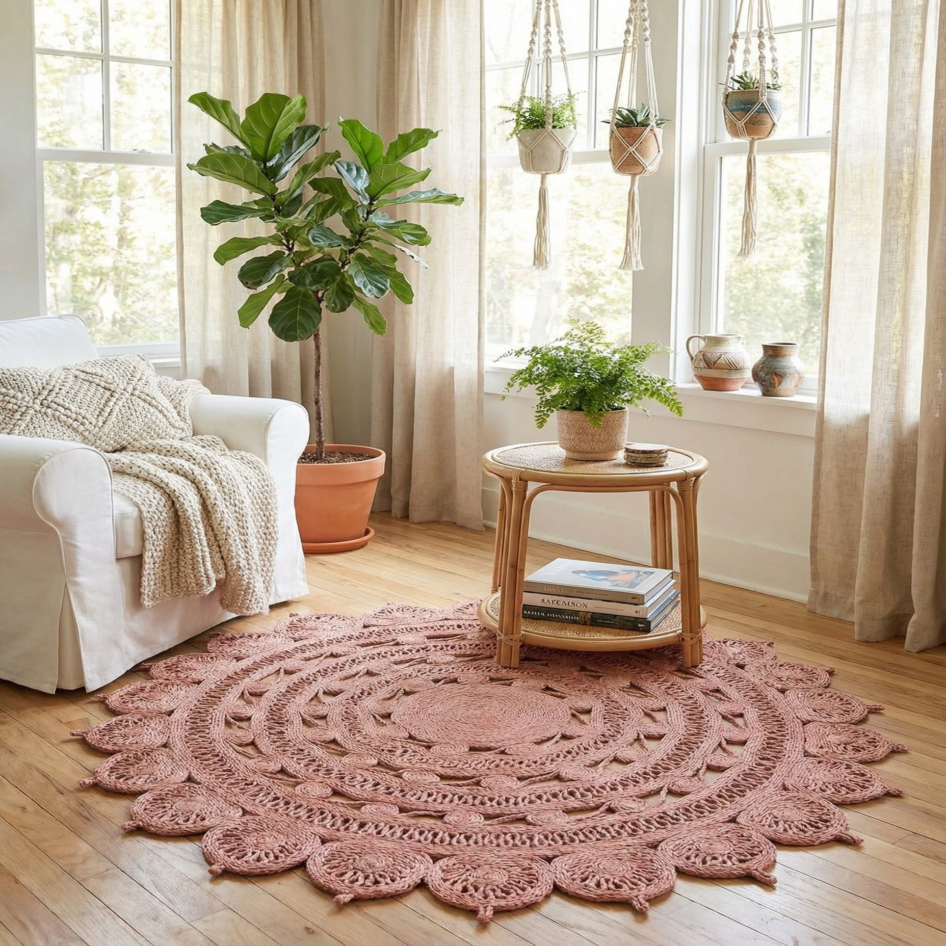 Hand-braided from 100% jute, this round rug presents concentric rings of tightly coiled braids alternating with open, lace-like rows and small, raised rosette knots. The scalloped edge is formed by petal-shaped braided motifs that give the perimeter a handcrafted, decorative finish. The pink background adds a warm, muted color that highlights the natural fiber texture — you can feel the raised ridges of the braids and the airy openness of the woven sections underfoot.