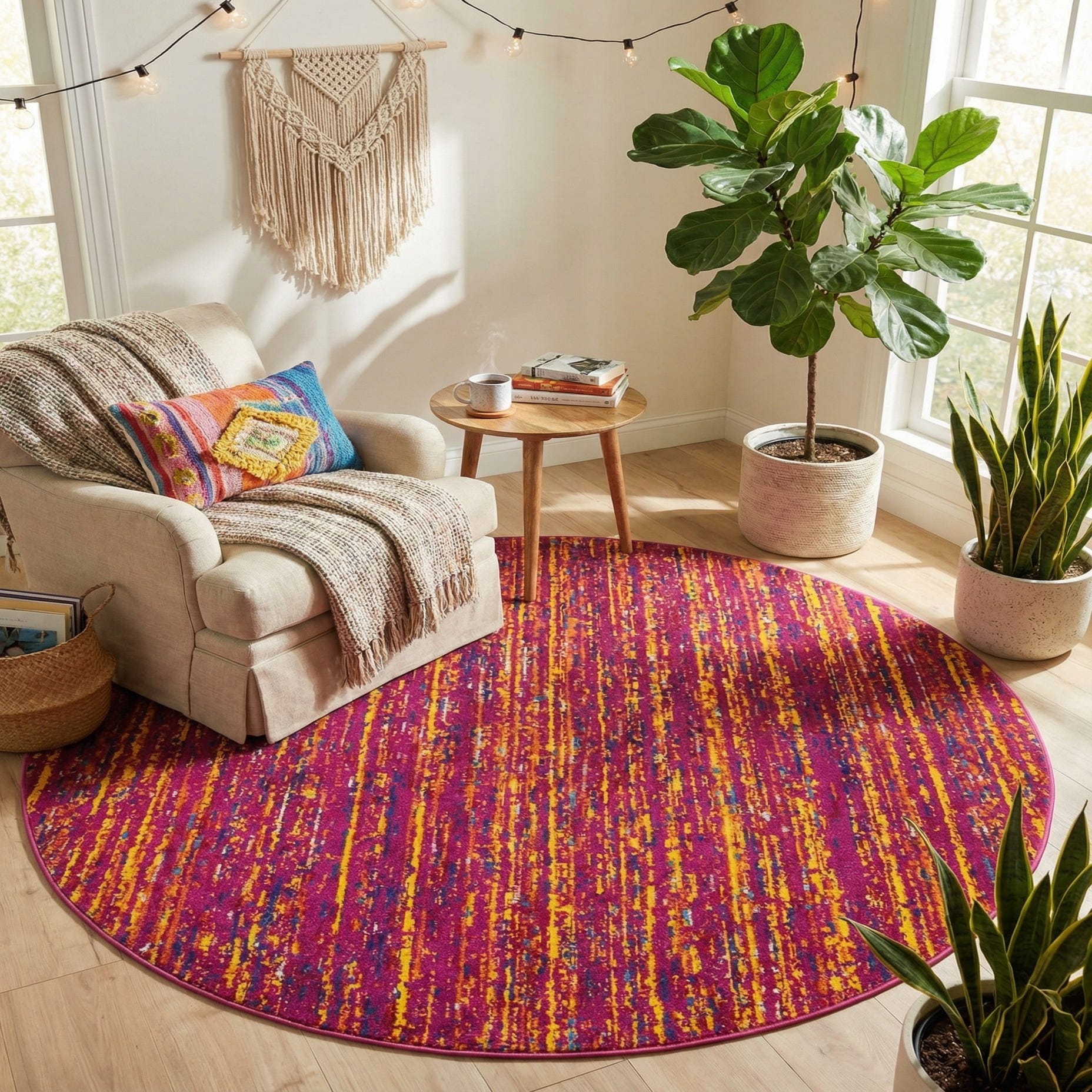 A vibrant 5' 3 round rug featuring an eclectic, modern pattern with streaks of pinks, yellows, and blues.