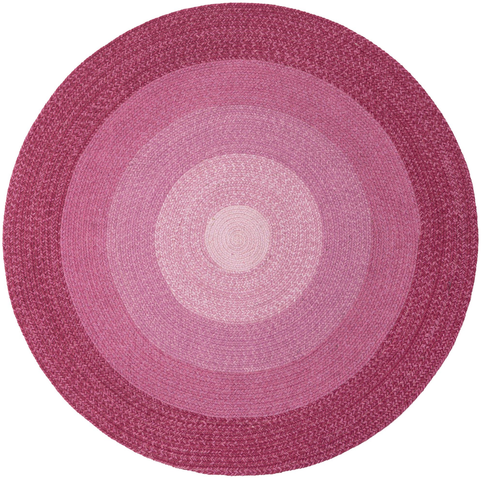 A 5' 1 round pink wool rug with concentric circles of varying pink shades, from light to dark, in a braided texture.