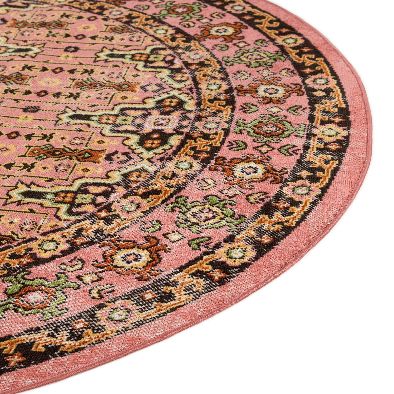 A round, Persian-inspired medallion with concentric borders and scattered floral motifs sits on a pink background, punctuated by brown, maroon, ivory, and light green accents. The pattern balances geometric outlines with softer floral sprays, producing a lived-in, slightly distressed vintage look while keeping clear, defined motifs. Machine made of 100% polypropylene, the rug has a low-profile pile with a smooth, slightly lustrous hand and a tightly woven surface that highlights the intricate pattern underfoot.