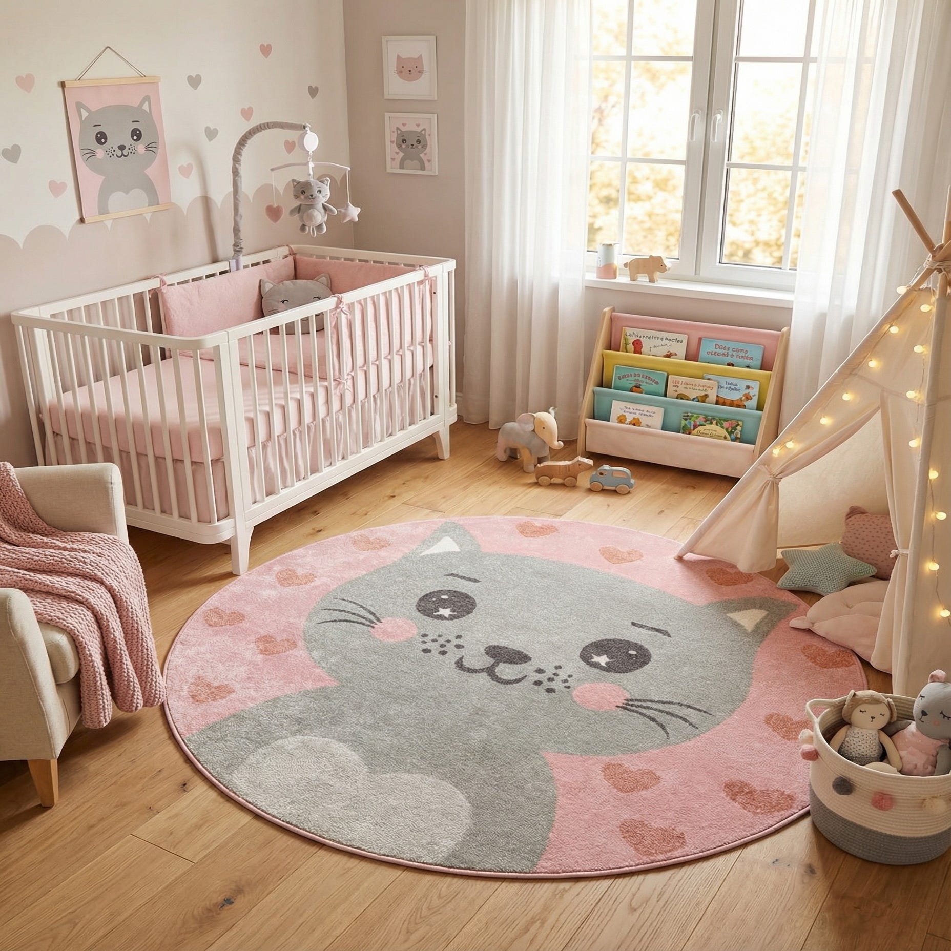 A playful round rug with a large gray cat face centered on a pink background, surrounded by scattered coral-red hearts. Black detailing defines the whiskers, nose and wide eyes—each eye accented with a tiny ivory star—while soft pink cheeks and an ivory chest heart add gentle contrast. The overall style is whimsical and child-friendly, translating a simple cartoon motif into a clean, modern graphic that reads well in both playful and more restrained interiors.