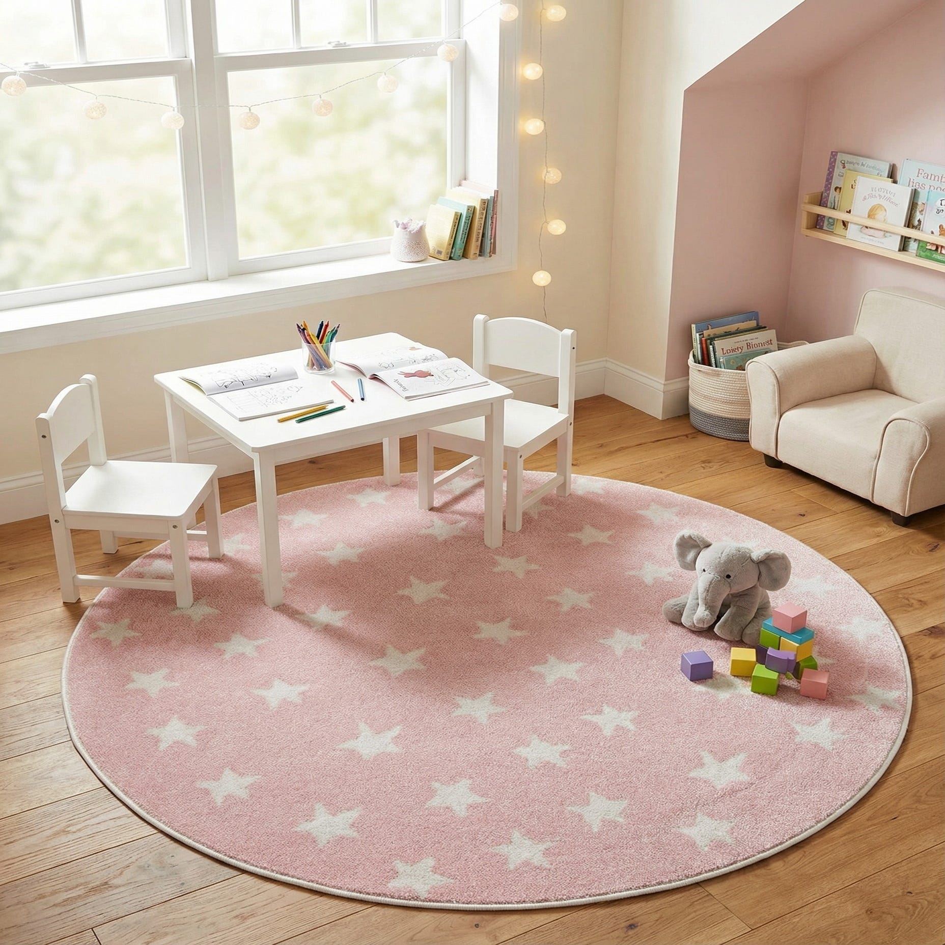 The pattern features a star design scattered across a pink background, with ivory accents bringing a gentle contrast to the piece. The soft hues contribute to a calming atmosphere, making it an ideal choice for nurseries, playrooms, or any child-centric environment. The texture is pleasant underfoot, providing comfort without sacrificing on the rug's practicality as it is stain-resistant and shed-free.