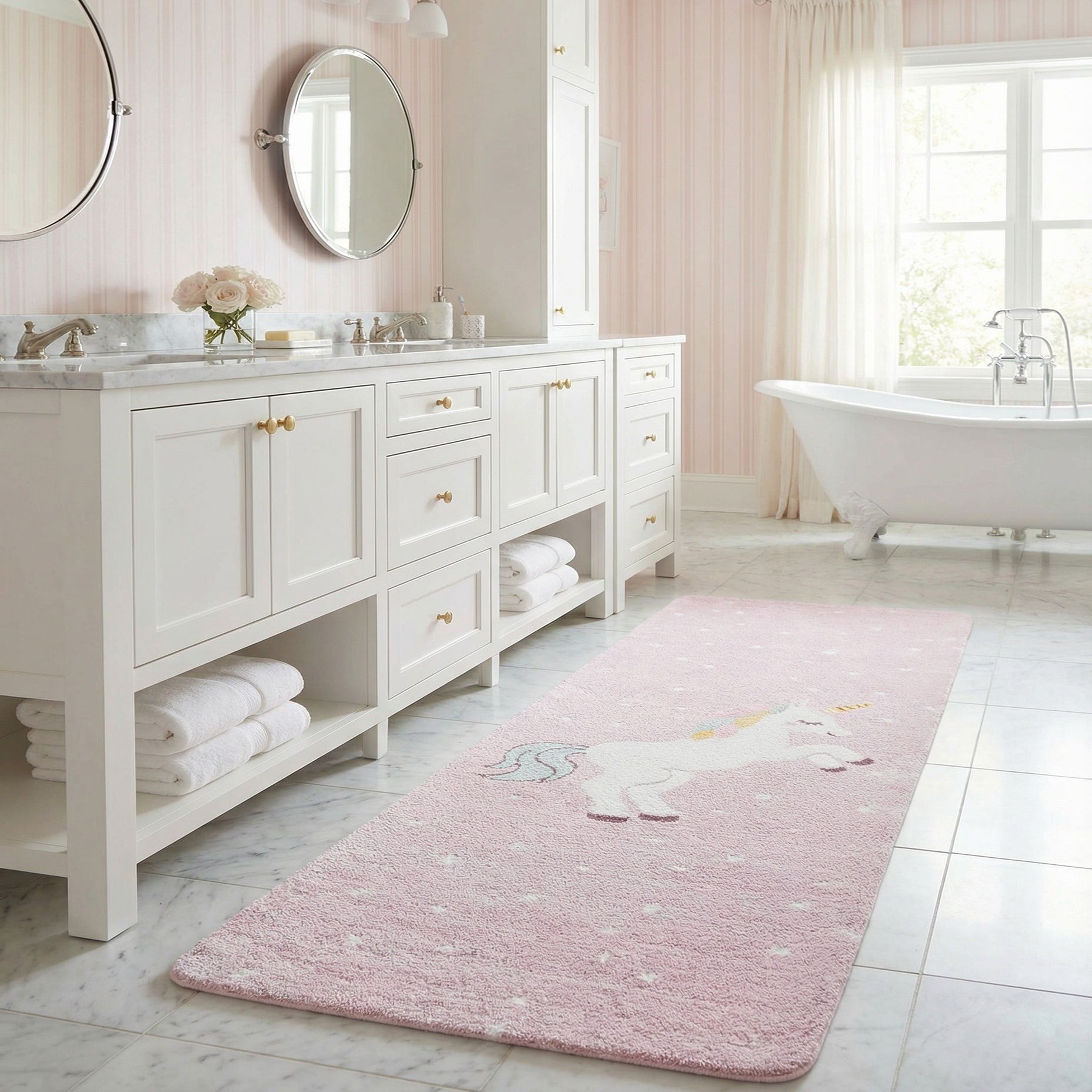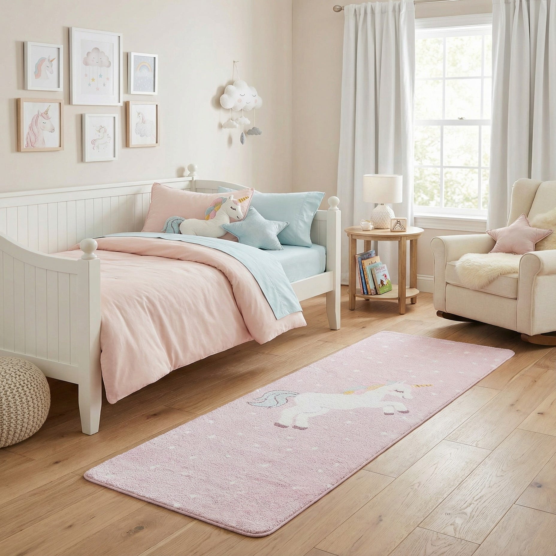 A 5 ft pink runner rug featuring a white unicorn with a colorful mane and tail, surrounded by small white stars.