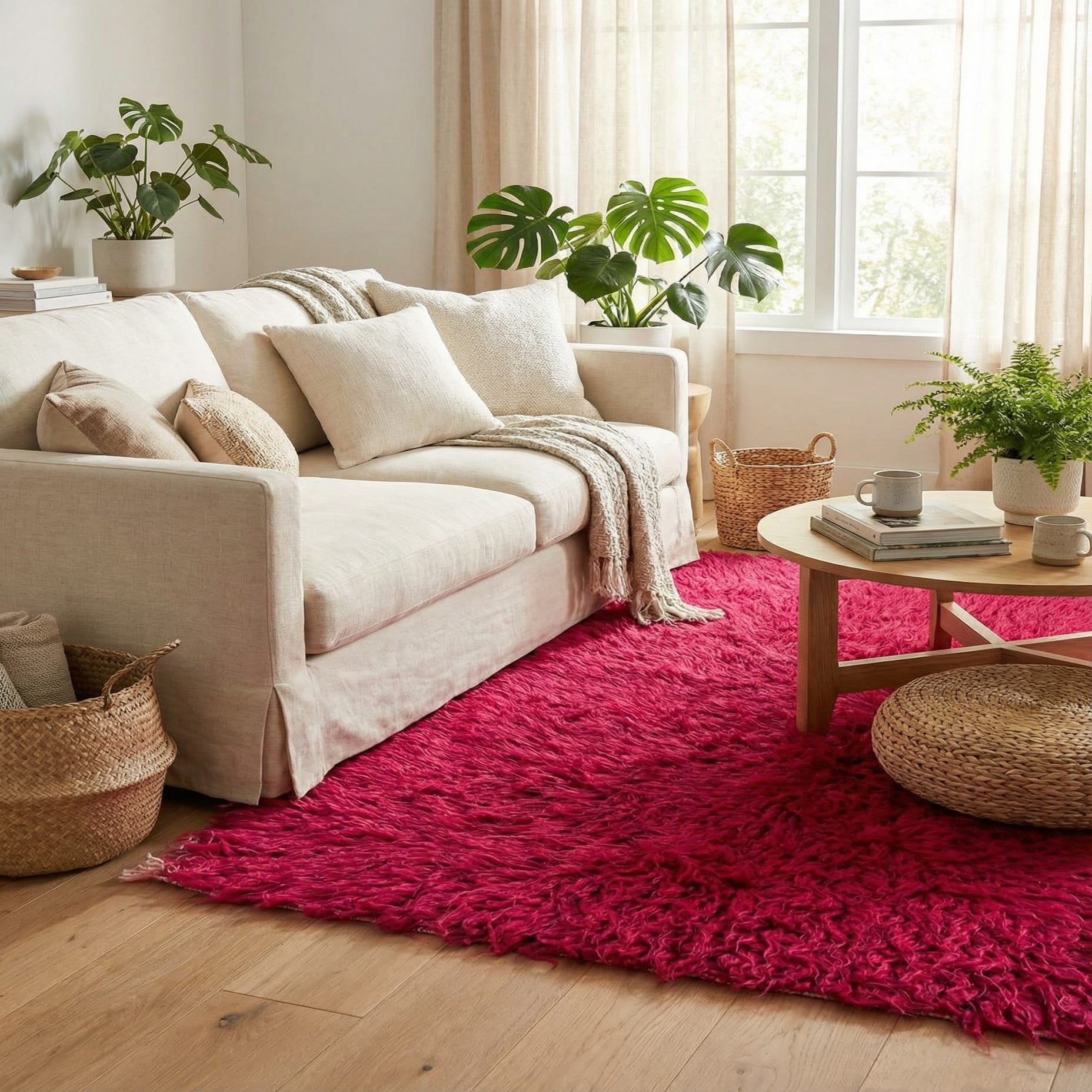 A vibrant pink 5 ft runner rug with a plush, shaggy texture, perfect for a hallway.