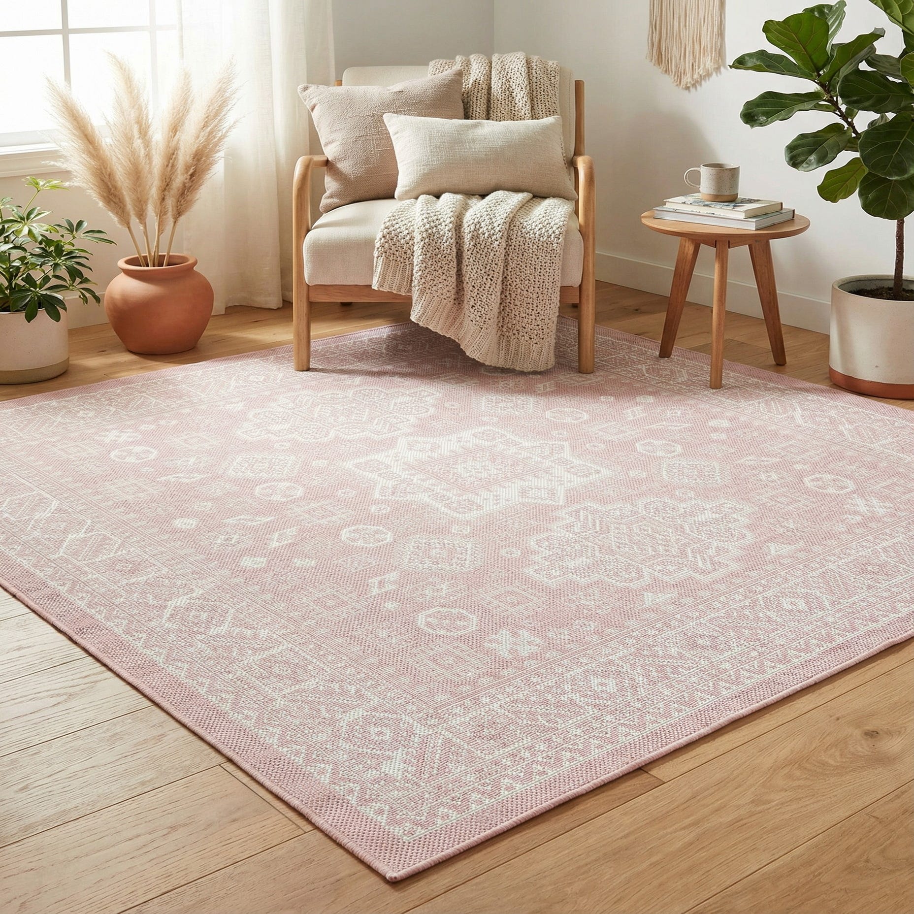 Primary color is Pink. Colors in this rug include: Pink, Ivory.