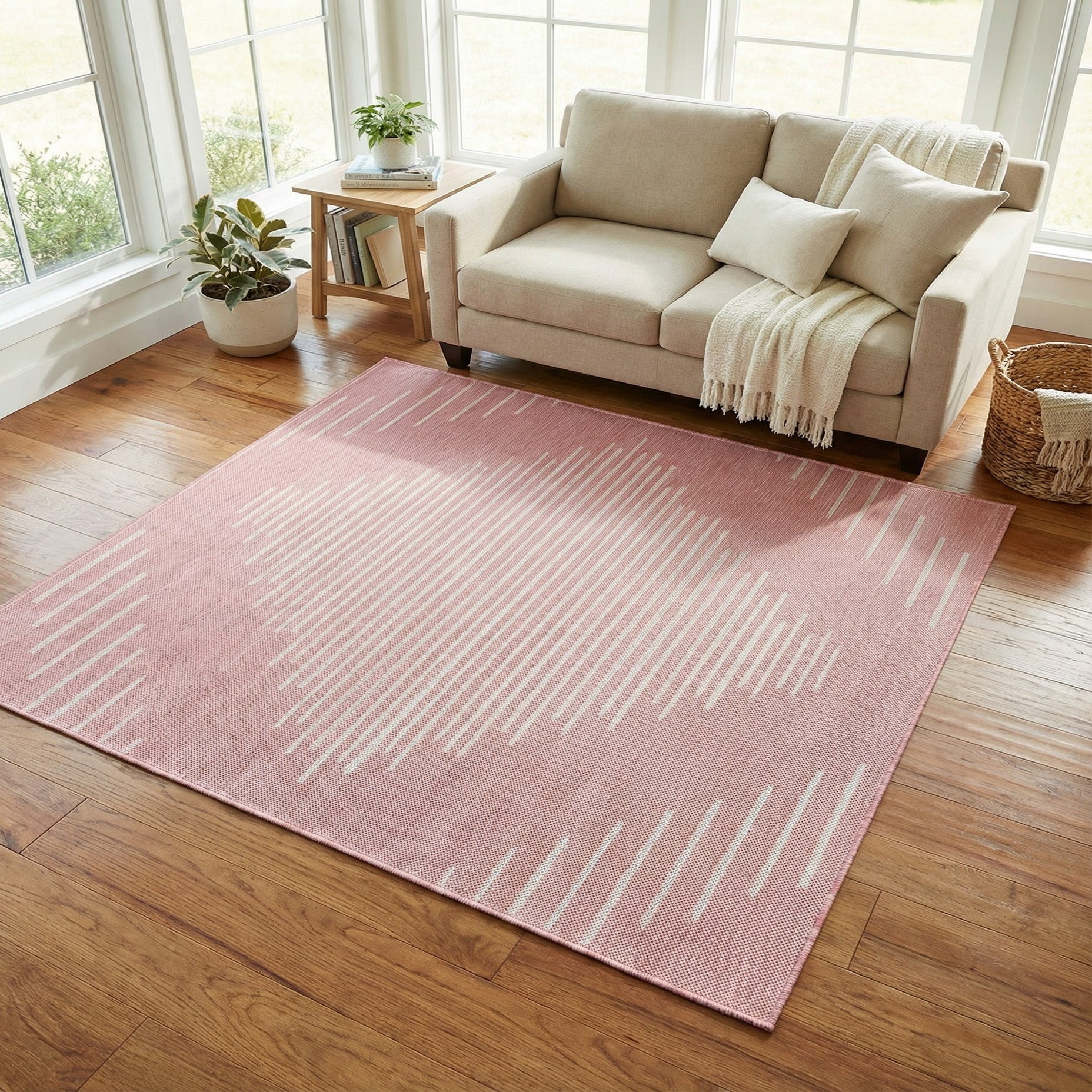 The pink and ivory color palette of this piece easily harmonizes with a variety of decor styles, from coastal to modern minimalist. Whether it is placed on a patio, deck, or in a casual living room or kitchen, this item infuses the space with a contemporary flair. Its pet-friendly and shed-free properties also make it a practical choice for households with pets, as it stands up well to the demands of everyday life.