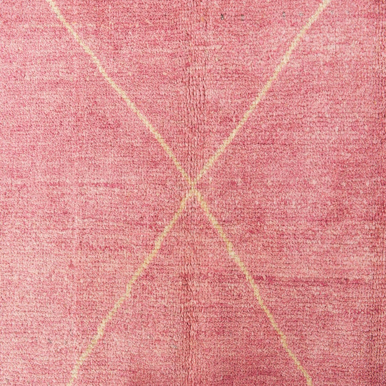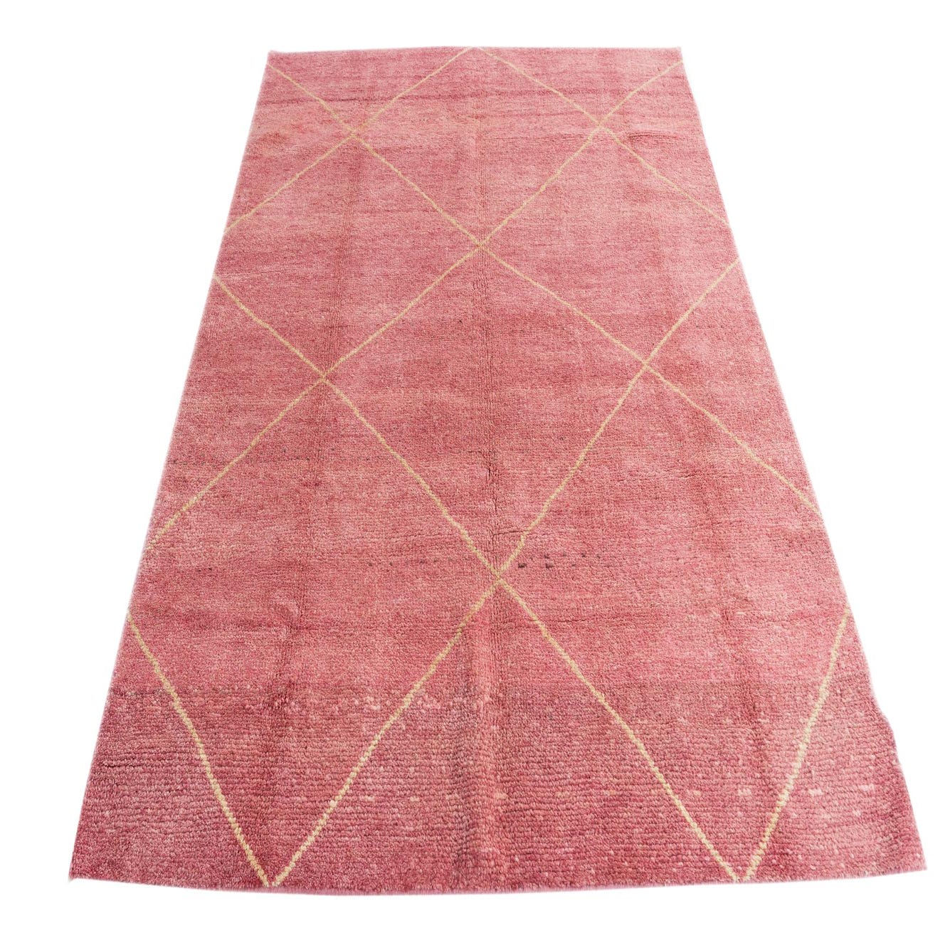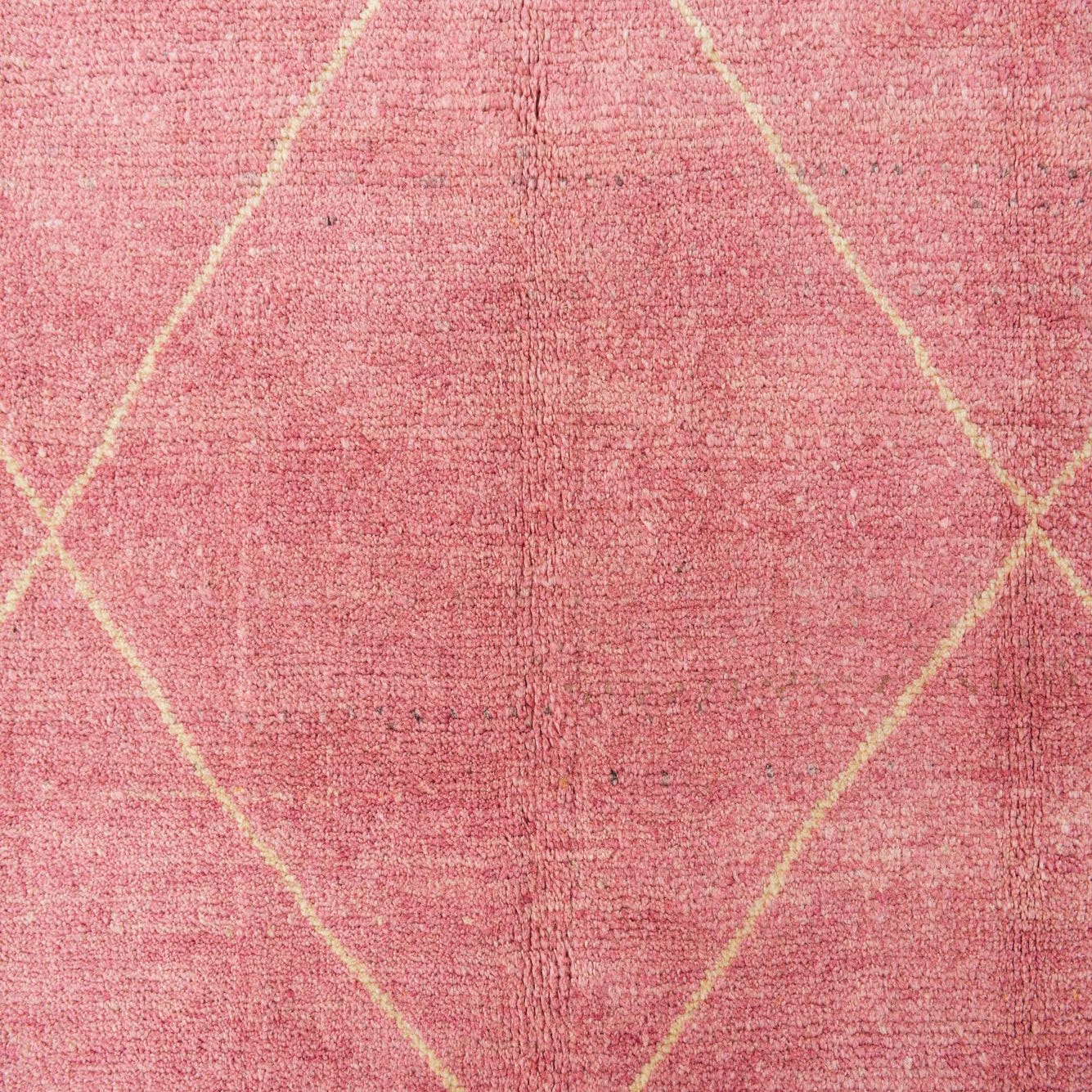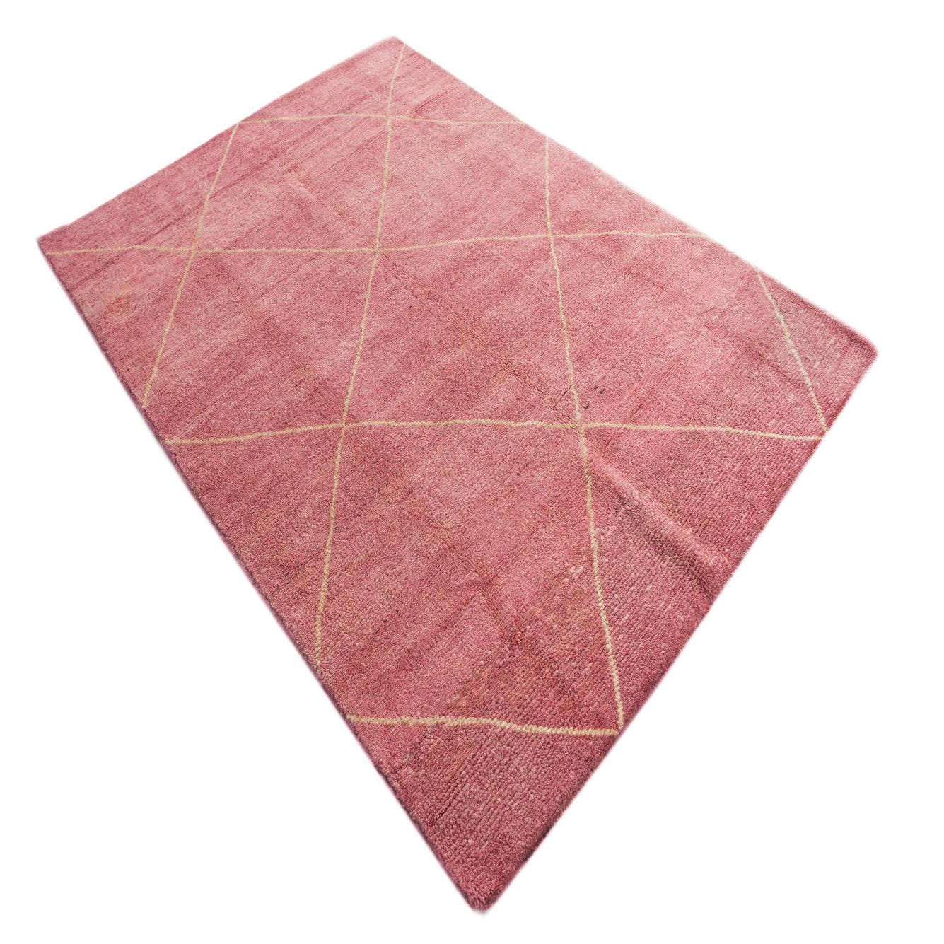 This Moroccan collection area rug offers a subtle yet impactful addition to any room with its soft, pale pink background punctuated by an understated cream geometric diamond pattern. The hand-knotted construction of this 5x7 piece ensures a unique, durable finish, with a texture that adds depth and character to the natural 100% wool material. The low pile of the rug provides a sleek appearance, making it well-suited to a variety of interior design scenarios.