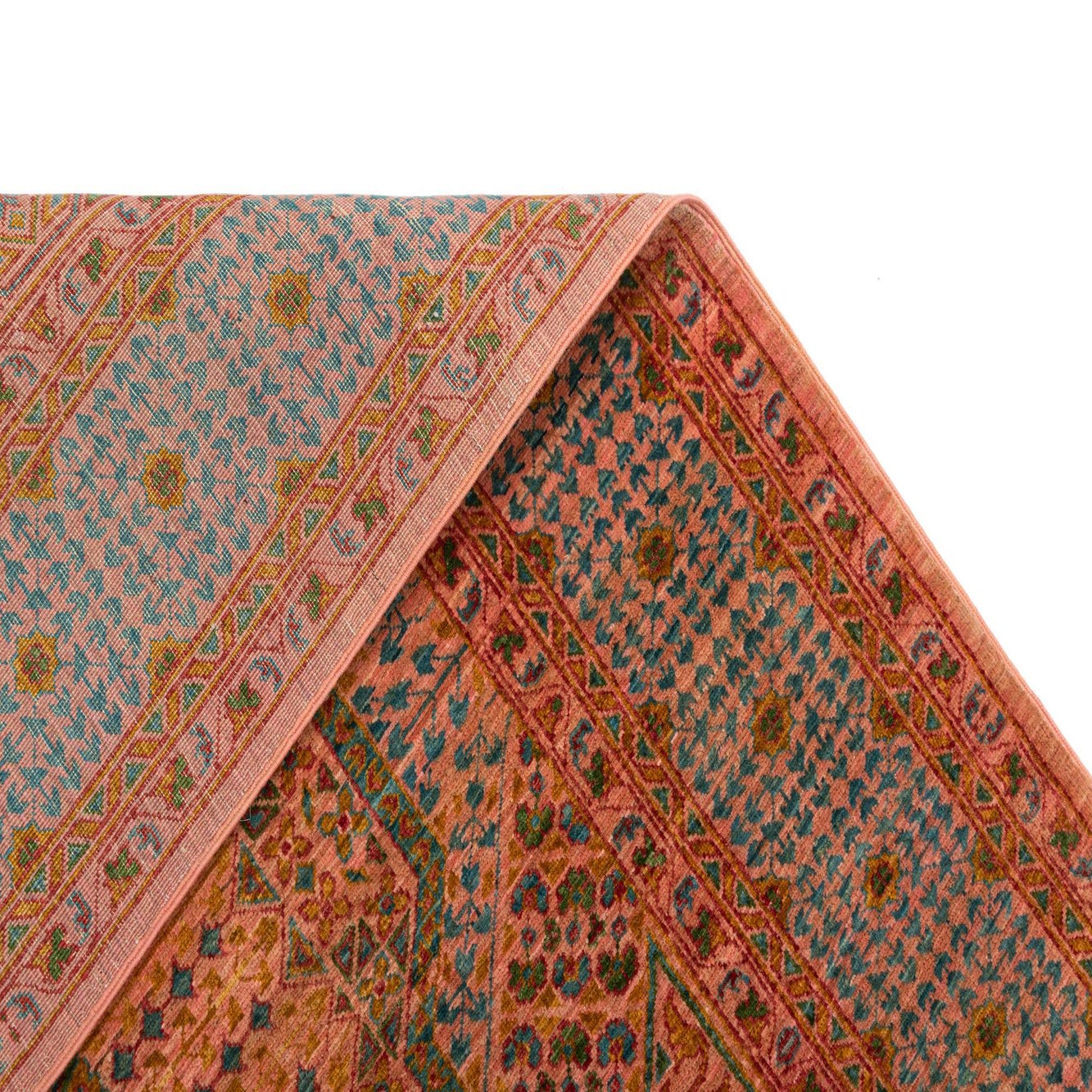Primary color is Pink. Colors in this rug include: Pink, Pink, Red, Blue, Green, Brown.