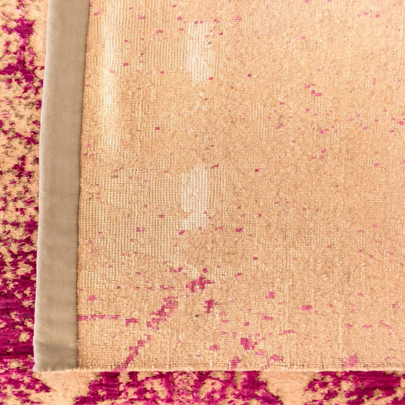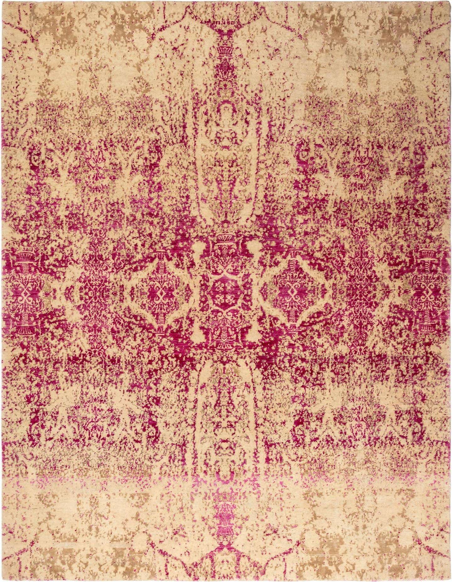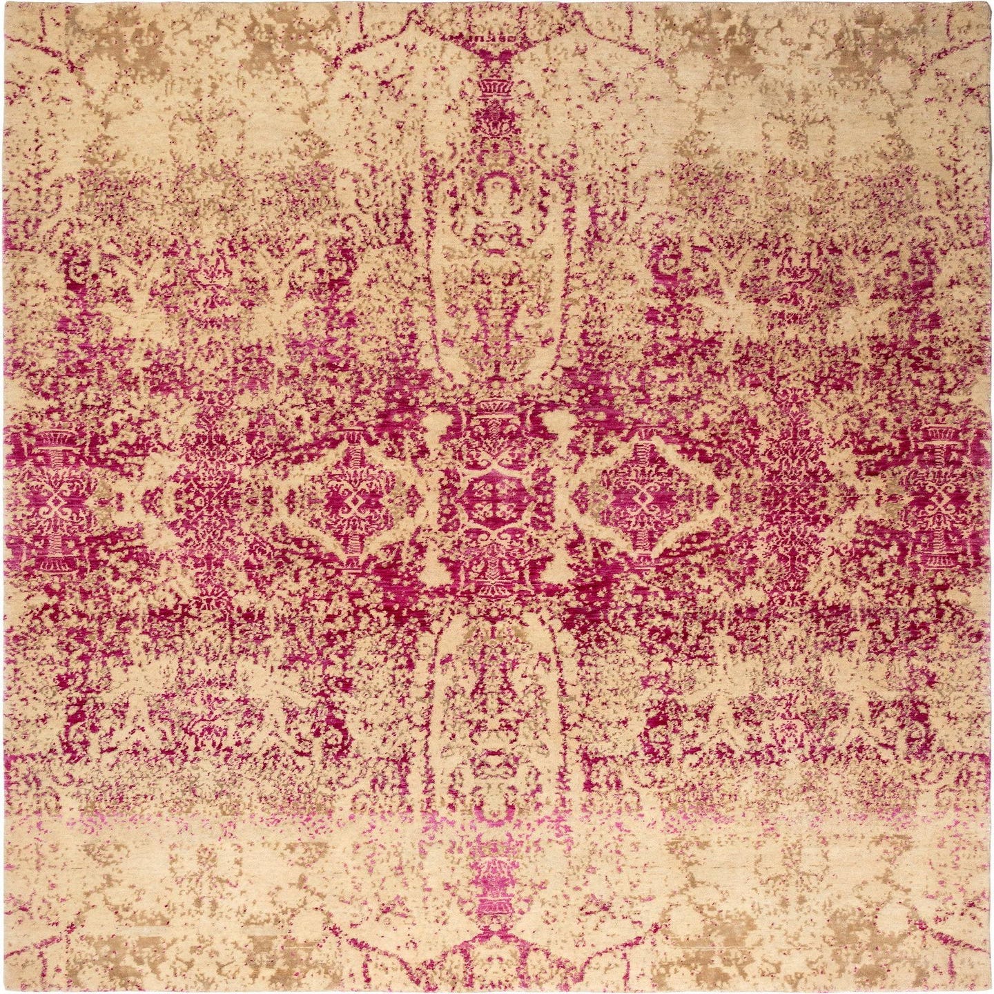 This Art Inspired collection hand-made 100% wool rug, in a 5x8 size, presents an artistic rendition of traditional motifs. The pattern boasts a distressed aesthetic, giving it a vintage look with a contemporary twist. Colors comprising this rug include varying shades of pink and beige, with the pink creating a vibrant background that highlights the intricate beige designs.