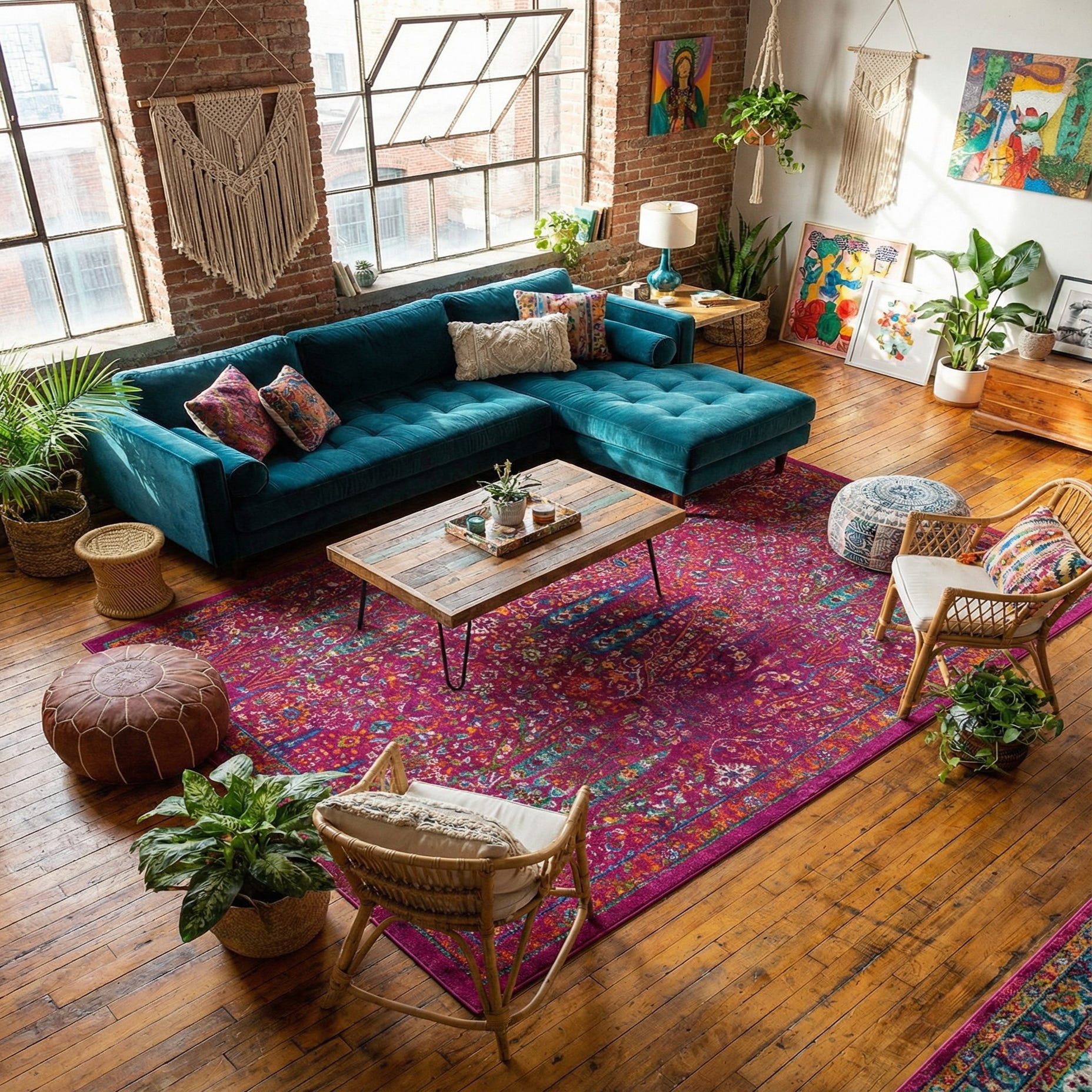 This color-forward piece works well in eclectic and bohemian interiors where layered patterns and bold color are welcome, and it pairs easily with modern glam rooms that use jewel tones and metallic finishes. Use it to anchor a living room seating area beneath a low-profile sofa and coffee table, add vibrant contrast at the foot of a bed, or warm a creative home office. Balance the saturated pink with ivory textiles and navy accents, or lean into the palette with orange and green accessories for a lively, coordinated look.