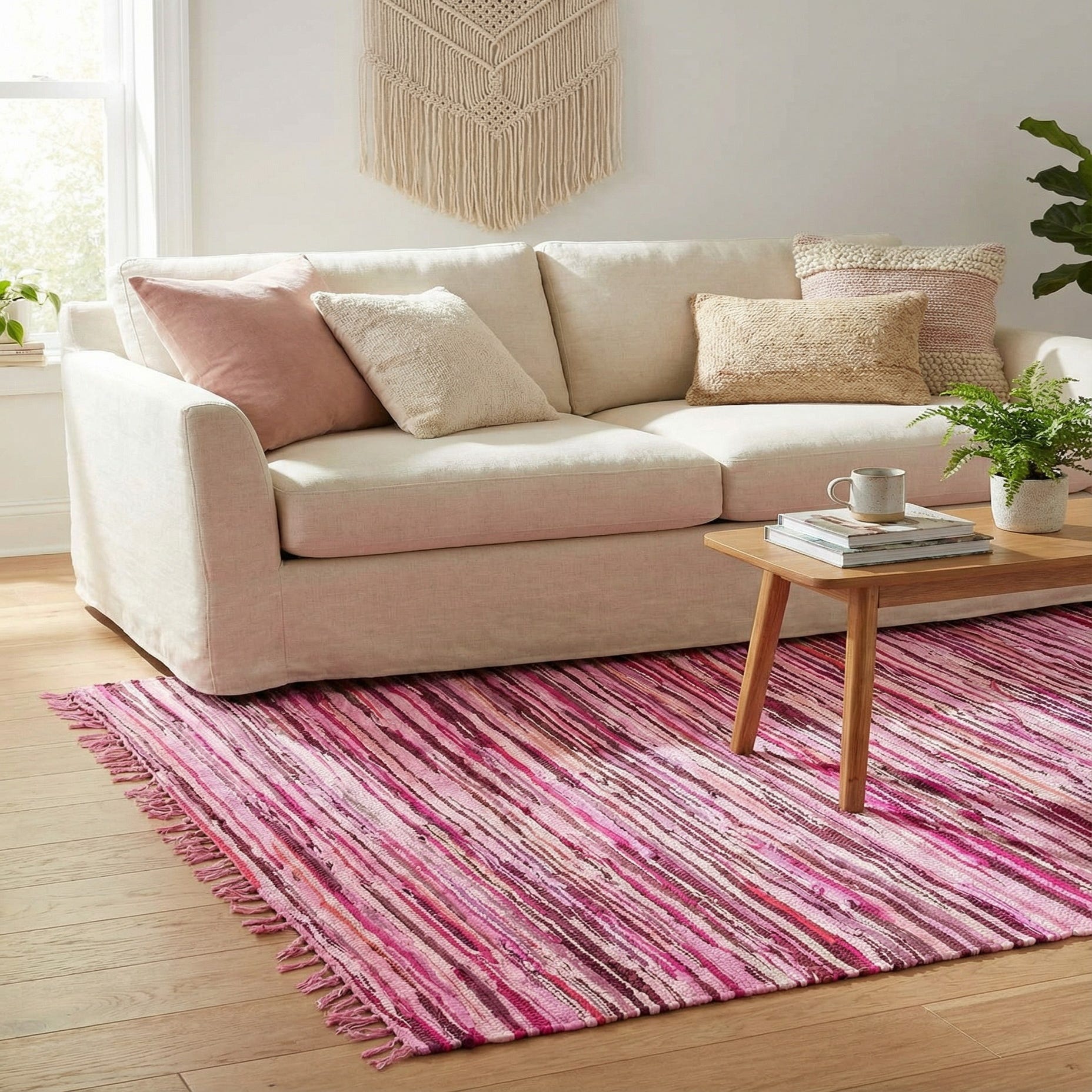 Hand-woven from 90% cotton and 10% polyester, this flatwoven rug presents a banded, horizontal stripe pattern on a pink ground. Narrow strips of burgundy, ivory and purple run across the surface, creating a lively, textured stripe with subtle variations in thickness and color. The weave feels slightly ribbed and tactile underfoot, with the cotton strips giving a soft, lived-in texture and short fringe at the ends for a casual, handcrafted look.
