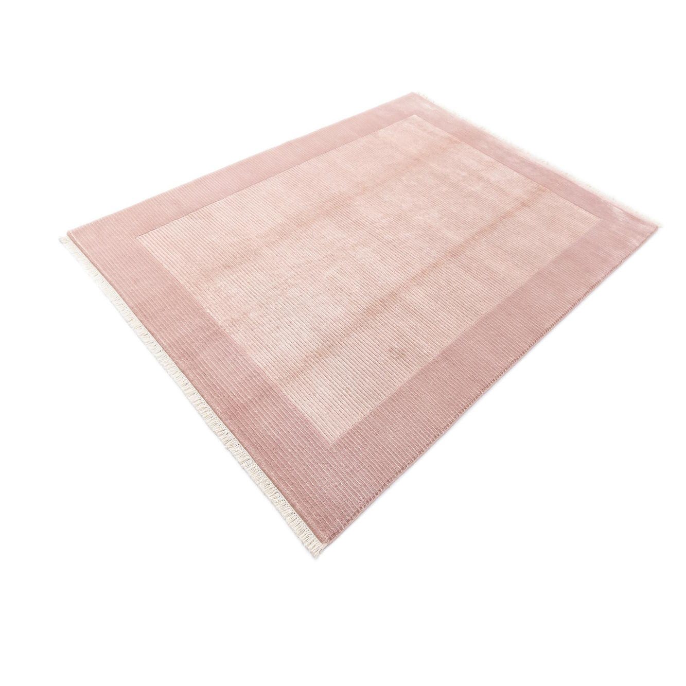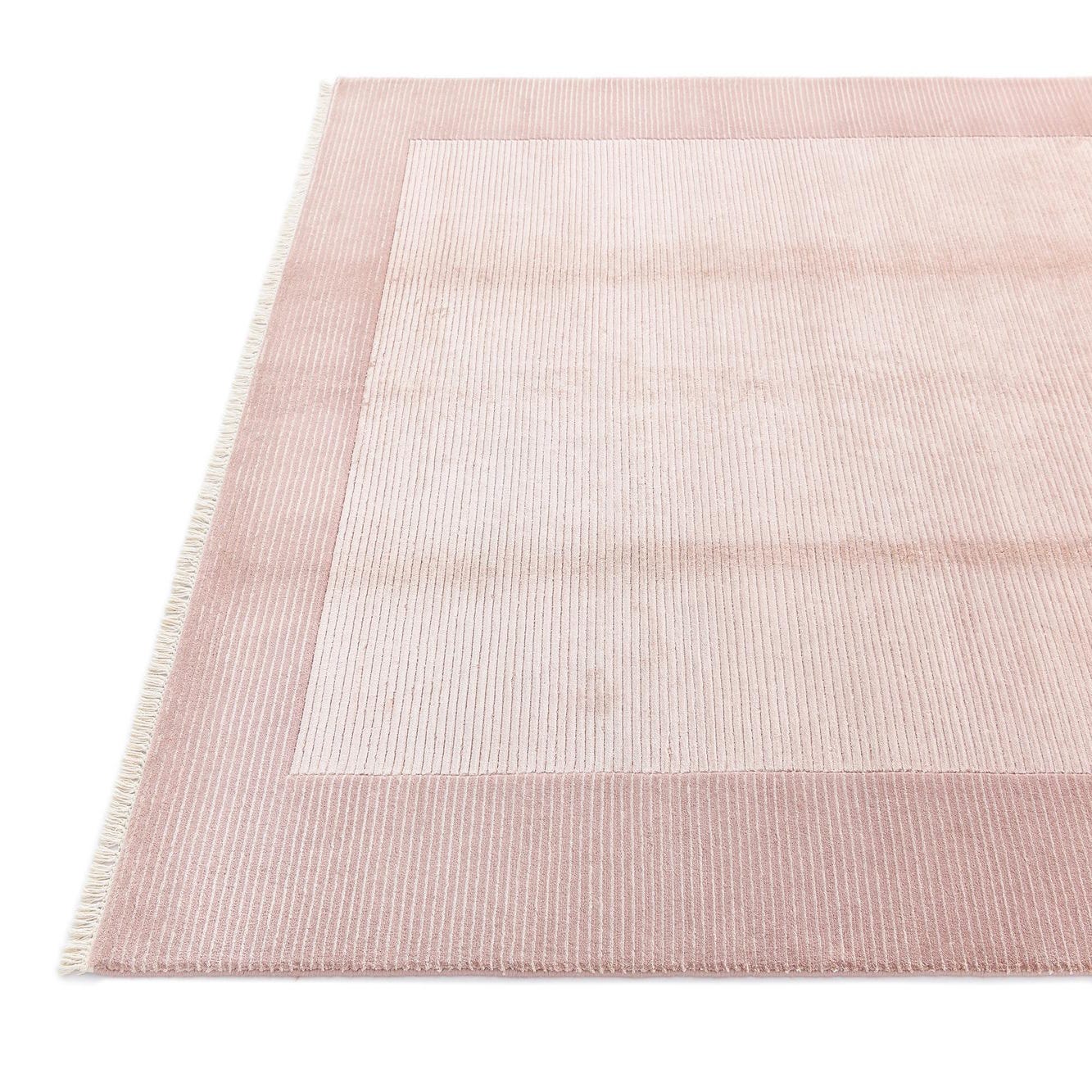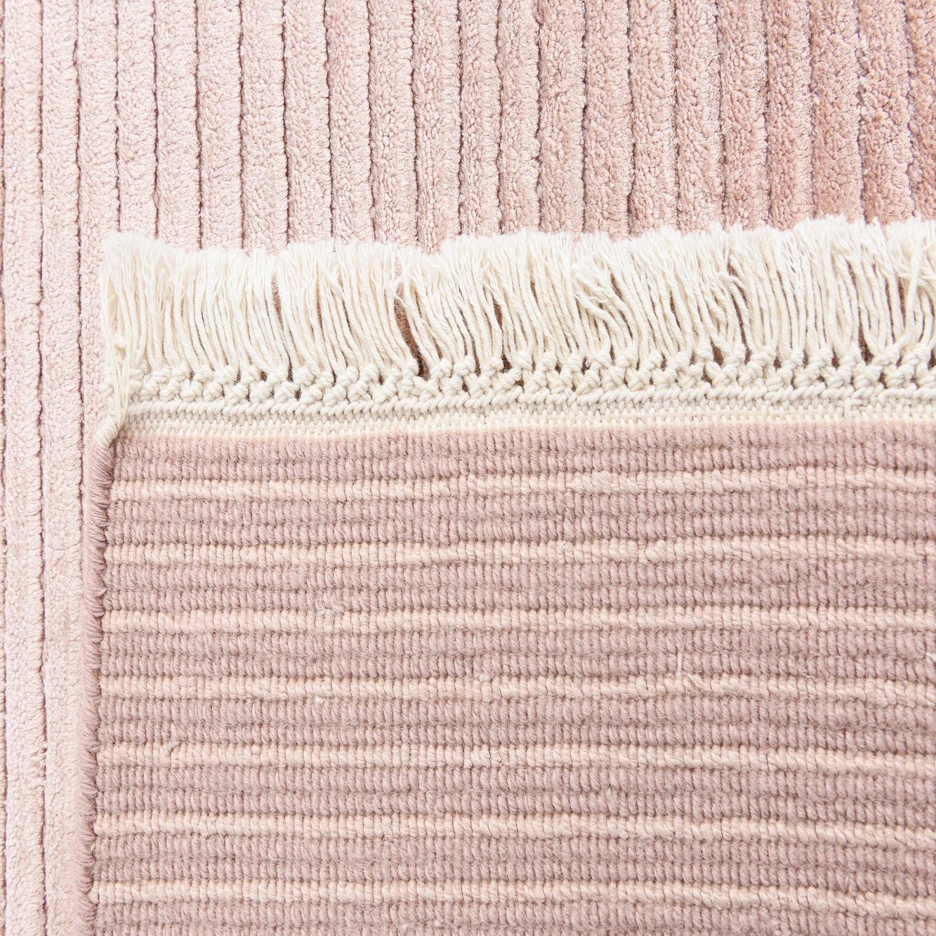 A soft, tonal field in warm pink forms the backdrop for a subtle linear pattern worked in light salmon and peach. Narrow, closely spaced ribs run across the central panel, giving the surface a gentle striated effect, while a slightly deeper pink border with matching horizontal accents frames the piece and adds quiet definition. Short fringe at the ends provides a handcrafted finish that complements the rug’s simple, contemporary geometry.