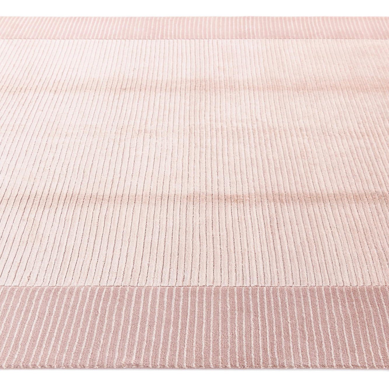 Hand-made of wool and cotton, the rug offers a tactile mix of soft pile and structured weave—pleasant underfoot with a low-profile texture that layers well in a room. It works well beneath a low coffee table in a living room, as a soft landing beside a bed, or layered in a calm, feminine dressing area. Pair it with warm wood tones, brass or matte metal accents, and neutral upholstery for an understated, modern look, or use it to introduce a gentle blush tone to a Scandinavian or mid-century inspired space.