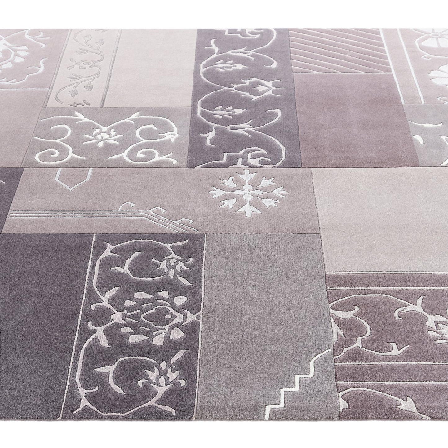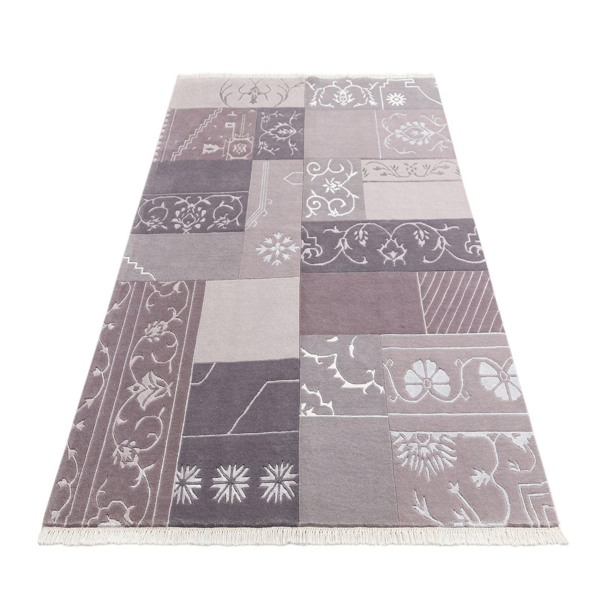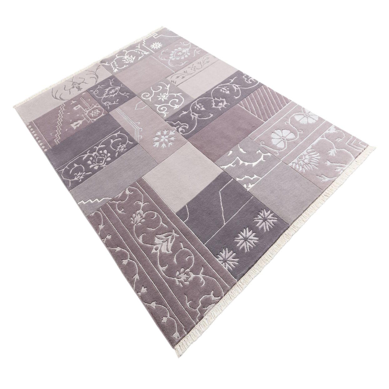 A rectangular 5x8 Darya rug featuring a modern patchwork of pink and purple shades with various Persian-inspired patterns.