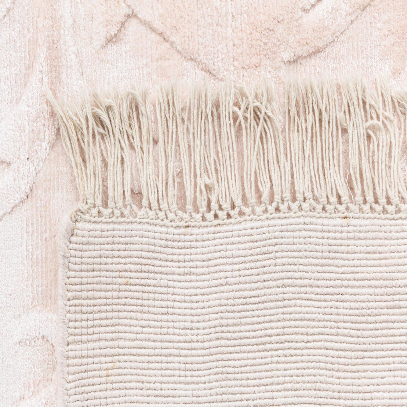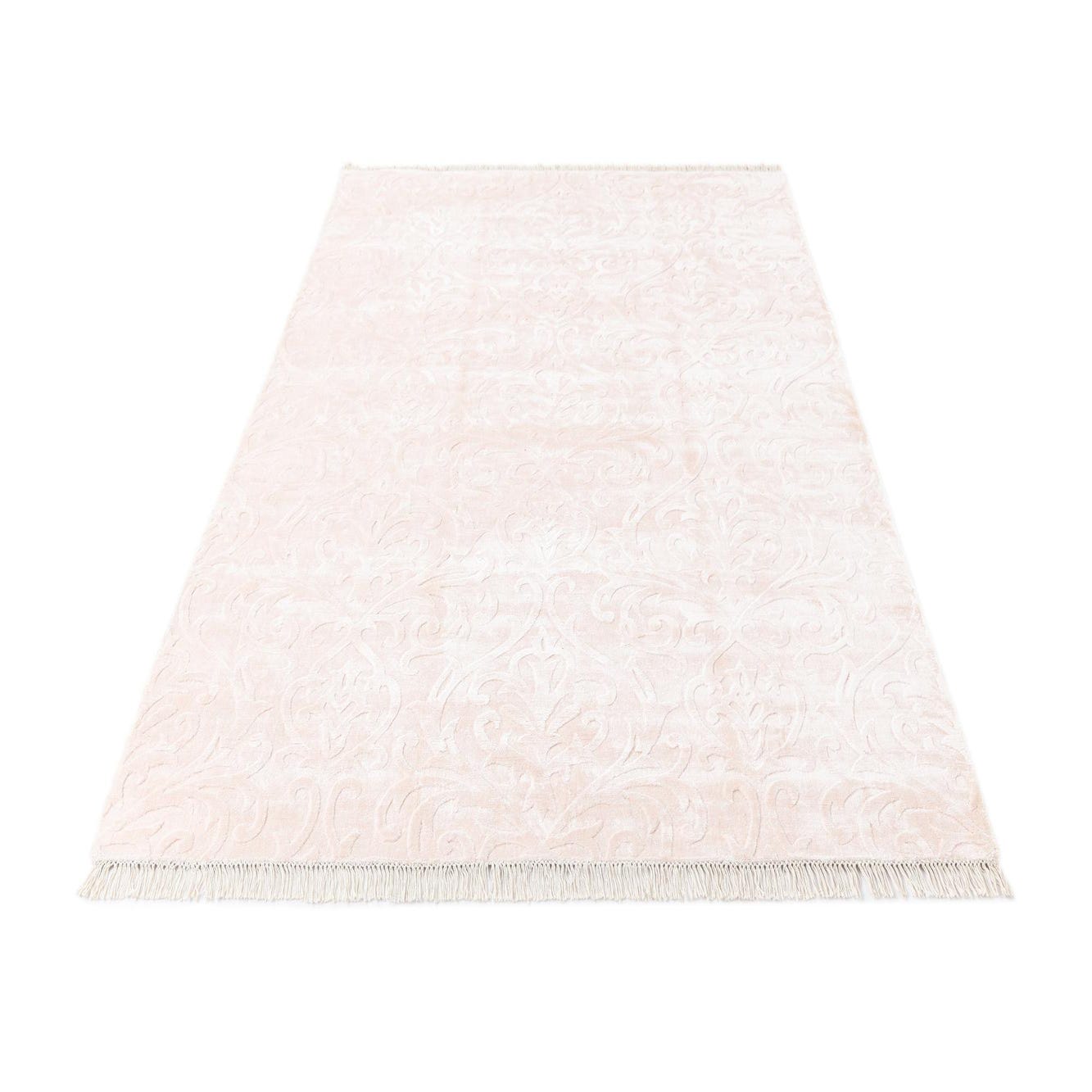 A 5x8 rectangular Darya rug in soft pink with a subtle raised modern Persian pattern and delicate fringe.