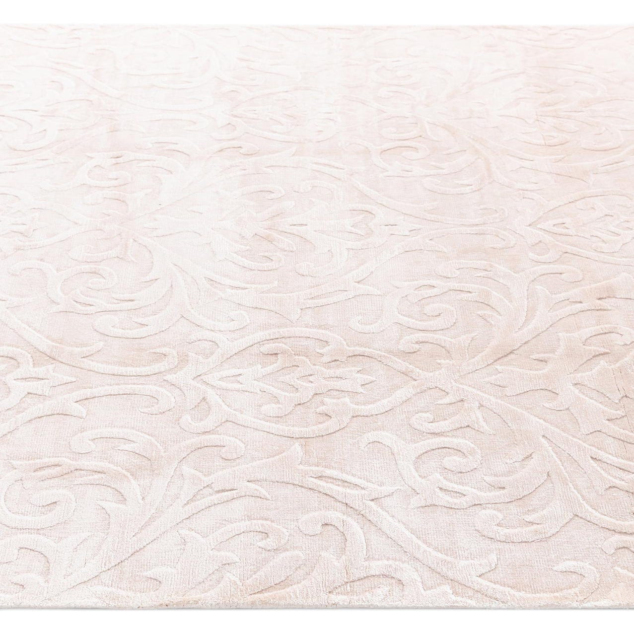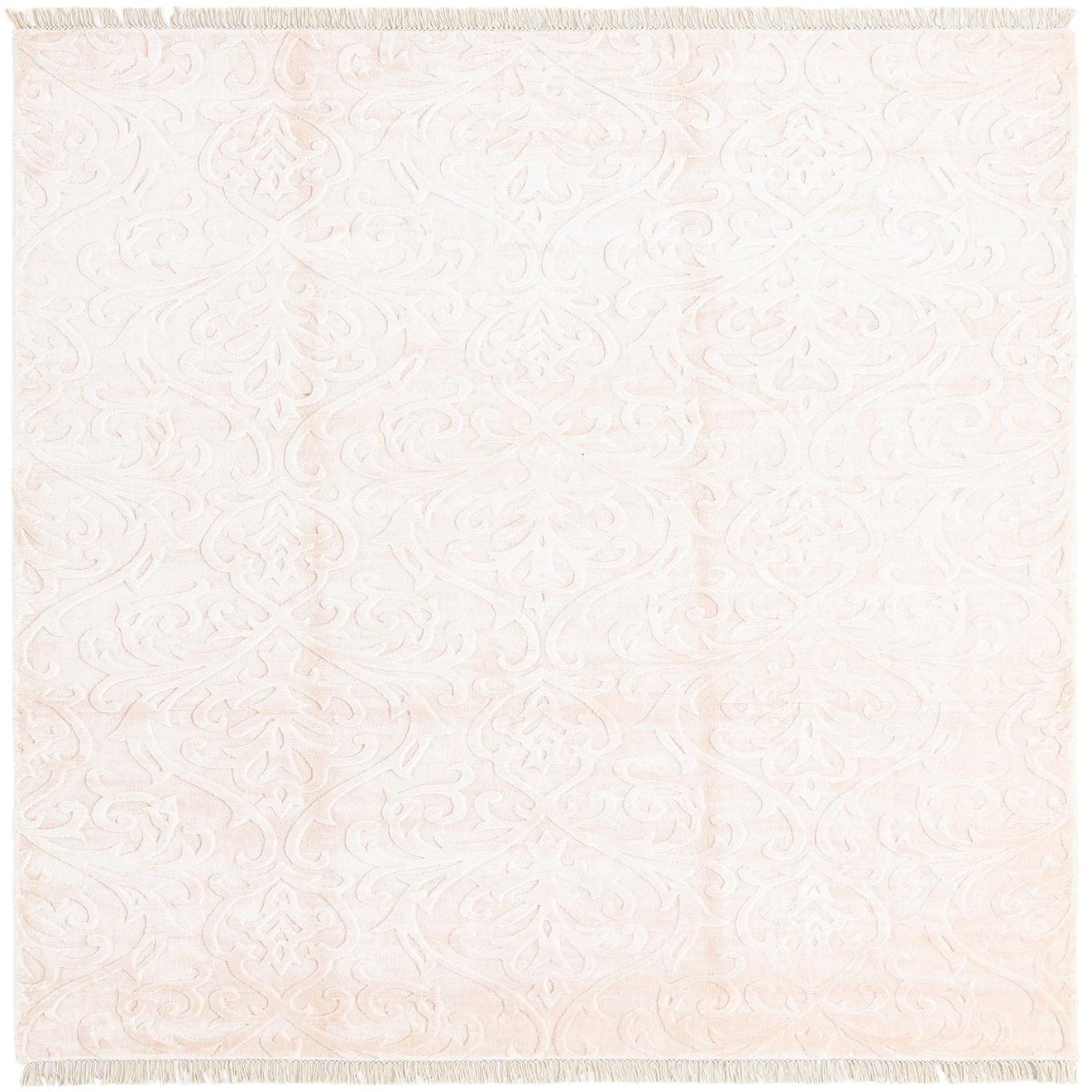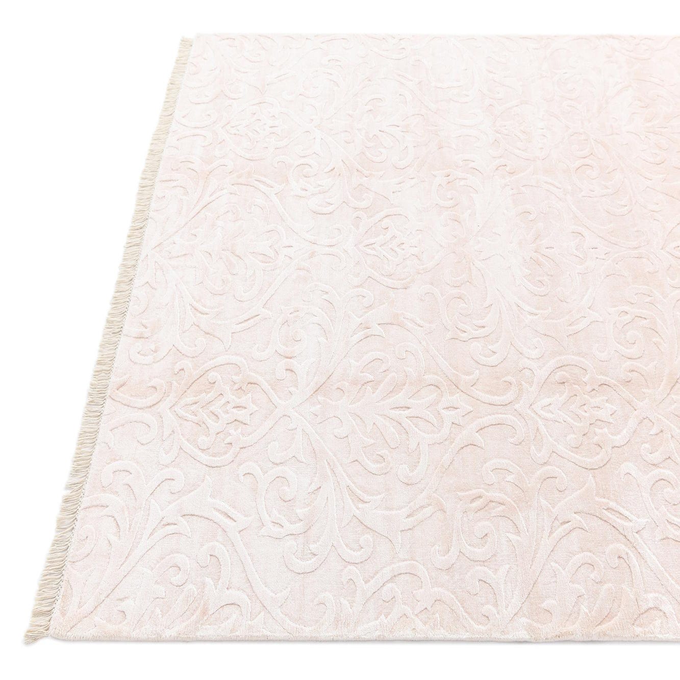 The Darya collection presents a 5x8 hand-made rug that embodies elegance through a soft and sophisticated design. Crafted from a blend of wool and cotton materials, the rug's texture offers a lush and comfortable underfoot experience that is both durable and long-lasting. Featuring a pattern of subtle, raised damask motifs across its surface, the design imparts a sense of traditional charm with a modern twist. The color palette is composed of a gentle pink background with nuanced accents in light salmon, lending a muted yet warm atmosphere to any room.