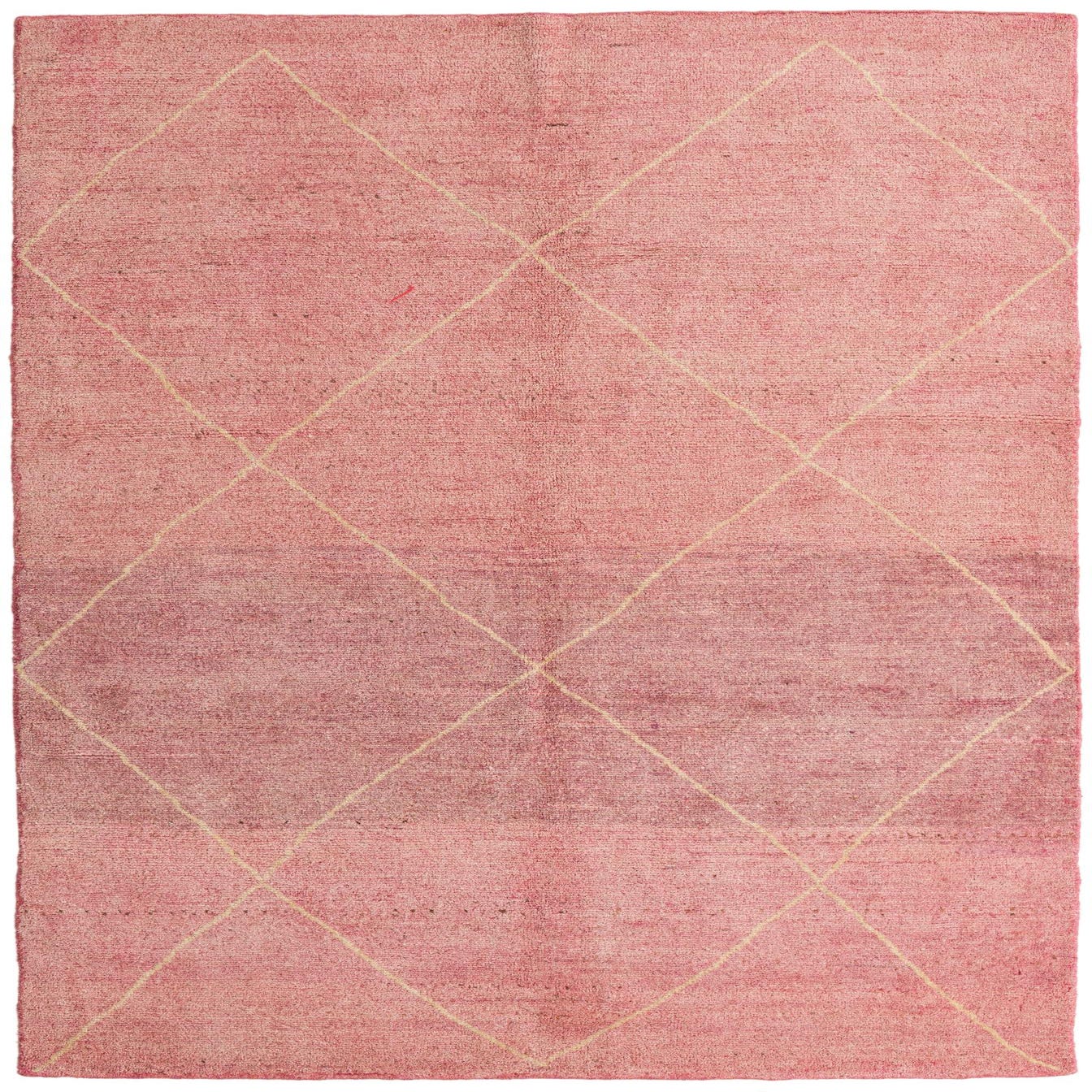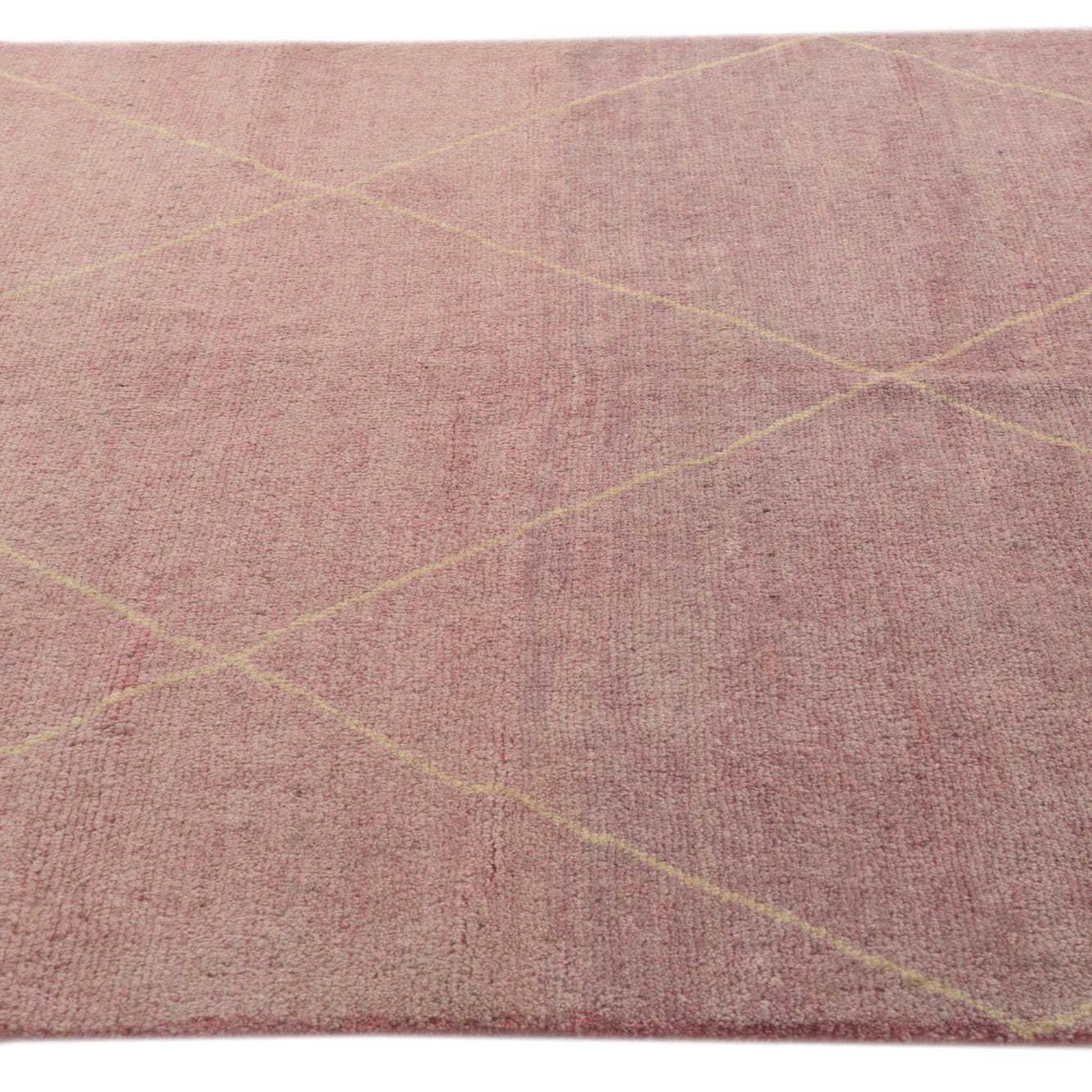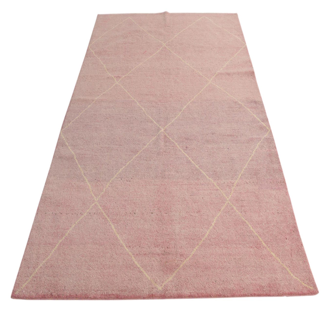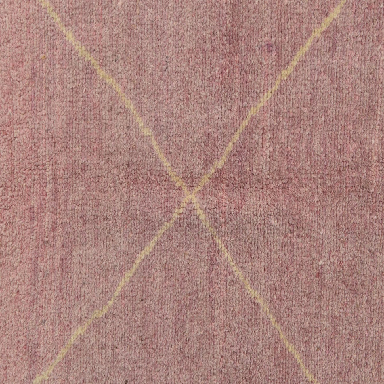 The Darya collection presents a sophisticated 5x8 hand-knotted rug crafted from 100% wool. This piece showcases a minimalist design featuring an overdyed pink background that carries a suggestion of classic style while firmly rooting itself in contemporary aesthetics. Contrasting the vibrant pink are understated ivory lines that form a simple yet elegant diamond pattern across the surface, offering a subtle geometric appeal.