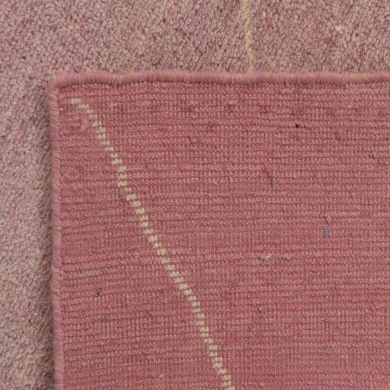 The rug displays a variety of pink hues, imbuing it with dynamic texture and visual depth. Its wool construction ensures a soft feel underfoot and provides the durability expected of hand-knotted craftsmanship. The texture not only adds to the tactile experience but also introduces a layer of interest to an otherwise spacious, unadorned surface.