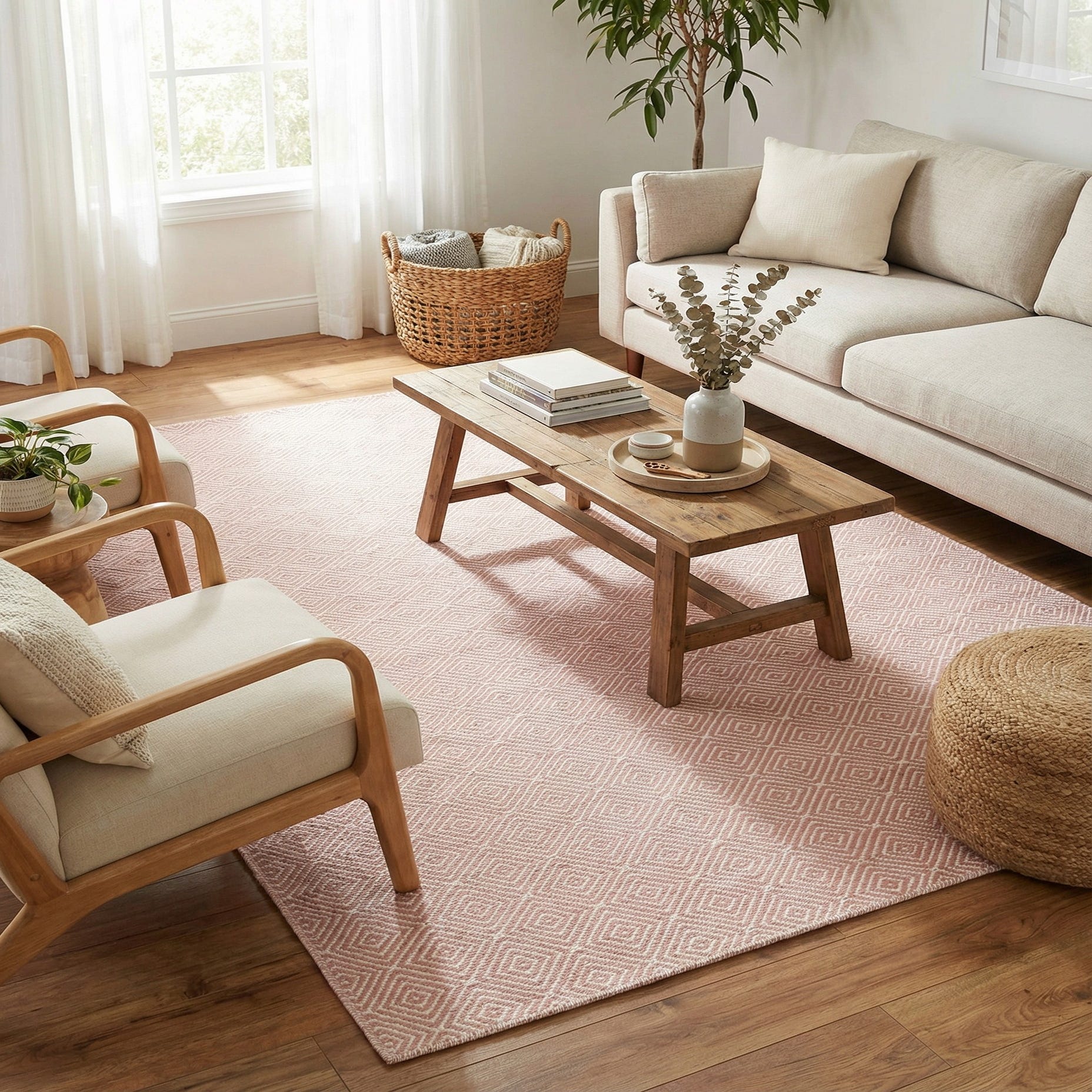 A 5x8 rectangular pink flatweave rug with a repeating white geometric trellis pattern, suitable for a modern living room.