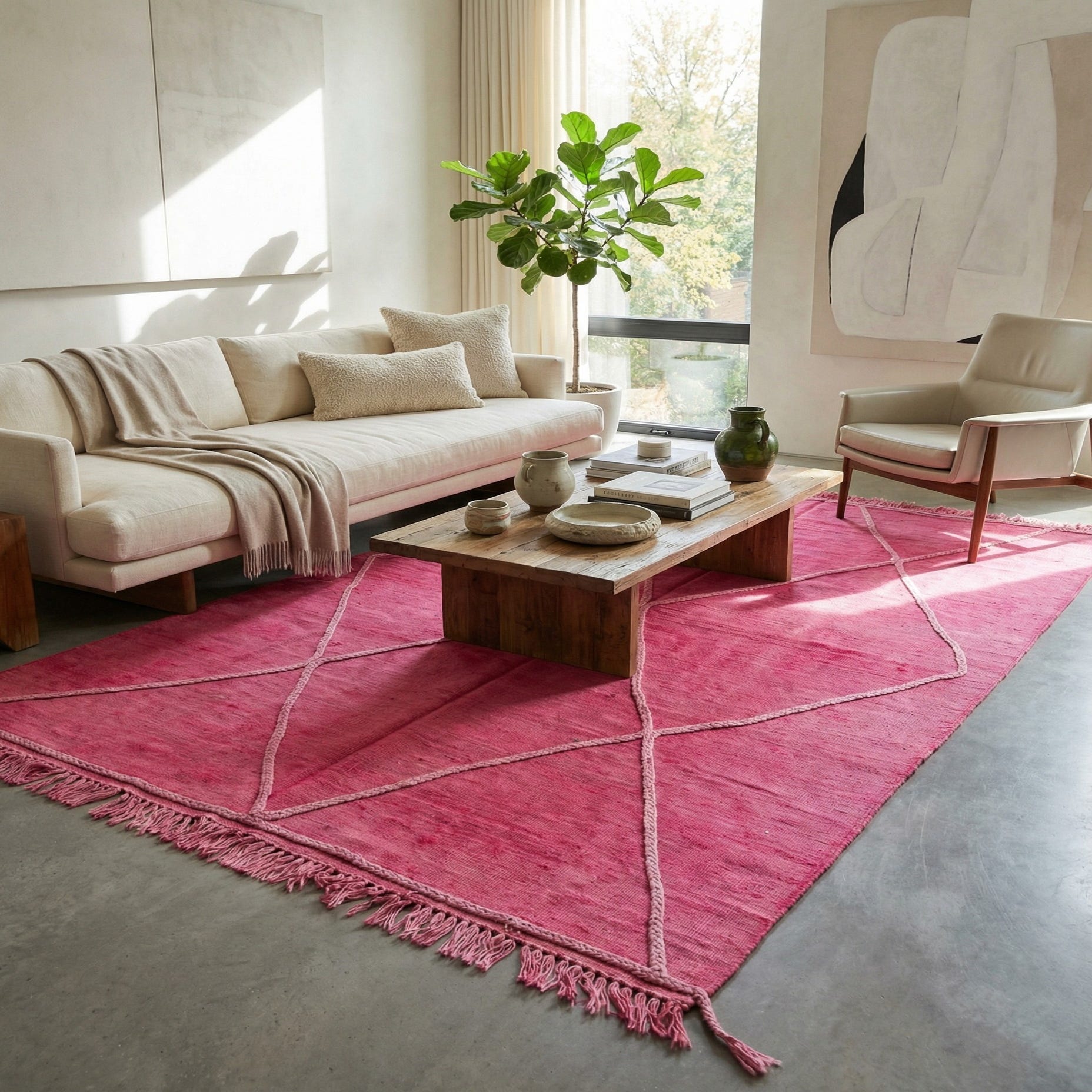 A vibrant 5x8 rectangular pink flatweave rug with a light pink diamond tribal pattern and fringe.