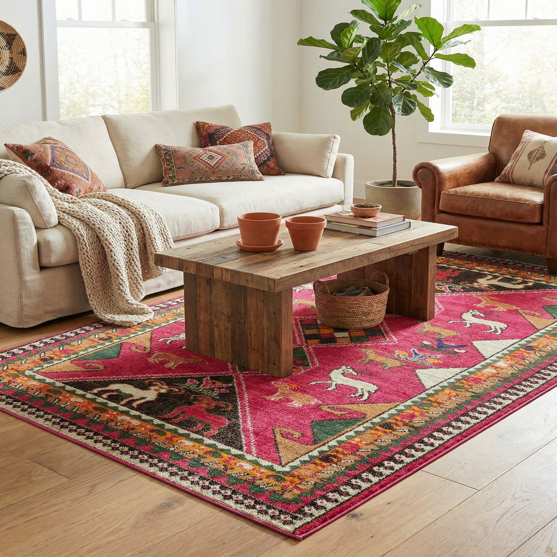 The surface has a low, dense pile that feels soft underfoot with a subtle, cushioned hand typical of machine-made construction. Made of 100% polypropylene, this rug is well suited for lively living rooms, eclectic or bohemian bedrooms, and entryways where a strong splash of color sets the tone. Pair it with warm wood furniture and neutral upholstery to let the pink and jewel tones stand out, or layer it with woven textiles, rattan pieces and brass accents for a collected, worldly feel.