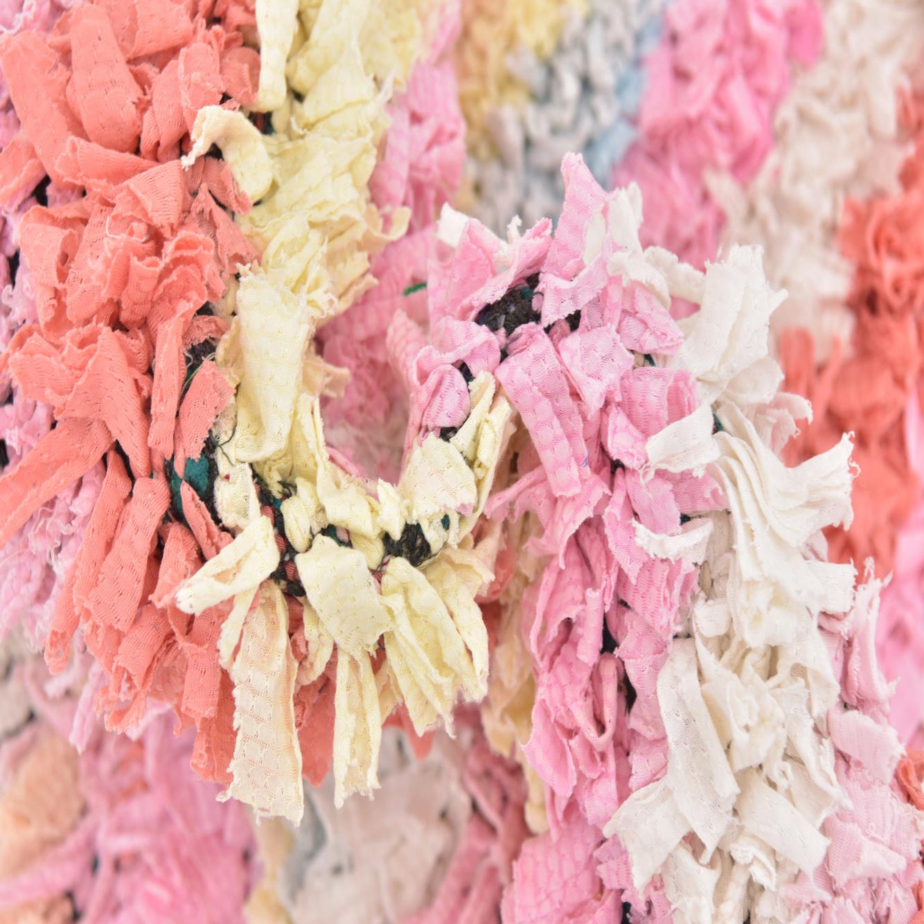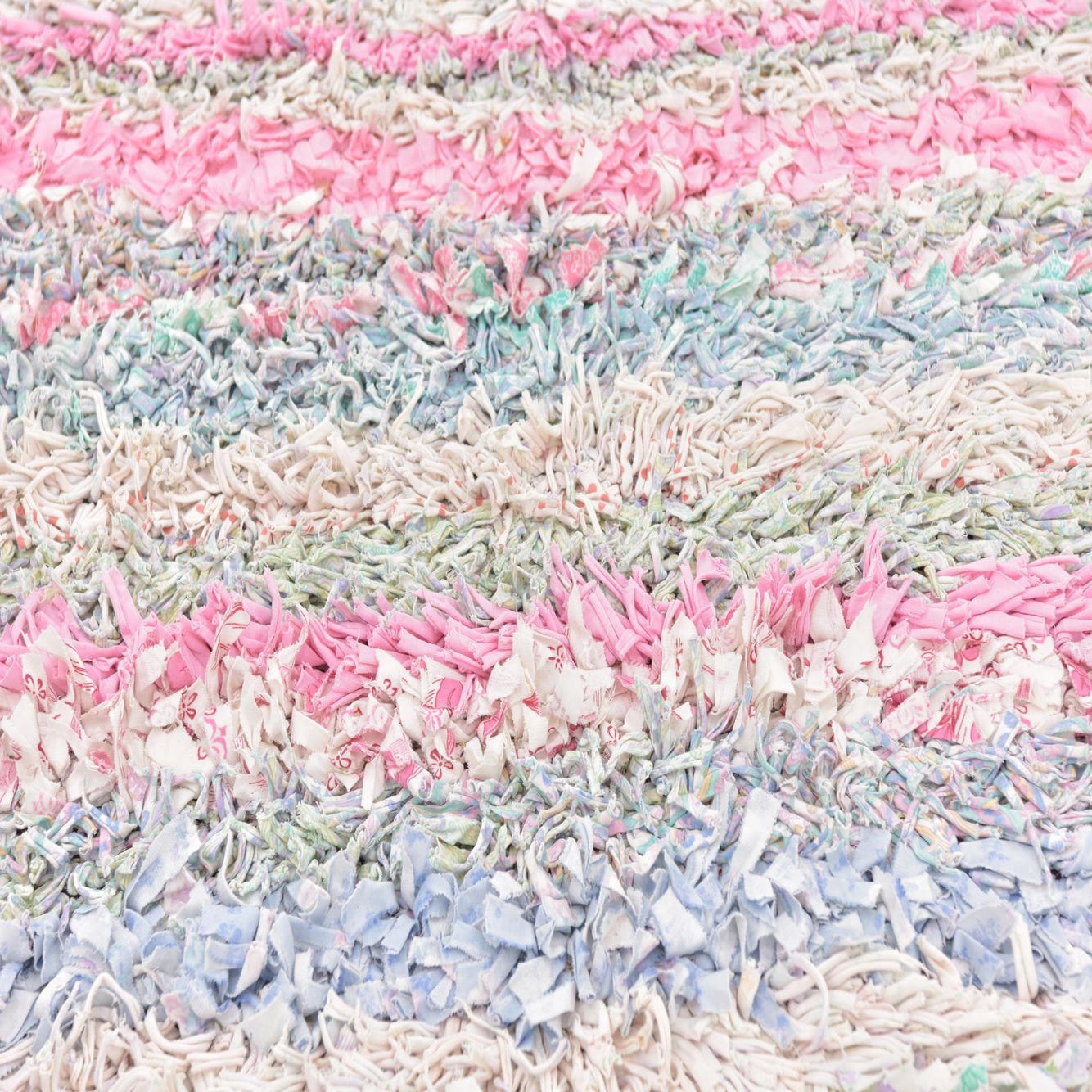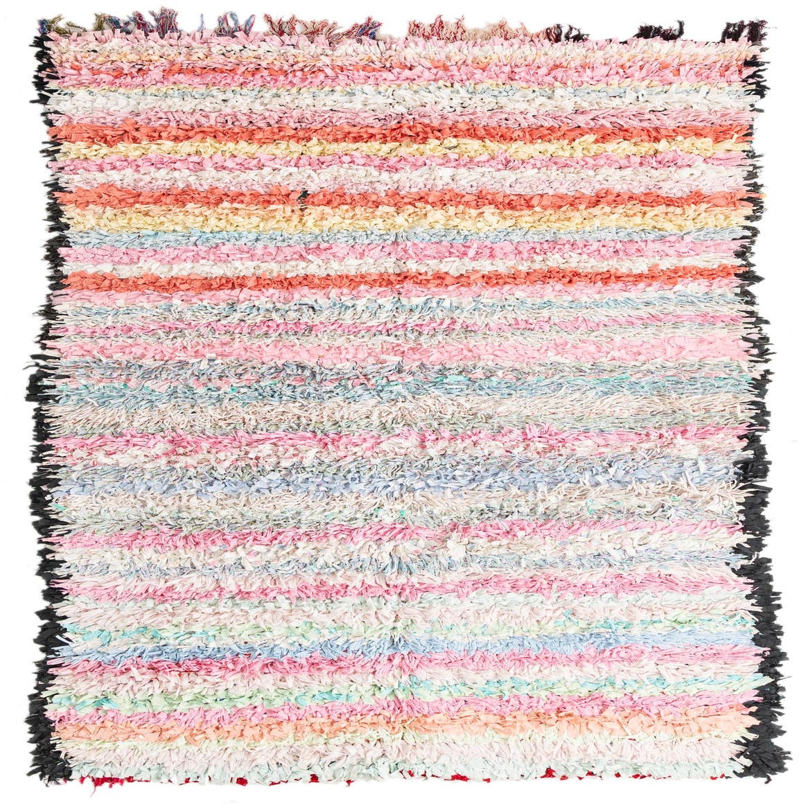 A 5x8 rectangular Moroccan shag rug with horizontal stripes in various pastel pinks, blues, yellows, and whites, framed by dark fringed edges.